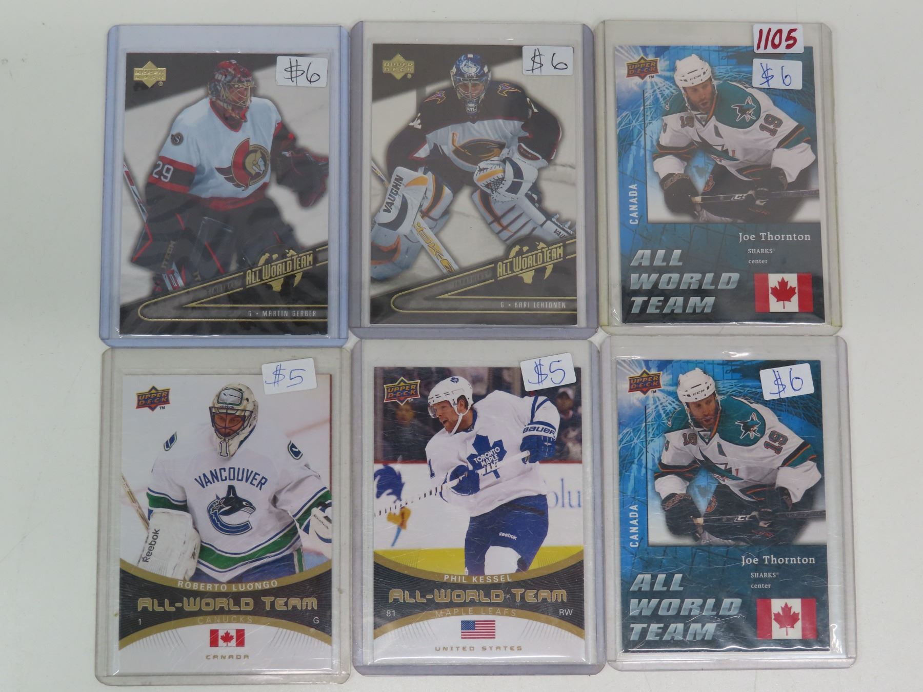 6 assorted "All World Team" series UpperDeck hockey cards - in plastic holders