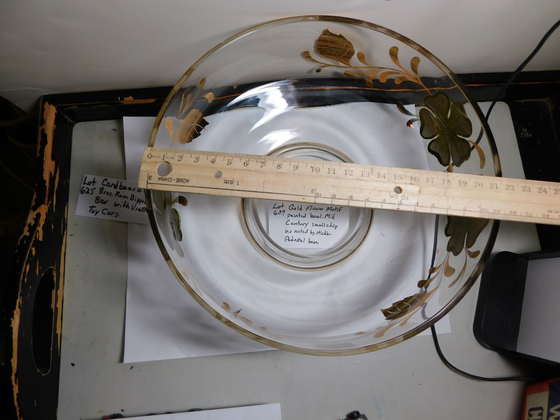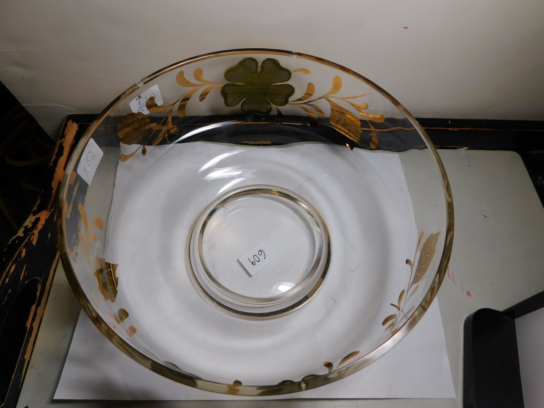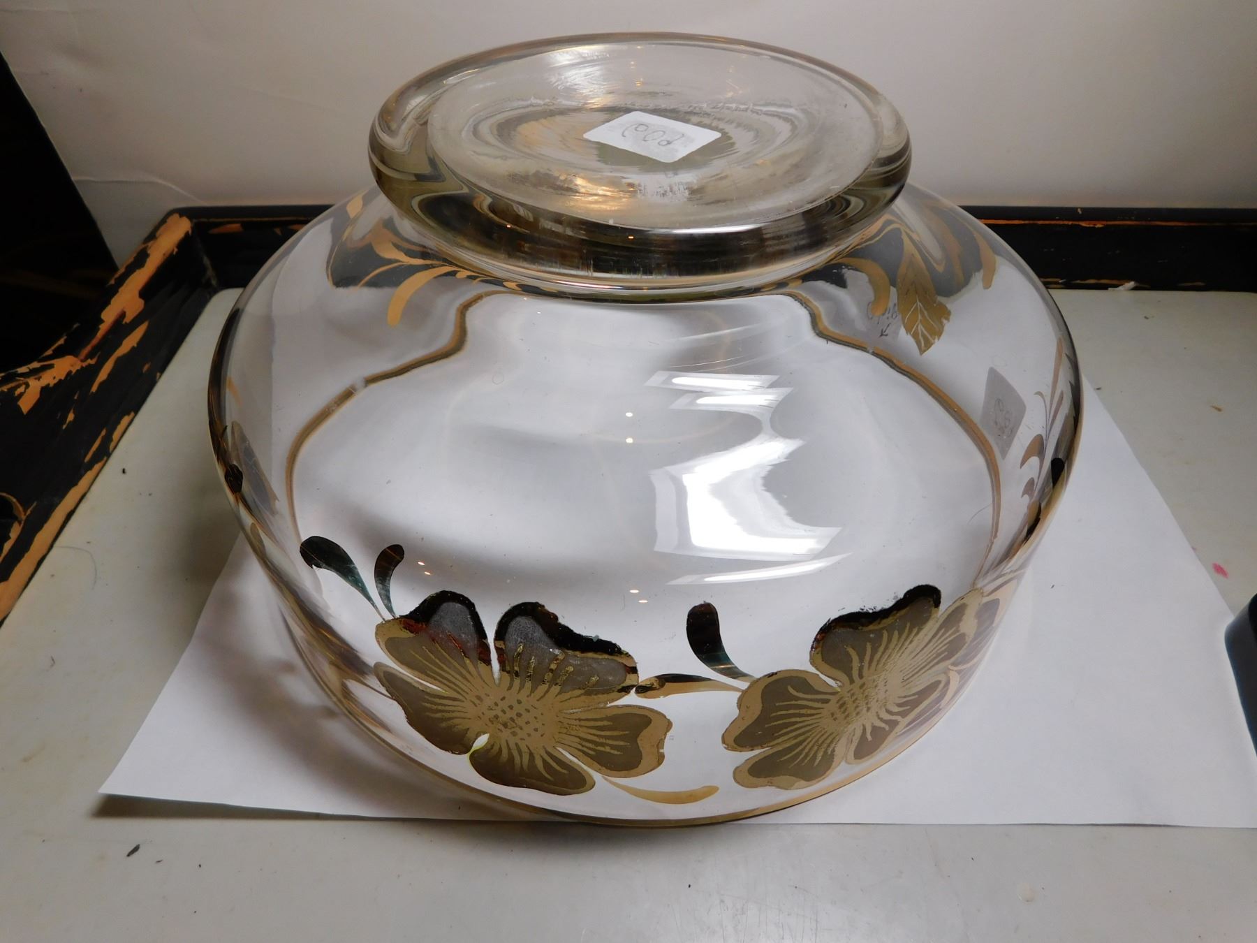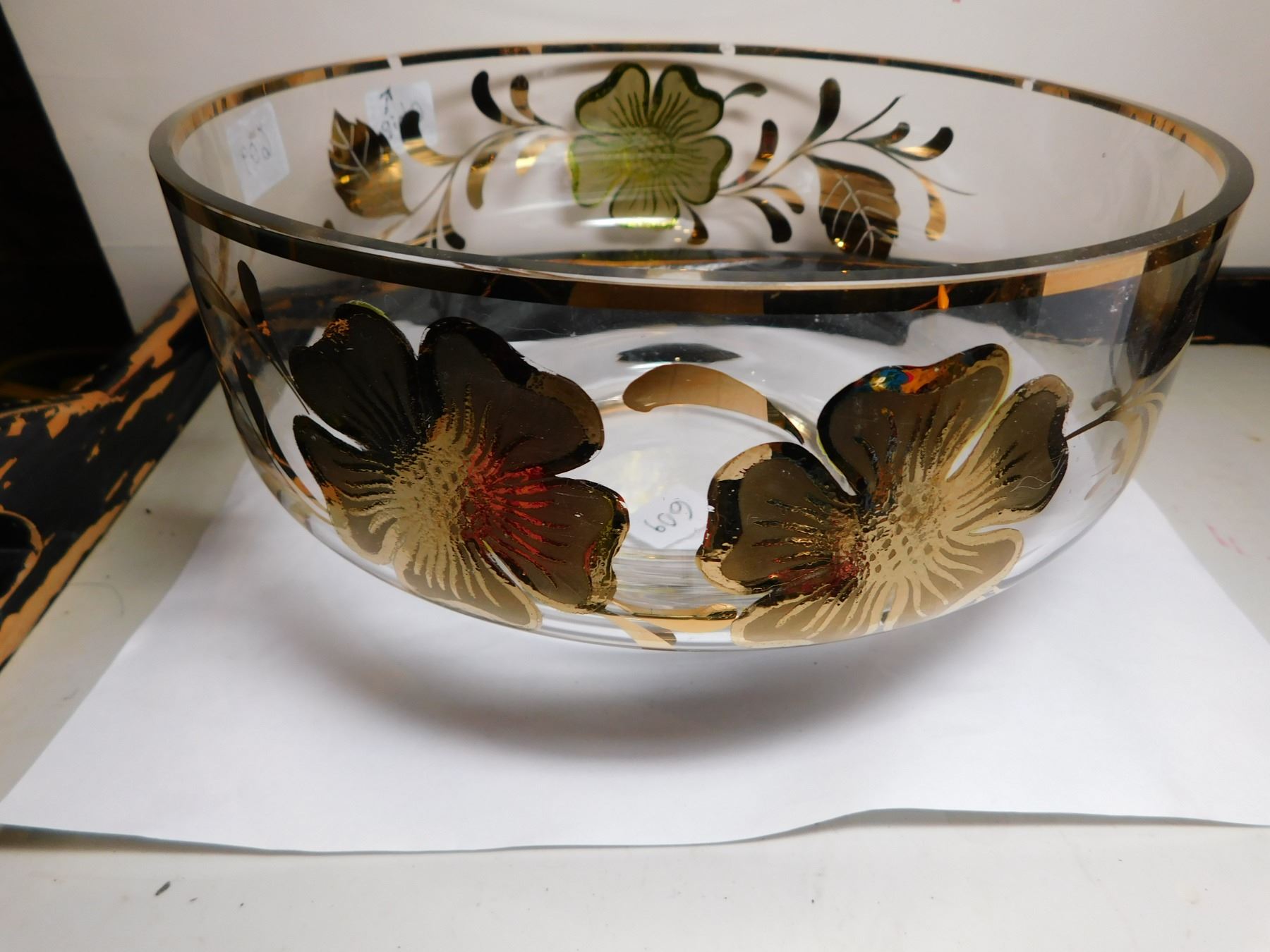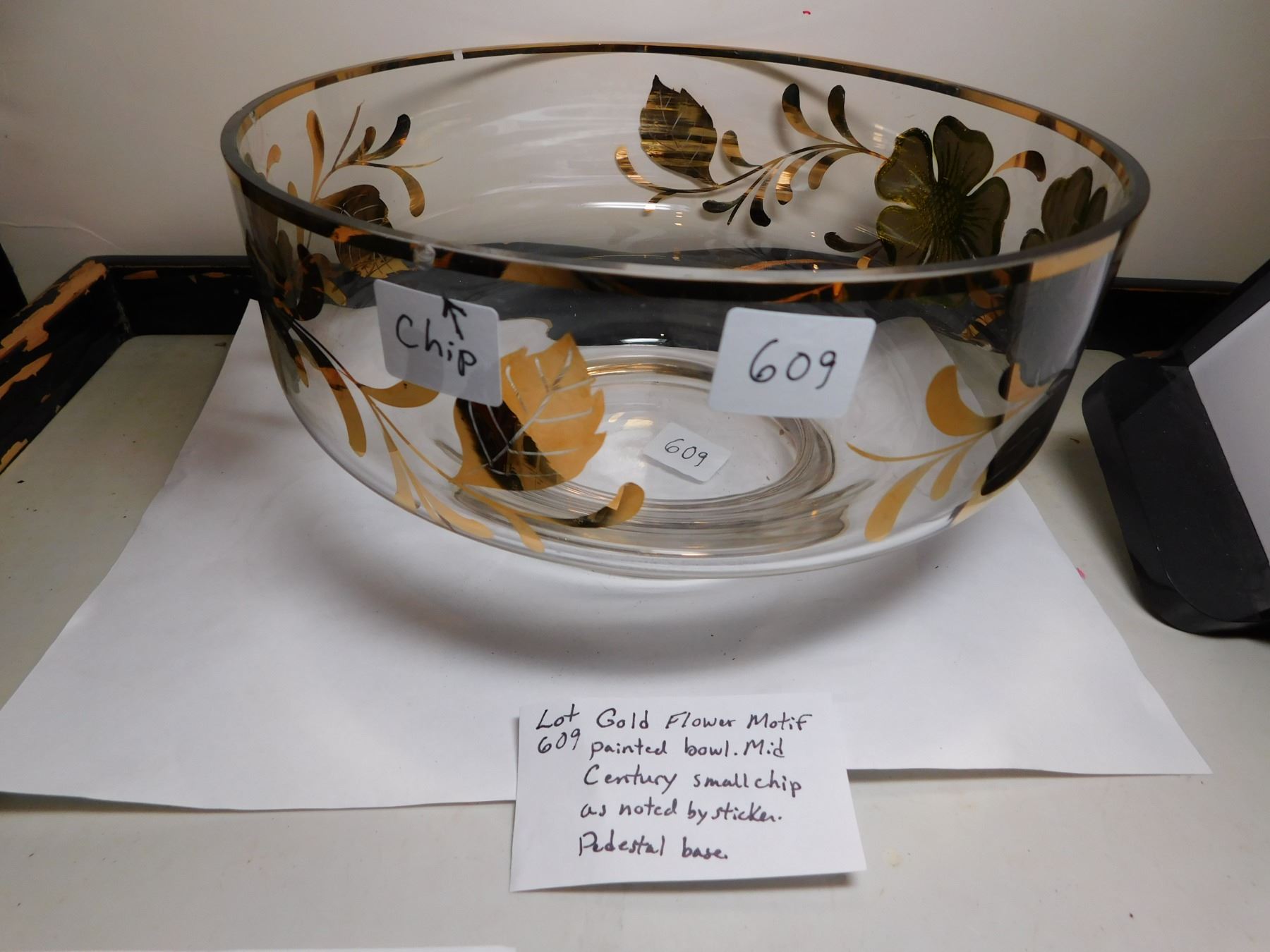 609. Gold flower motif painted bowl MCM small chip in paint noted
