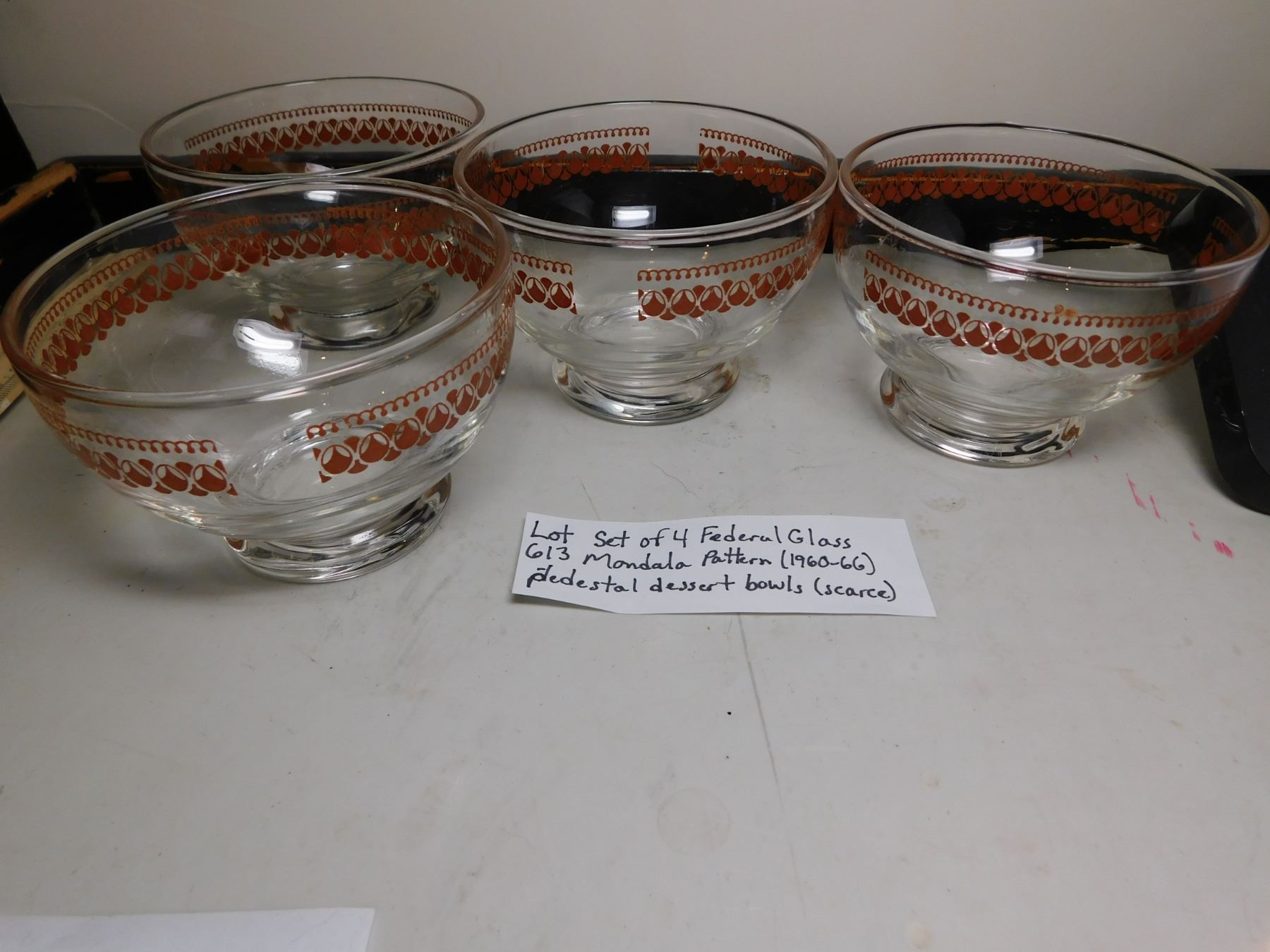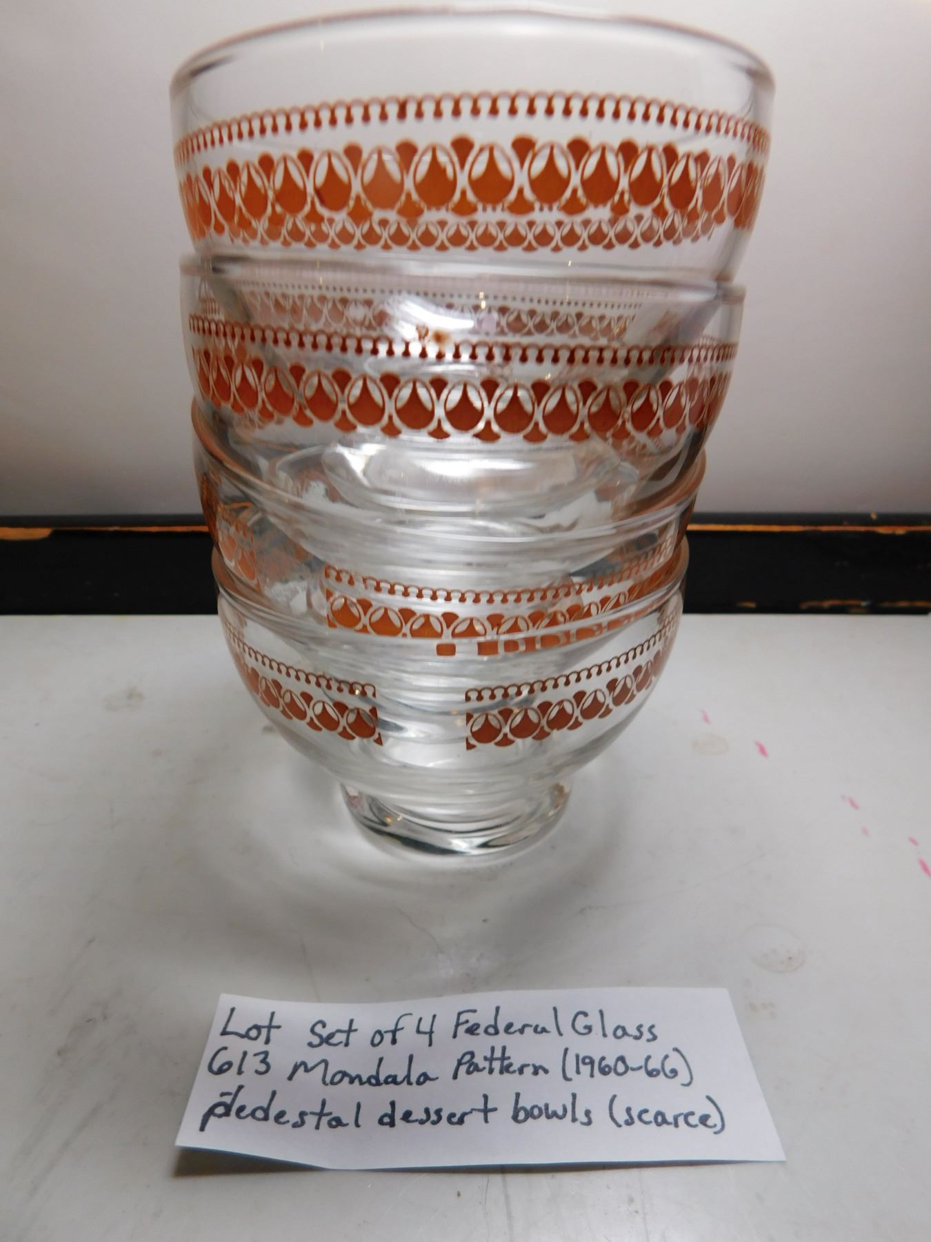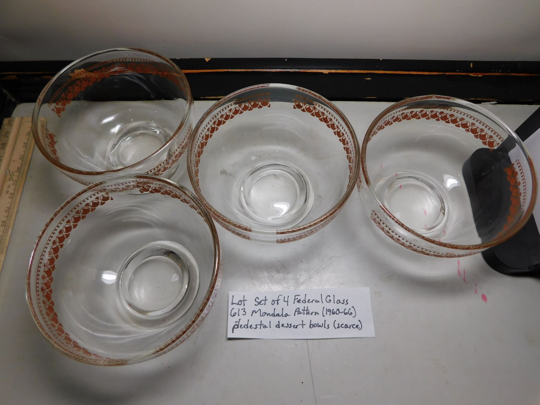 613. scarce set of 4 federal glass mandala pattern nappy pedestal dessert bowls