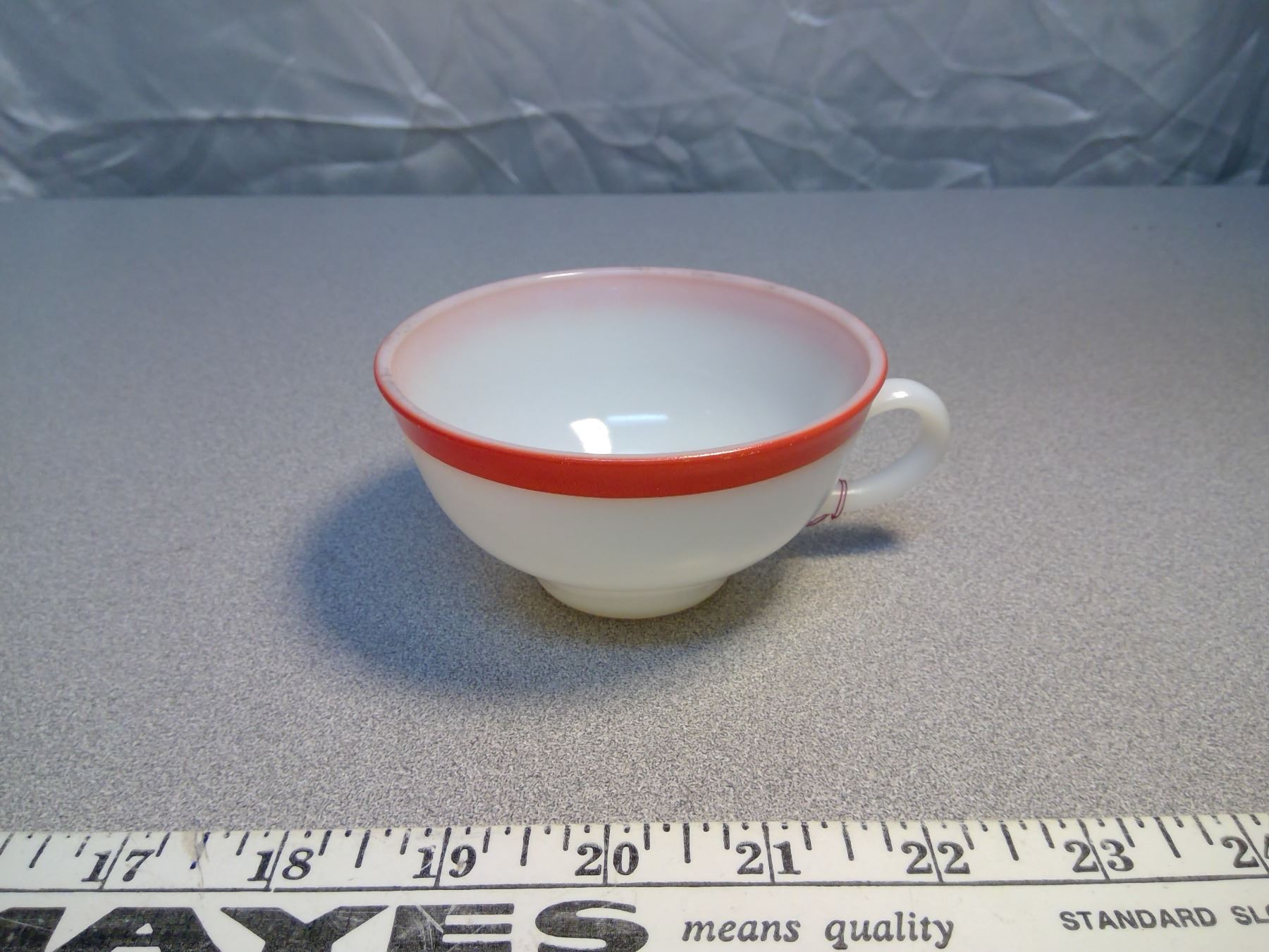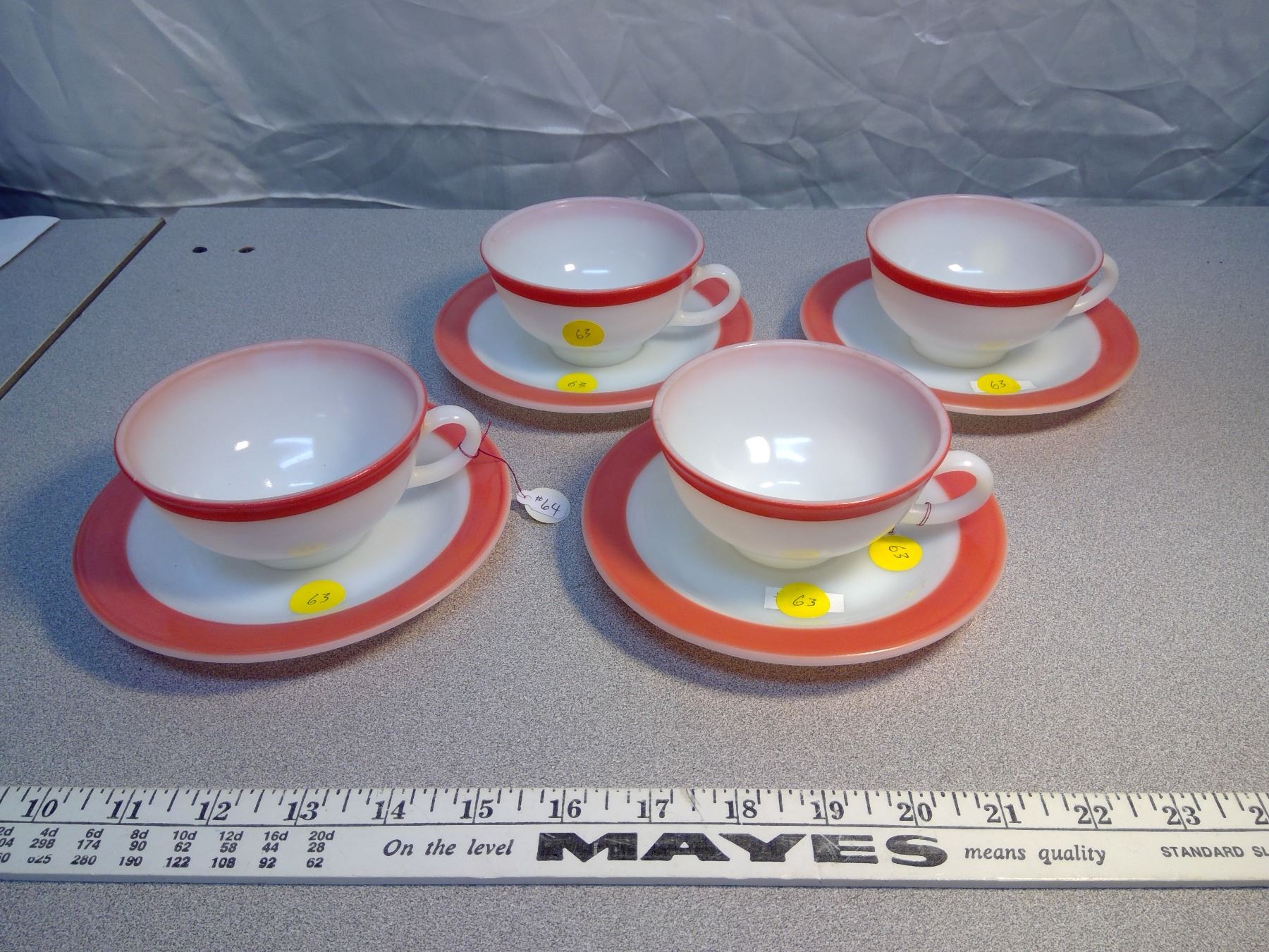 63. Pyrex cups and saucers, Flamingo pink trims (4)