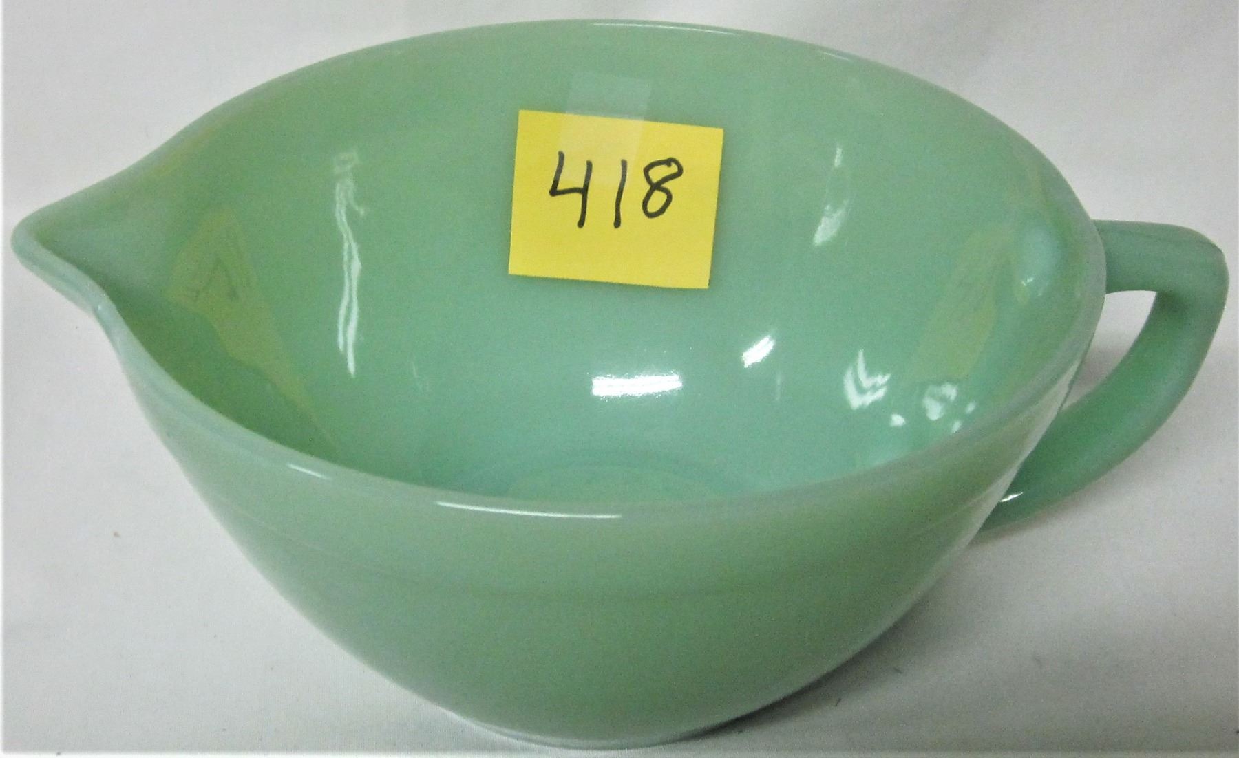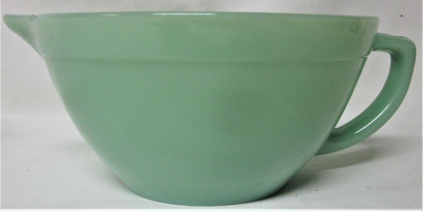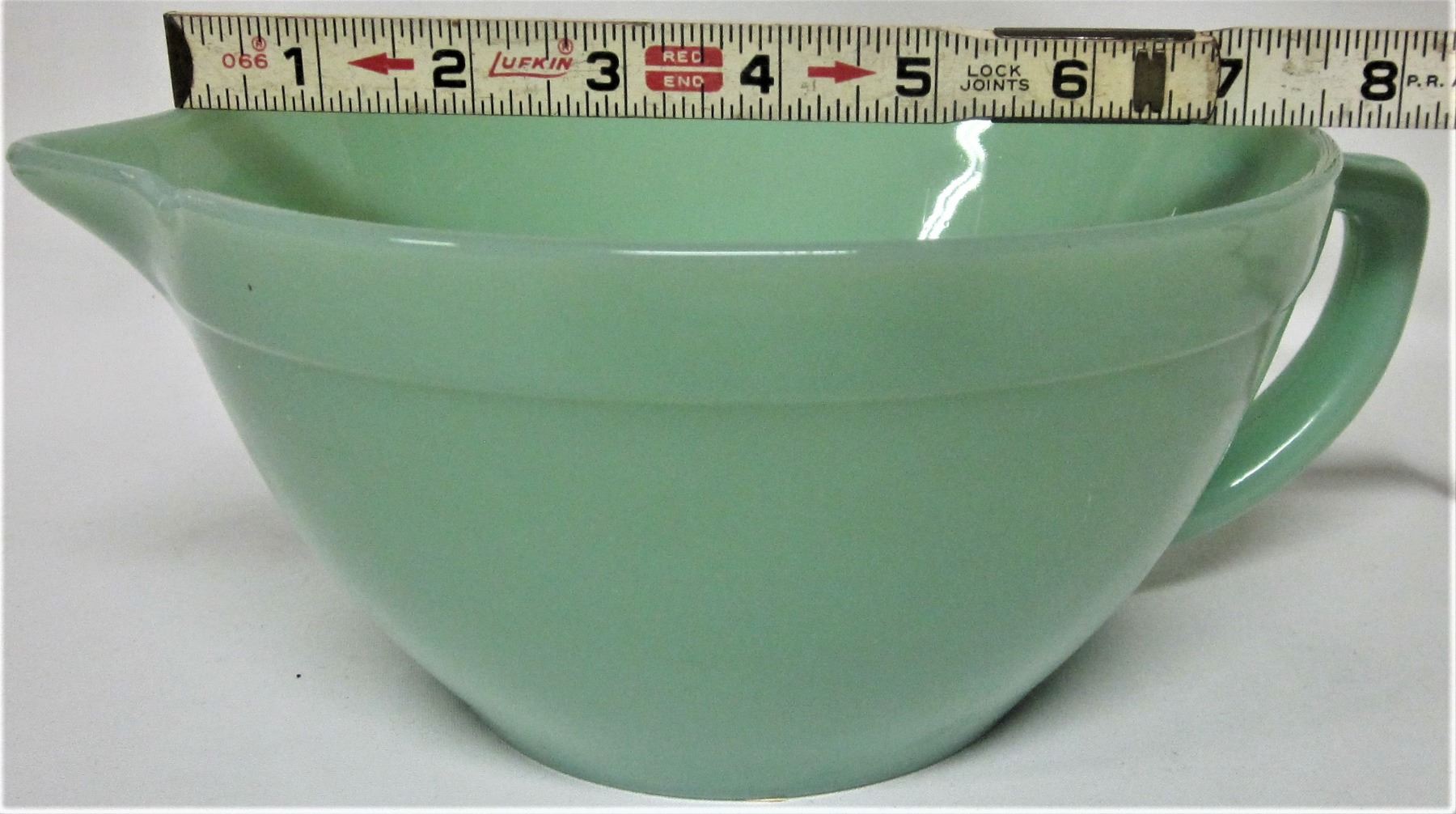 7 1/2" FIRE KING JADITE BATTER BOWL/HANDLE (SMALL CHIP ON RIM)