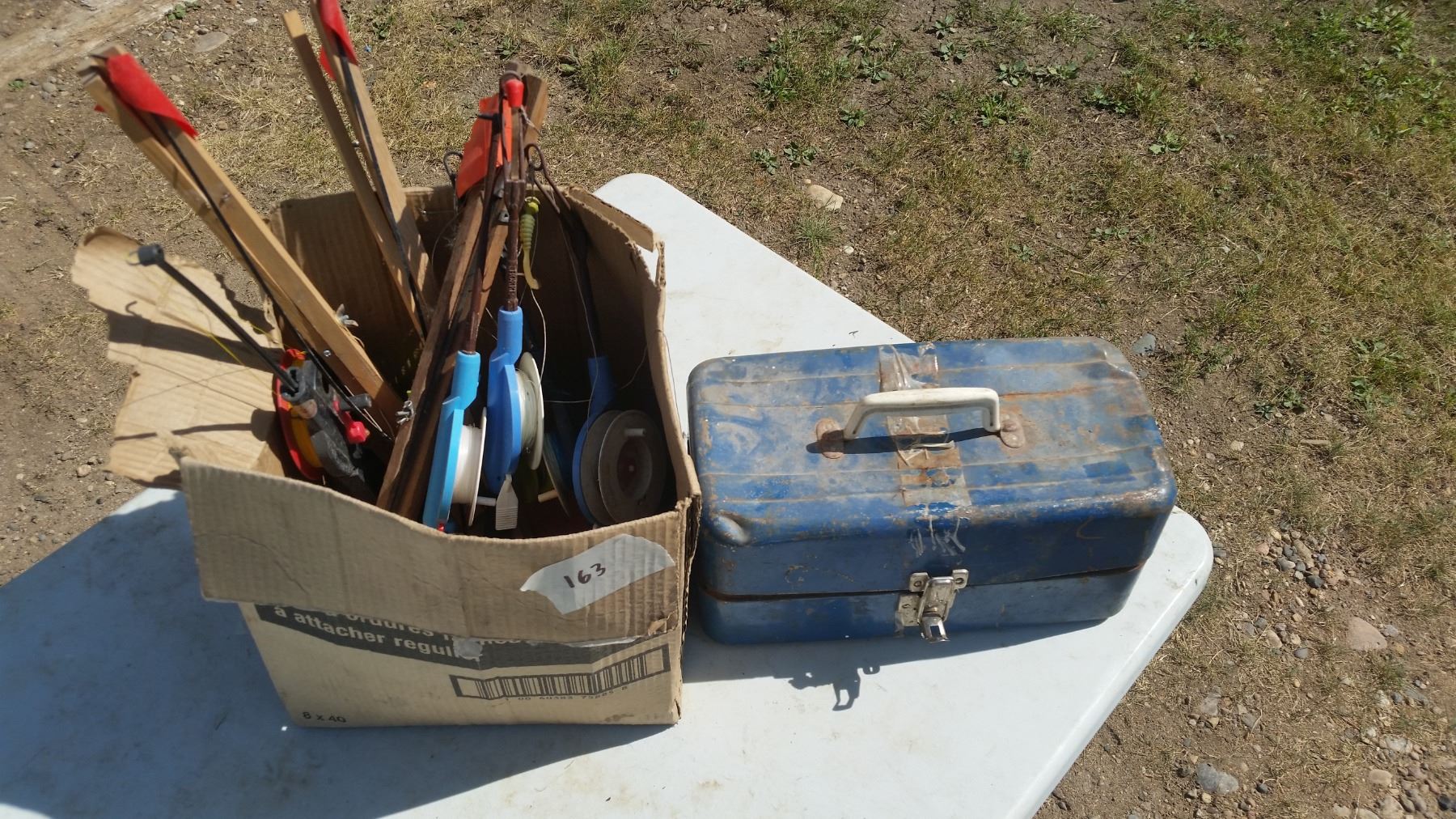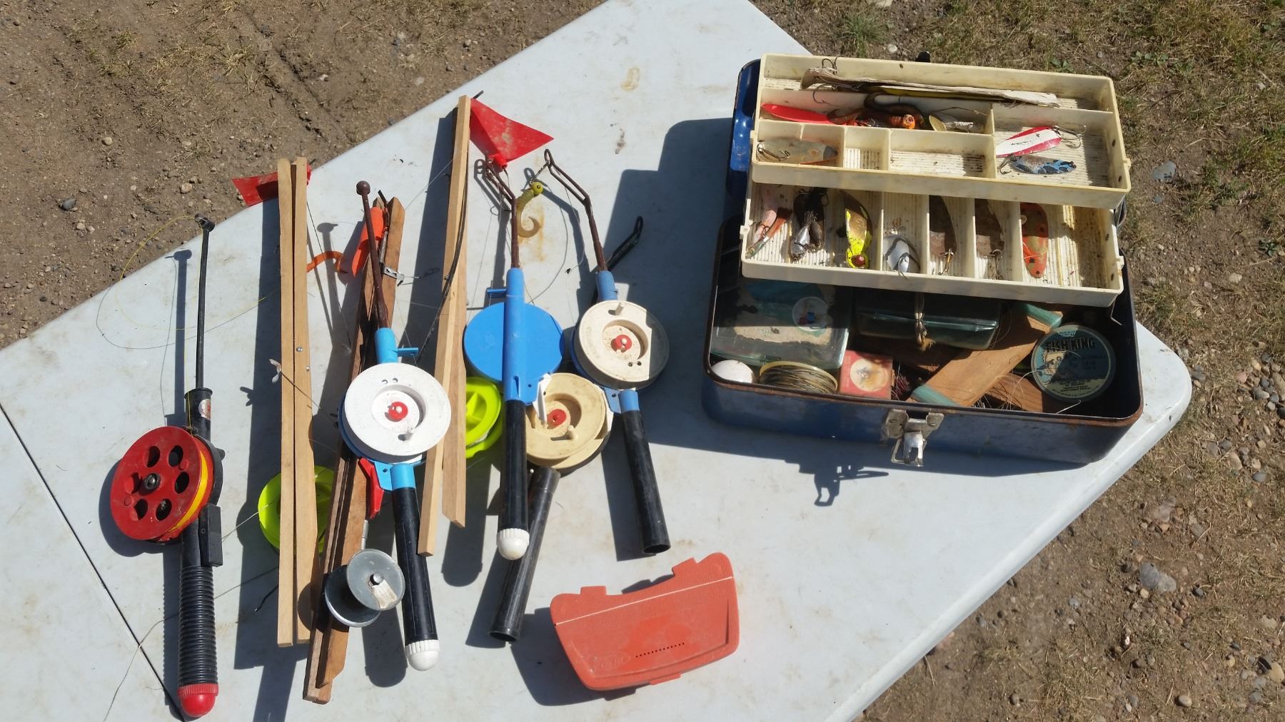 7 ICE FISHING RODS AND TACKLE BOX