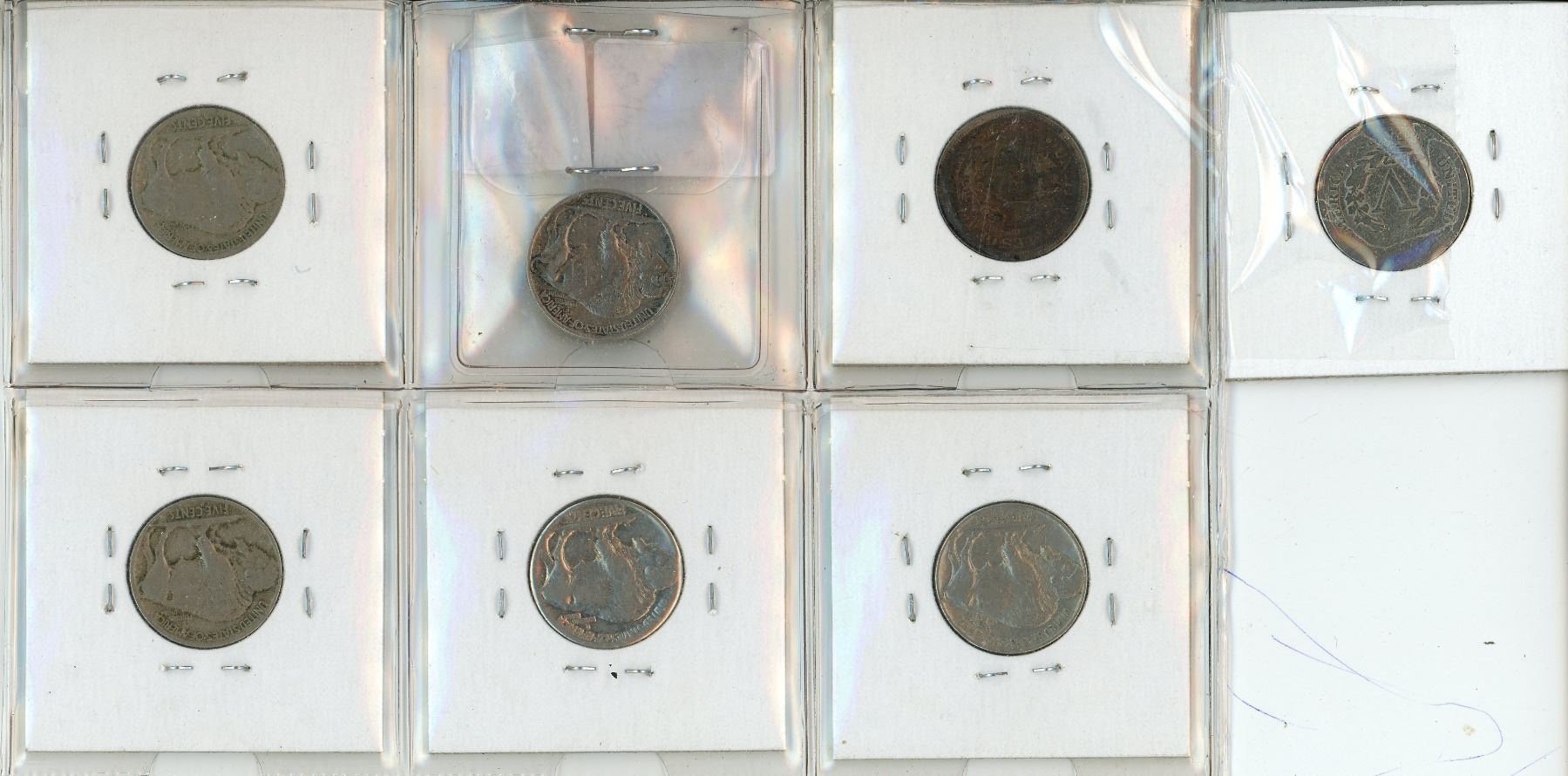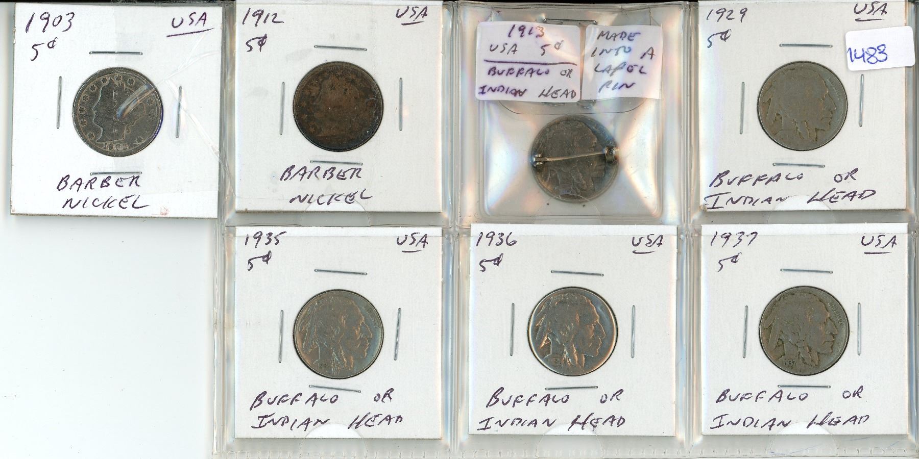 7 U.S.A. 5 Cent Coins; 4 Indian Head, 2 Barber Nickels & 1 Indian Head Made into Lapel Pin