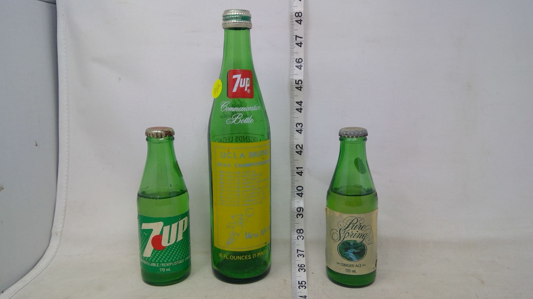 7-Up and Pure Spring Green Glass Bottles UNIQUE (with caps)