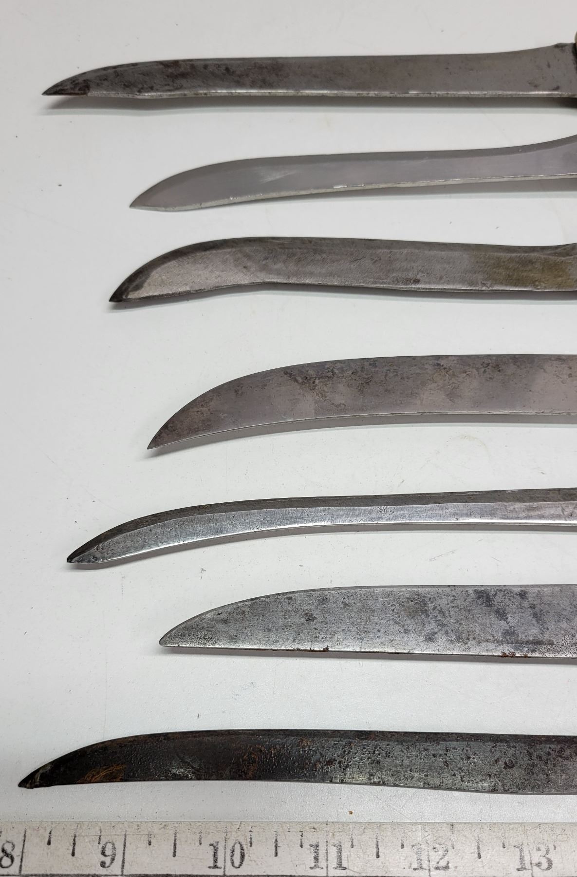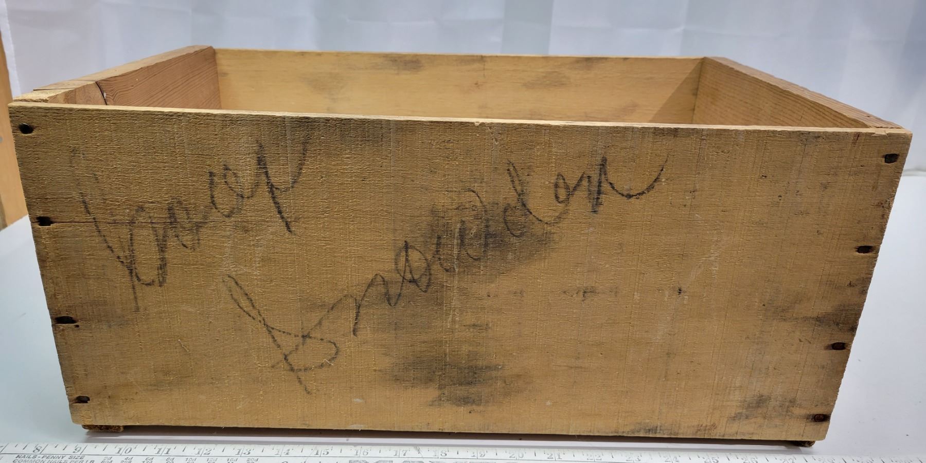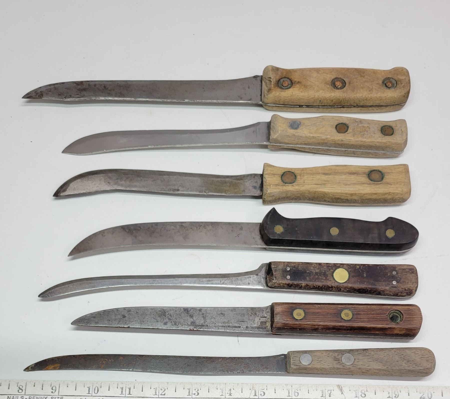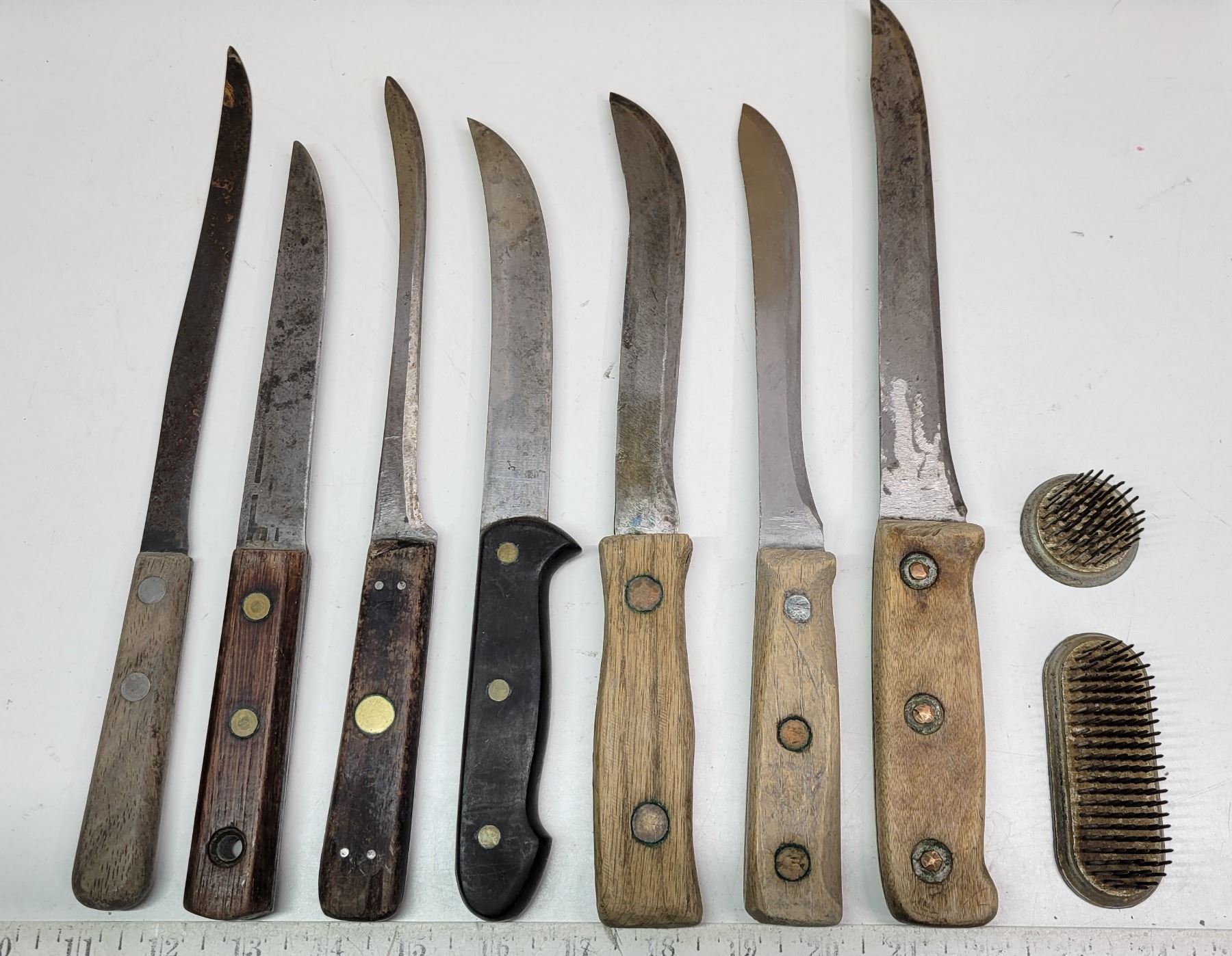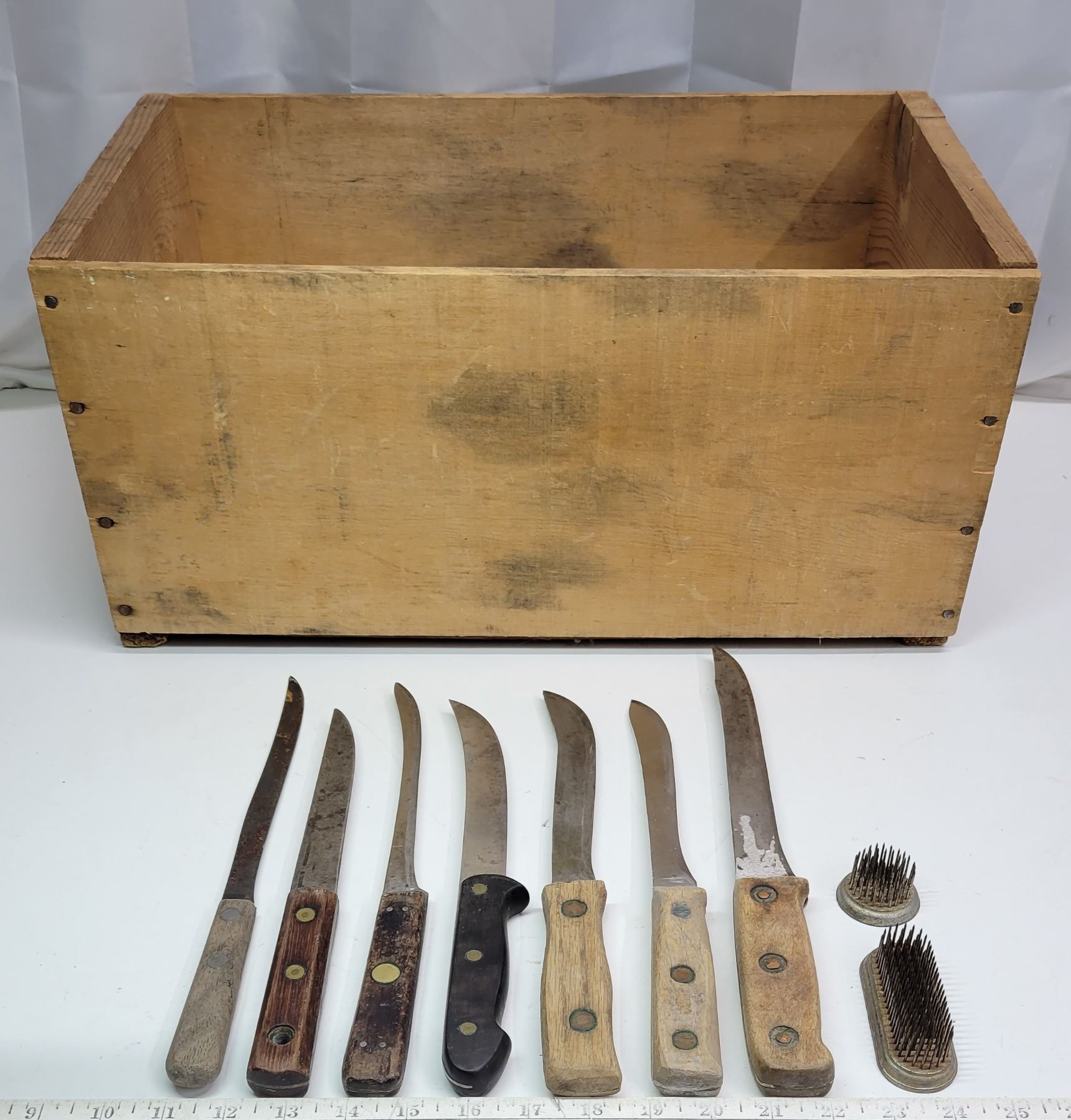7 Very Sharp De-Boning Knives 1 – Solingen, Germany + 2 Brass Meat Tenderizers + “Associated Growers” Wooden Pear Box 19.5x12 inch