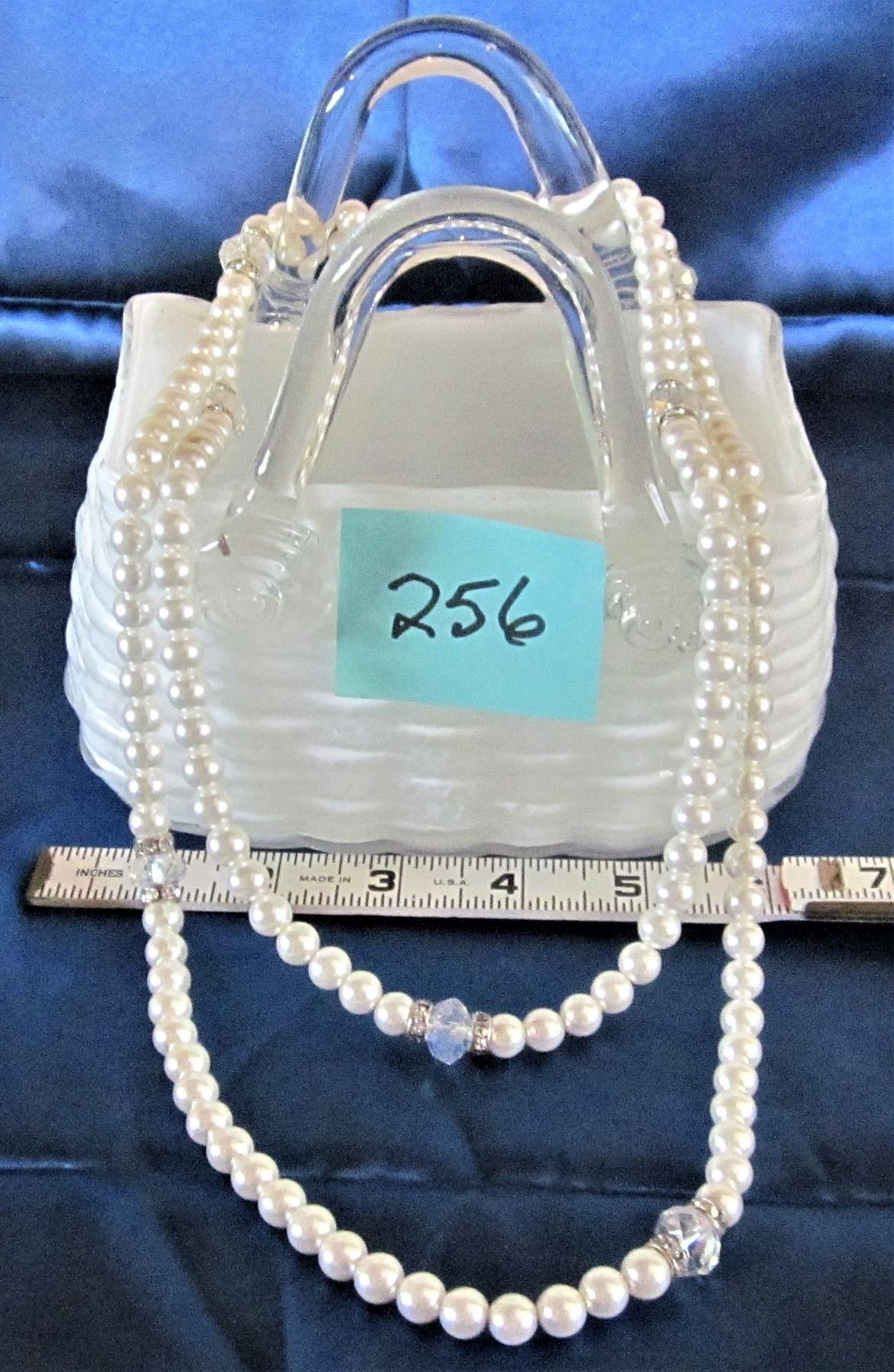 7" WHITE GLASS BASKET/ JEWELERY CONTAINER- 24" FAUX PEARL NECKLACE
