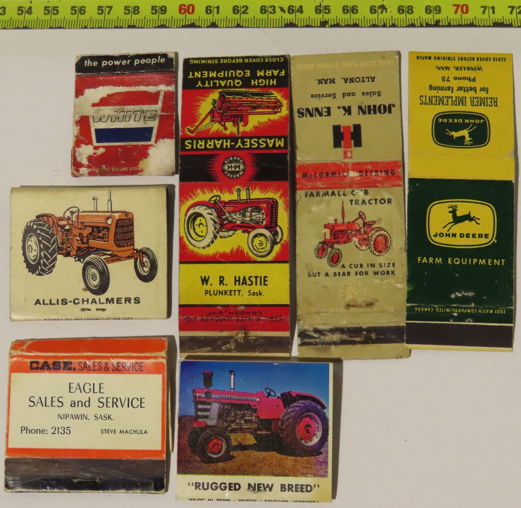 7 vintage match books advertising tractors: White, MF, Massey Harris, Allis-Chalmers, Case, John Dee