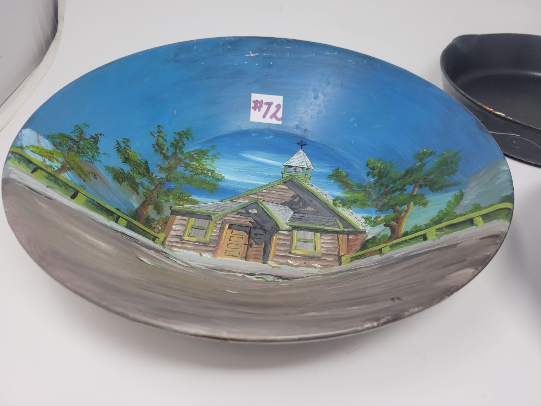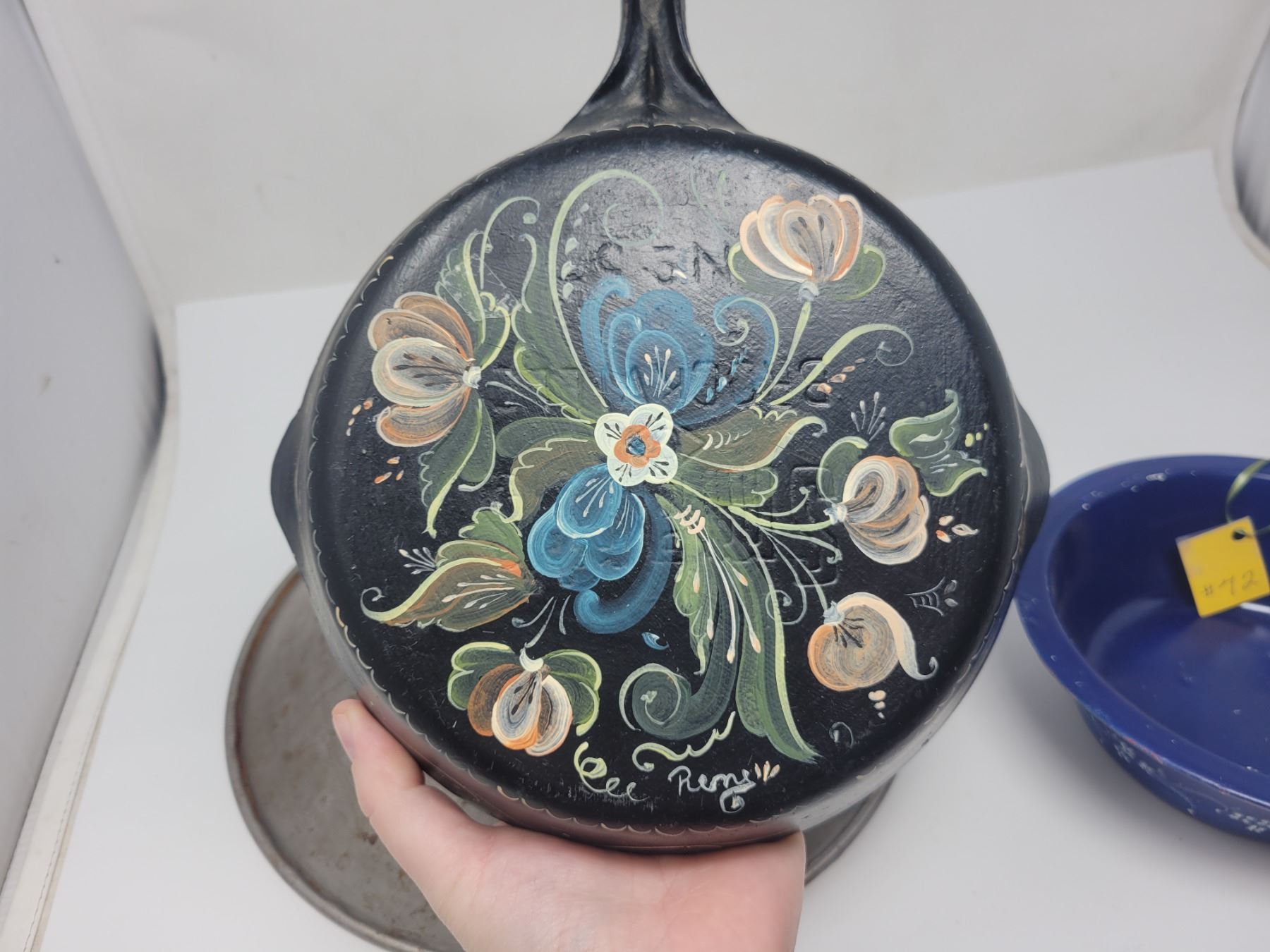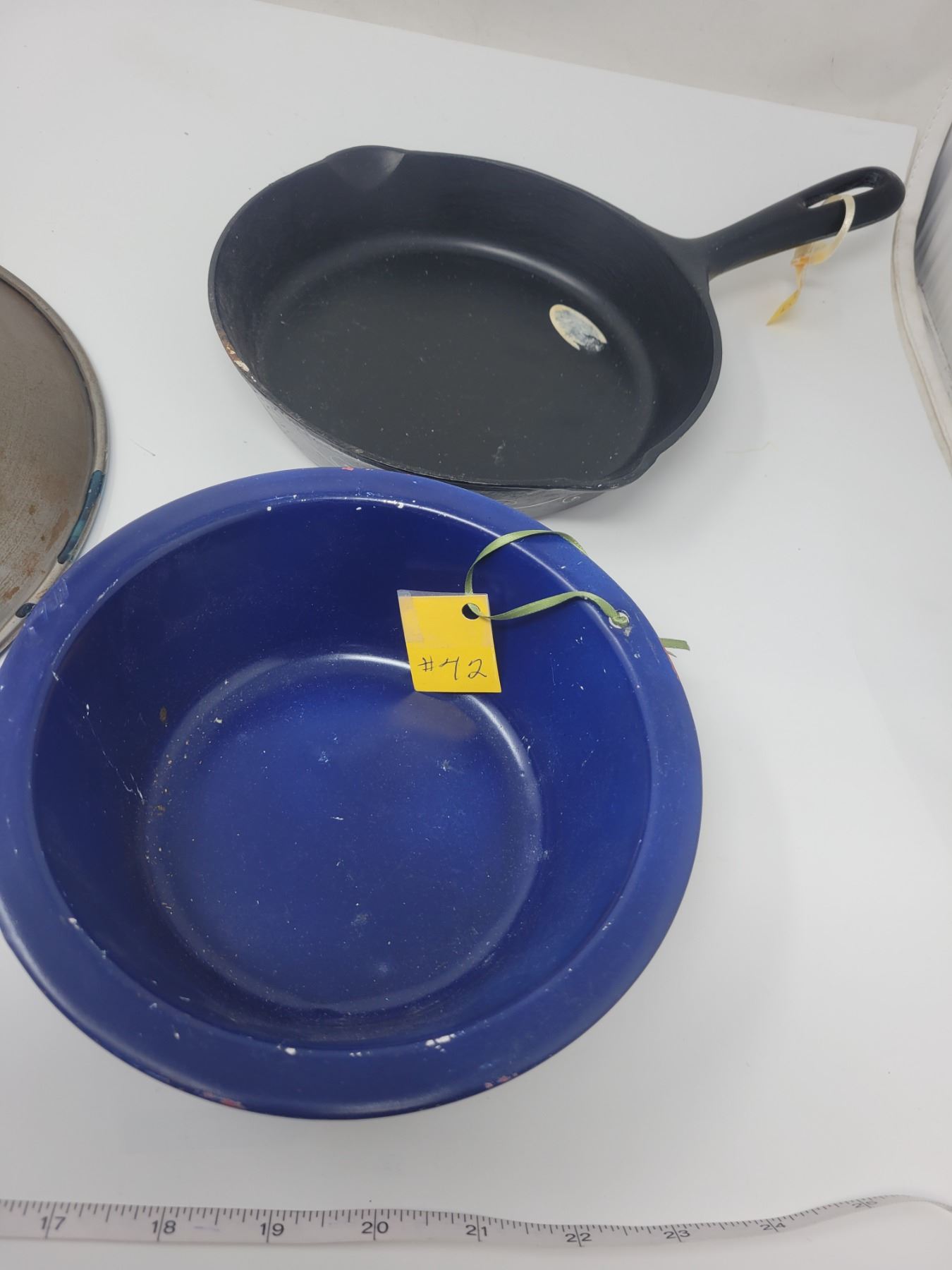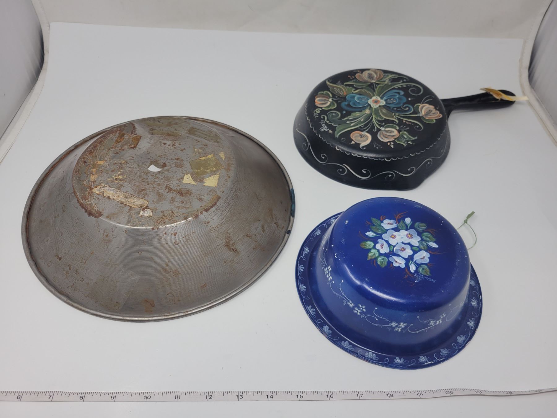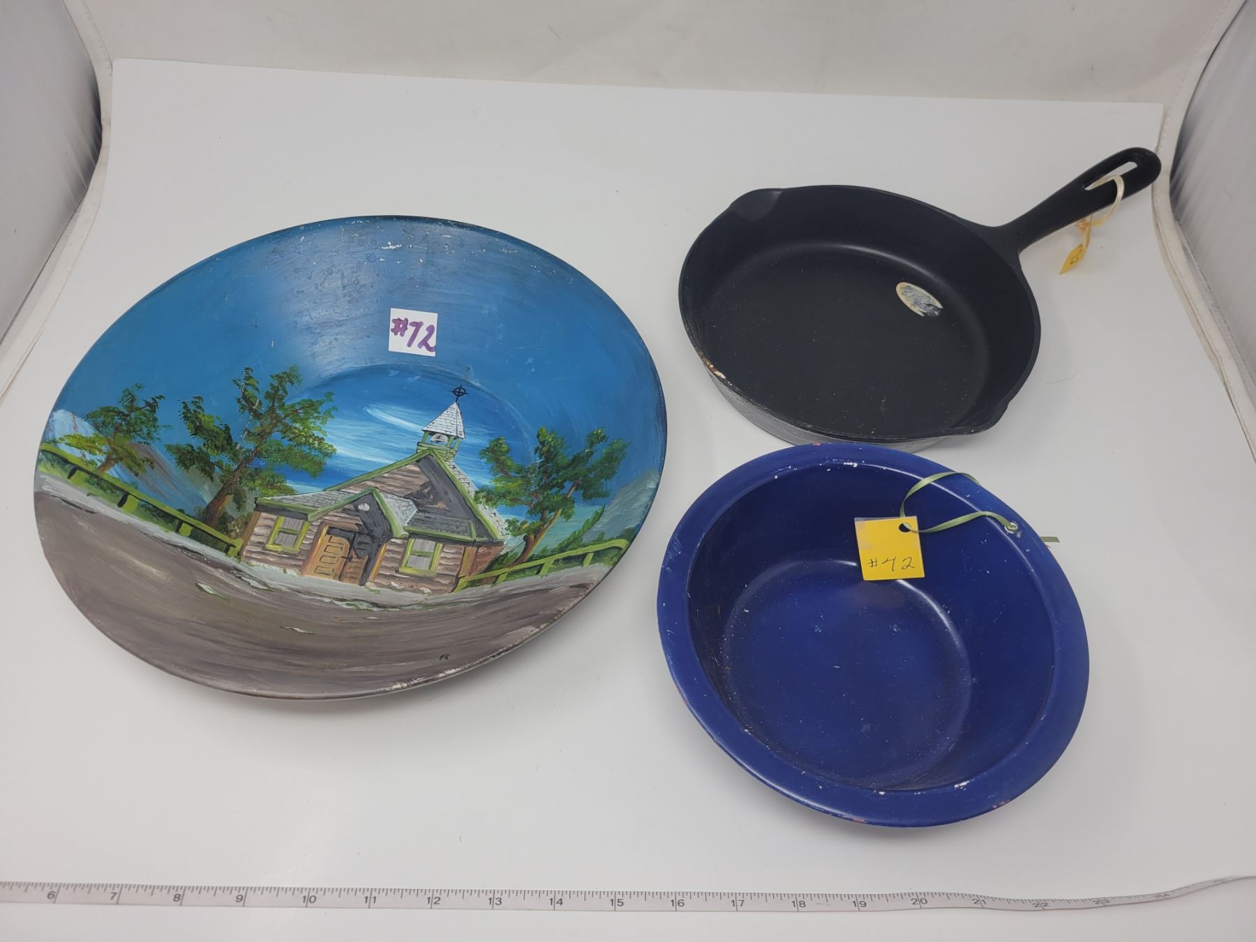 72. Kitchen decorator lot, cast pan, metal and enamel dishes