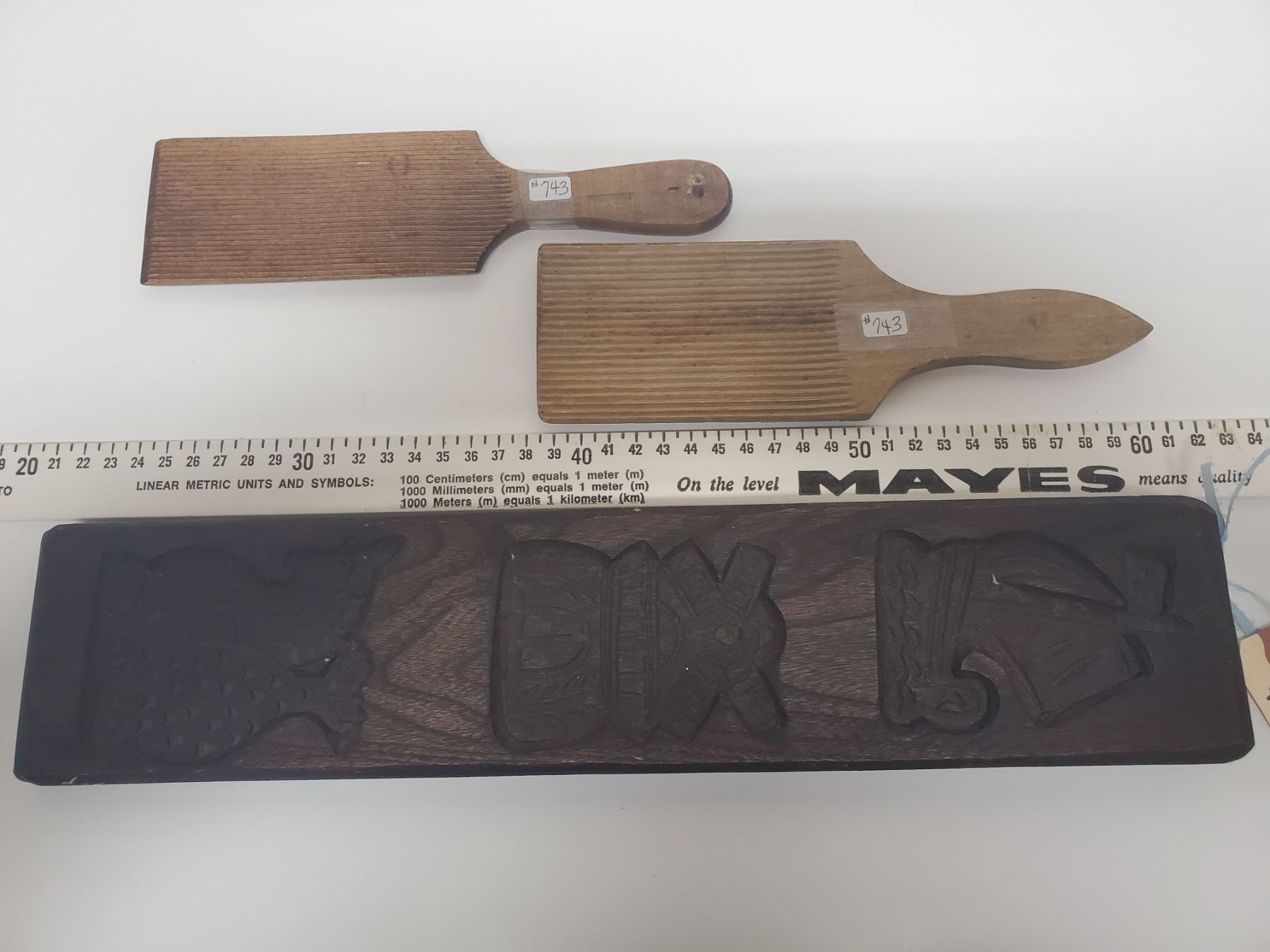 743. Wooden carved cookie mold & 2 butter paddles