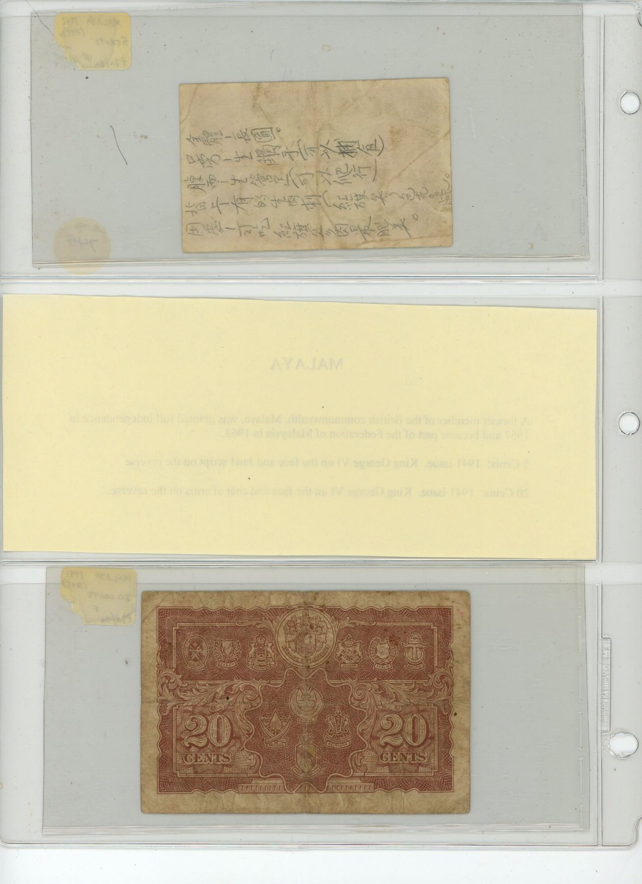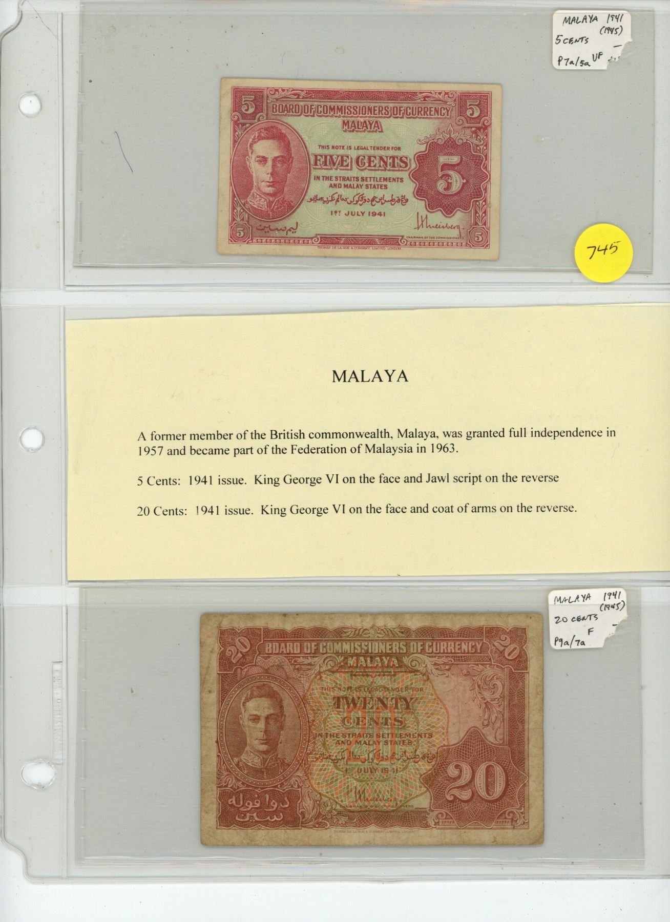 Lot of 2 Malaya World War II notes. Both depict King George VI. 1941 5 cents and 1941 20 cents. VF & F.