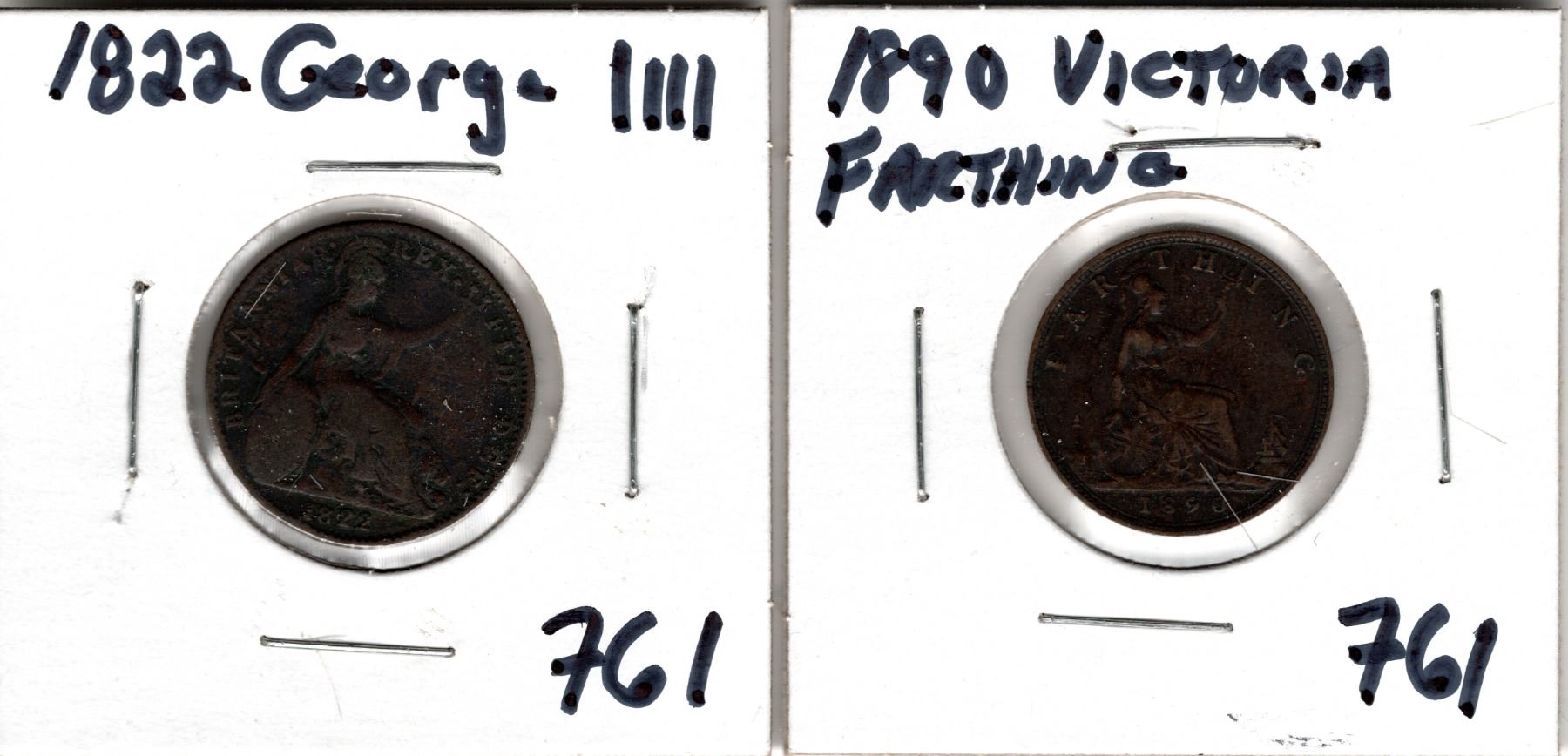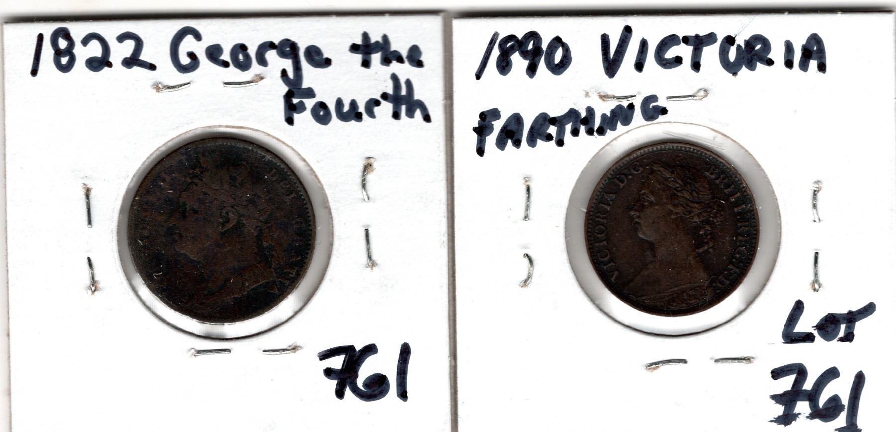 761. 1822 GEOPRGE 1111 HALF PENNY, AND 1890 VICTORIA FARTHING