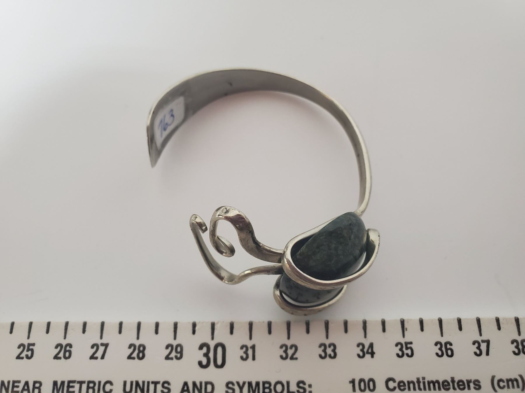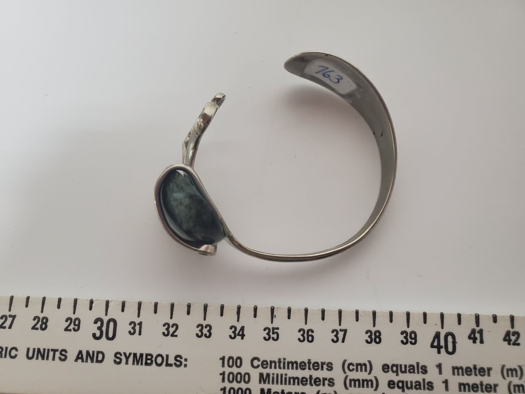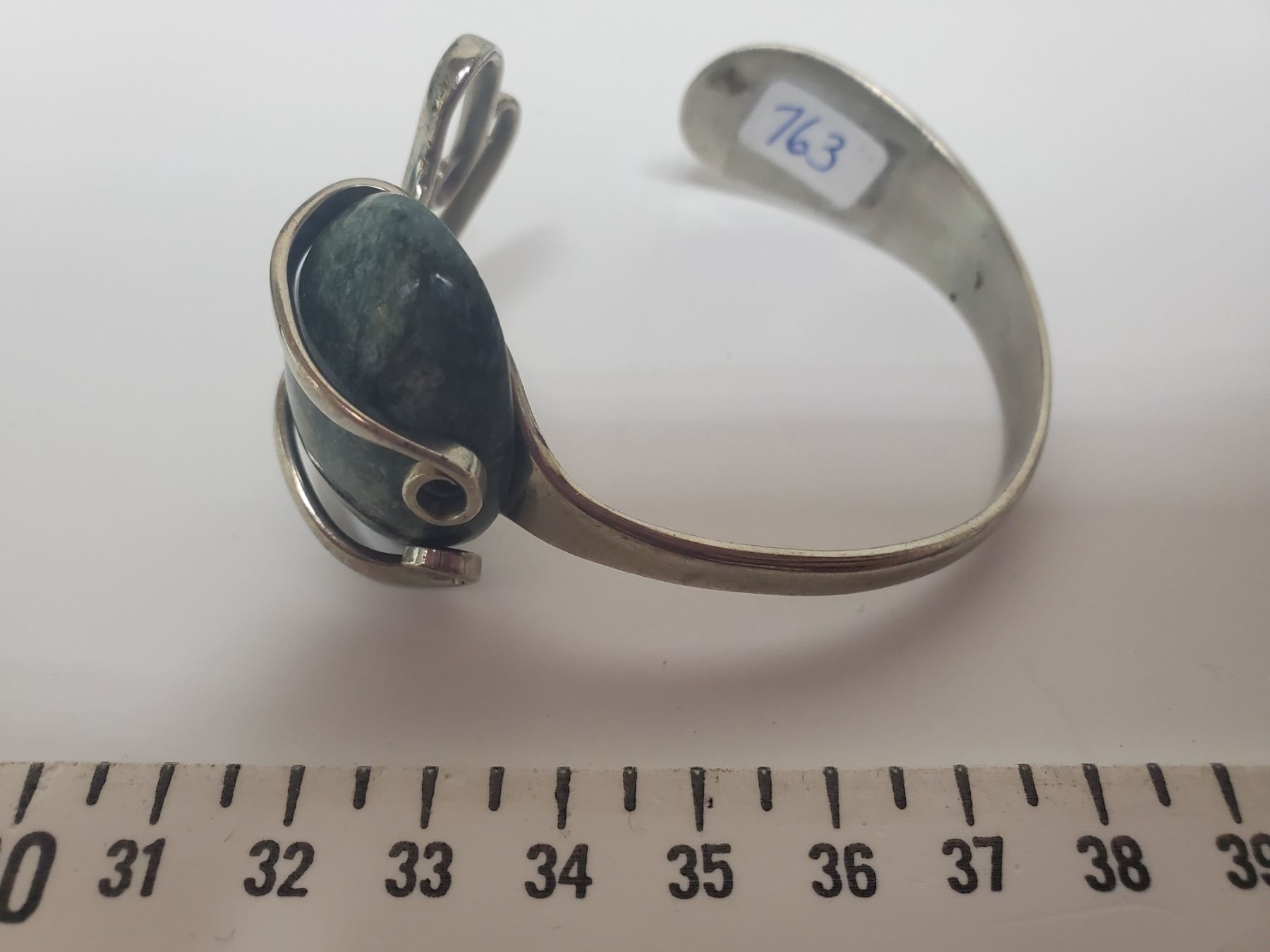 763. Silver tone bracelet with moss green stone
