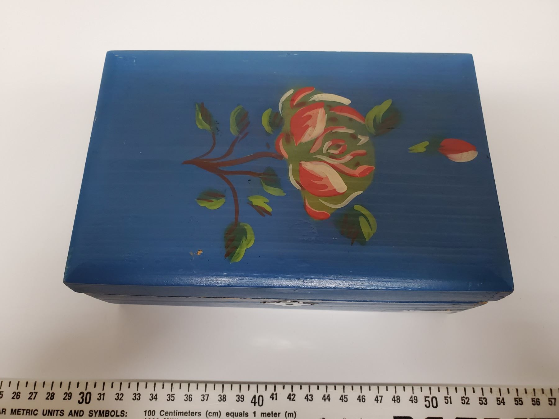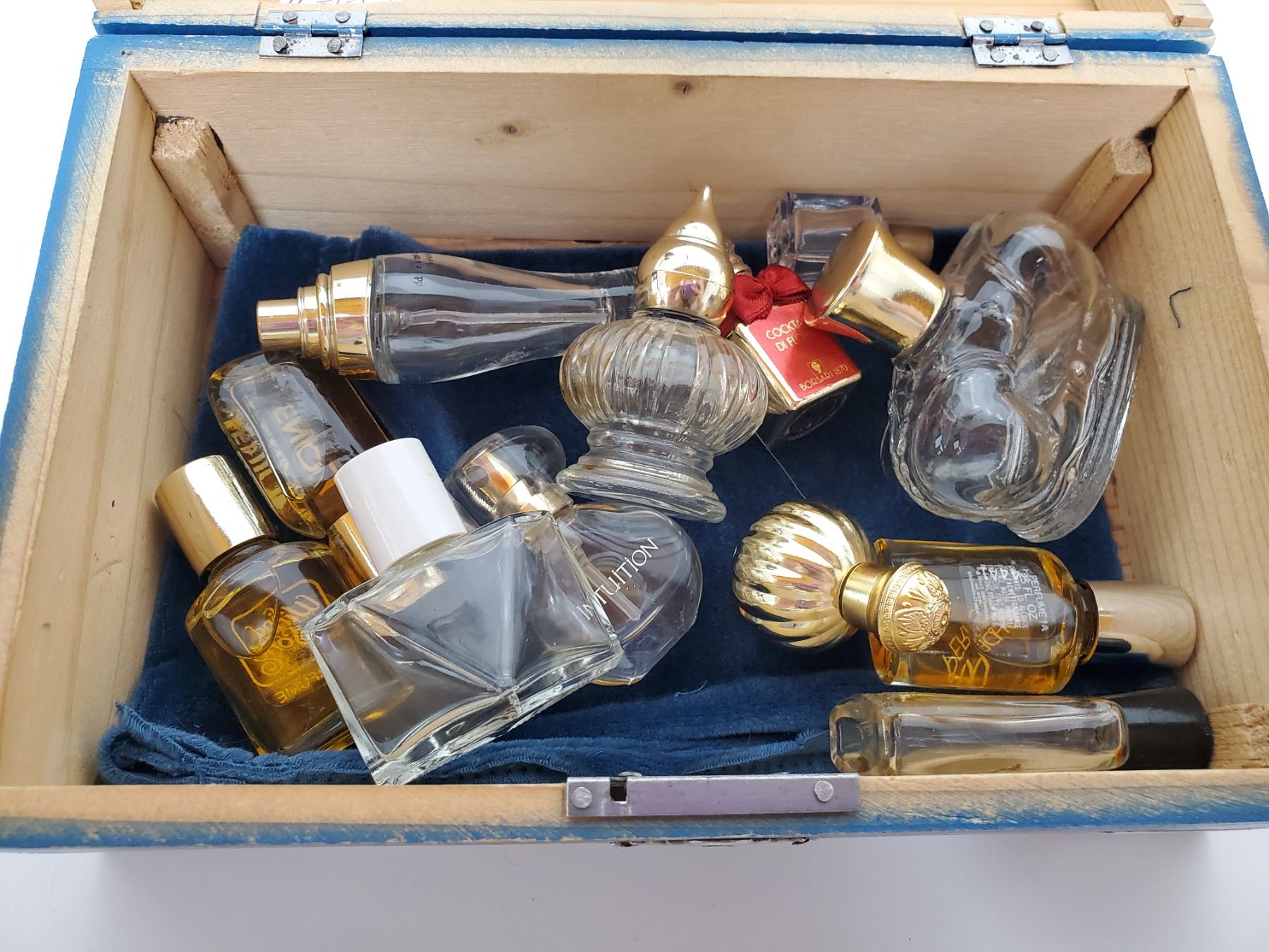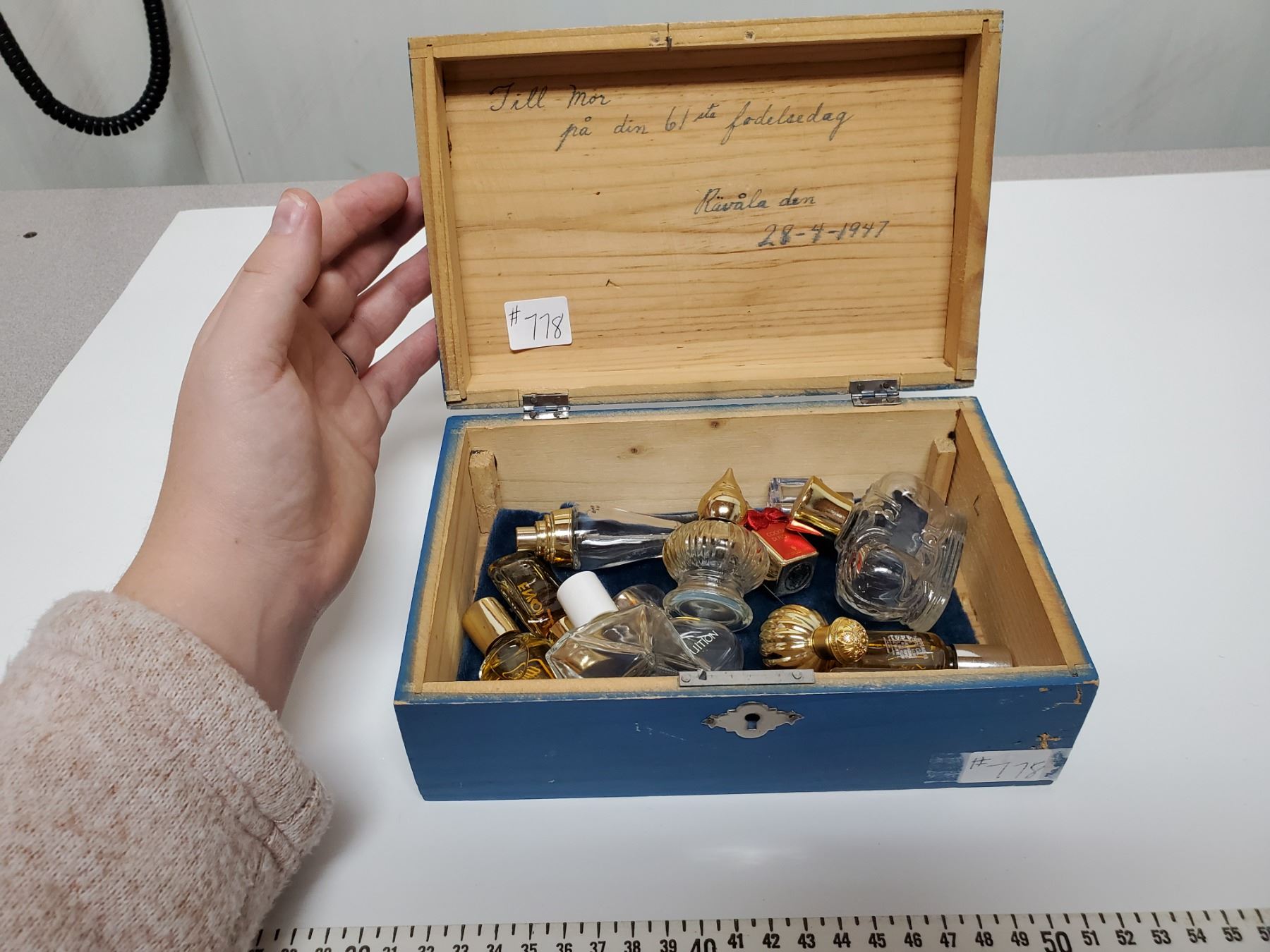 778. Blue wood box dated 24-8-1947 with perfume bottles