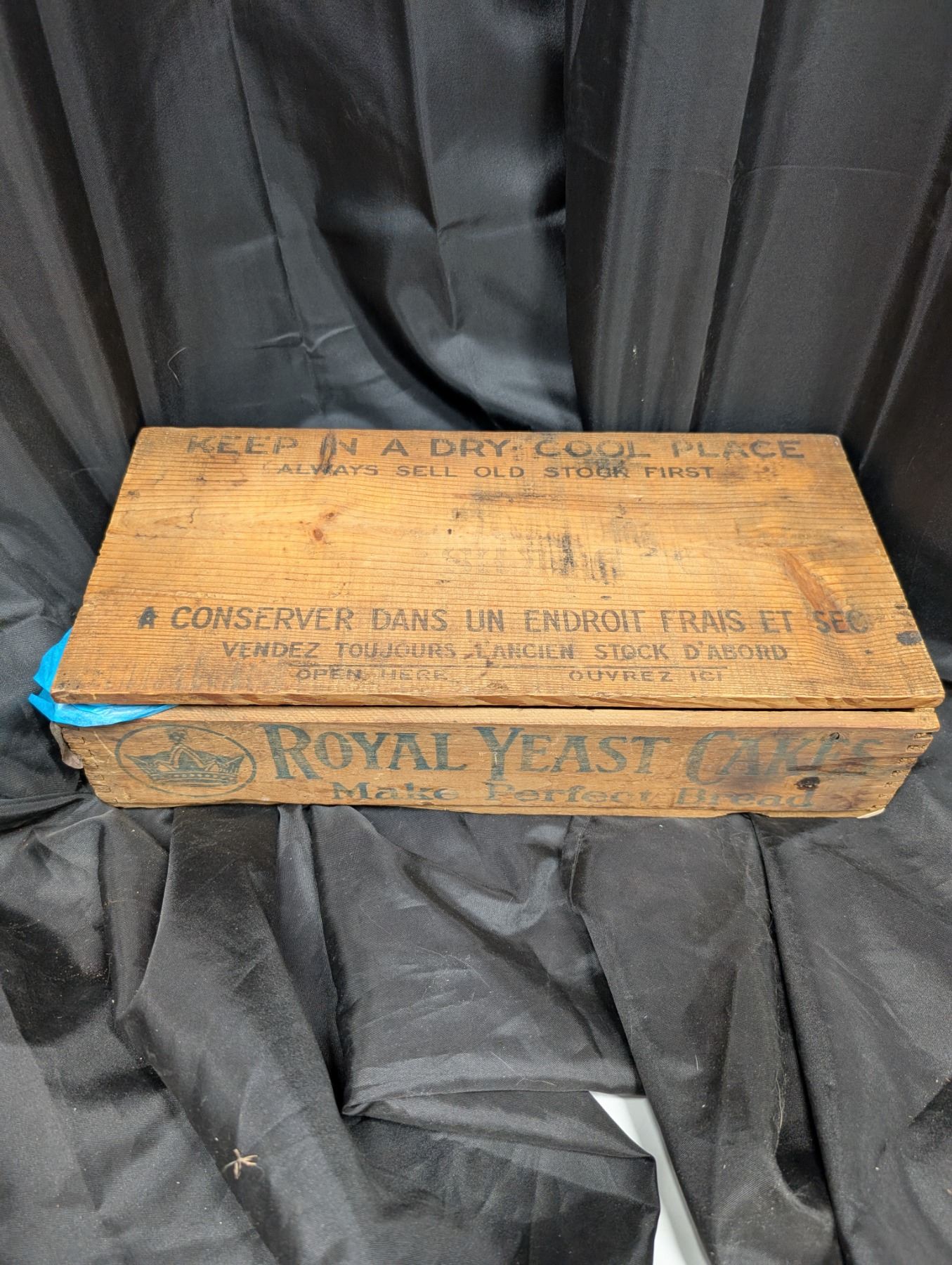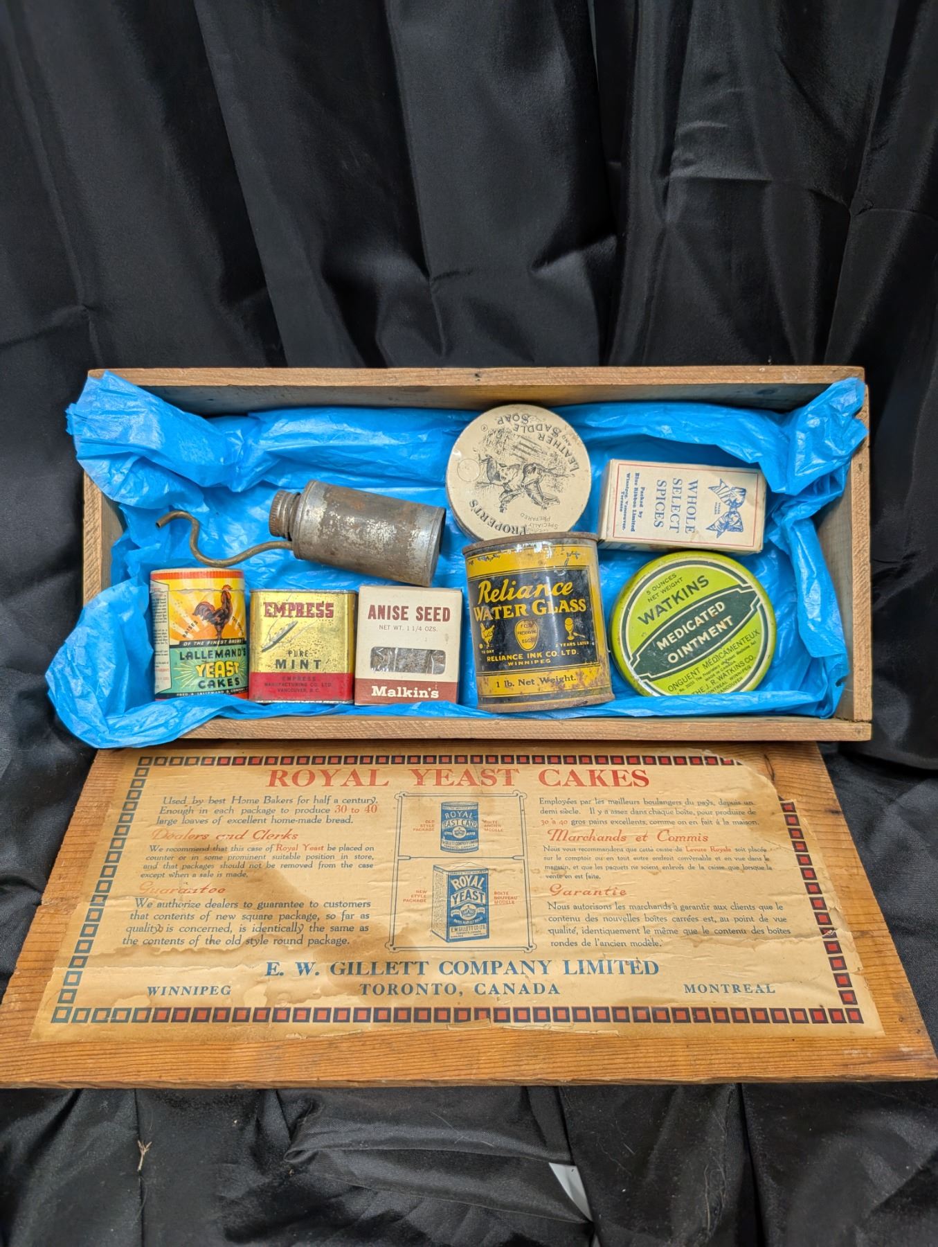 (8) Assortment of Vintage Yeast, Saddle soap, Pure Mint, etc. (Wooden Royal Yeast Cakes wood box as