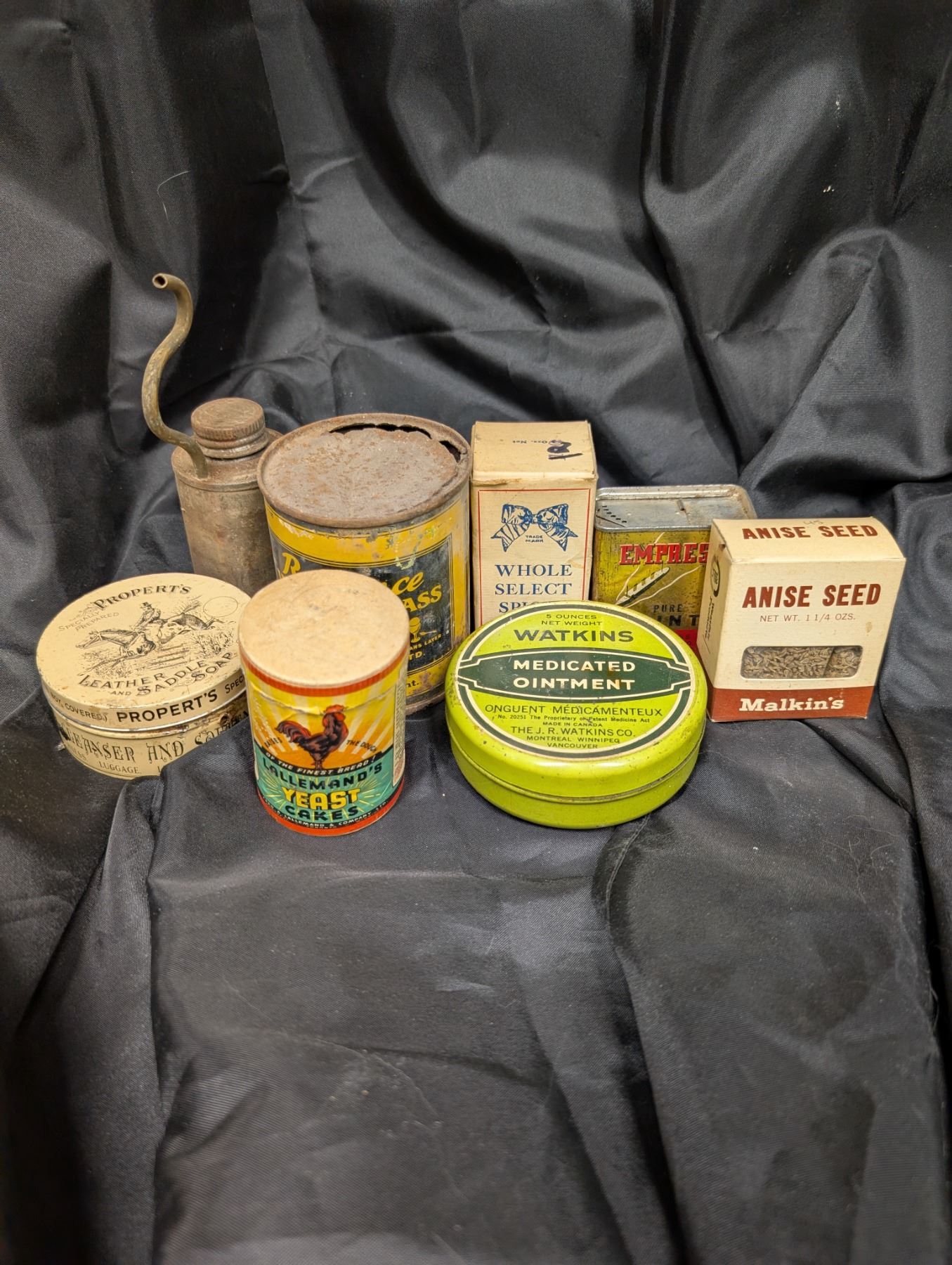 (8) Assortment of Vintage Yeast, Saddle soap, Pure Mint, etc. (Wooden Royal Yeast Cakes wood box as well)
