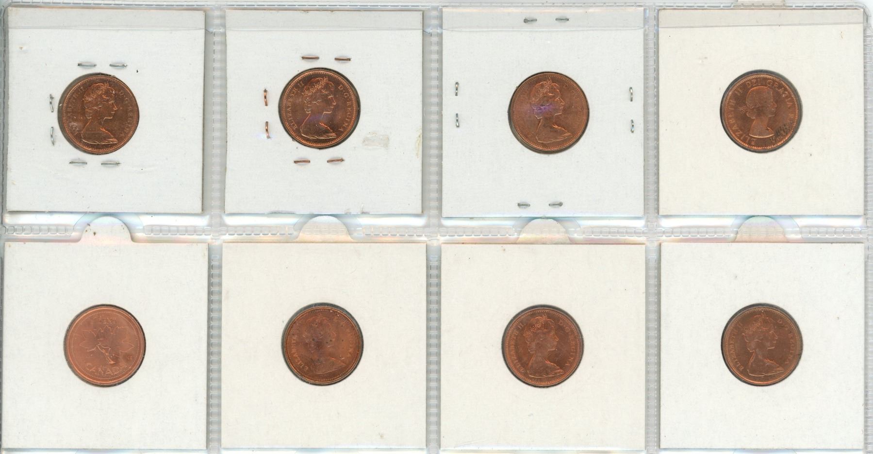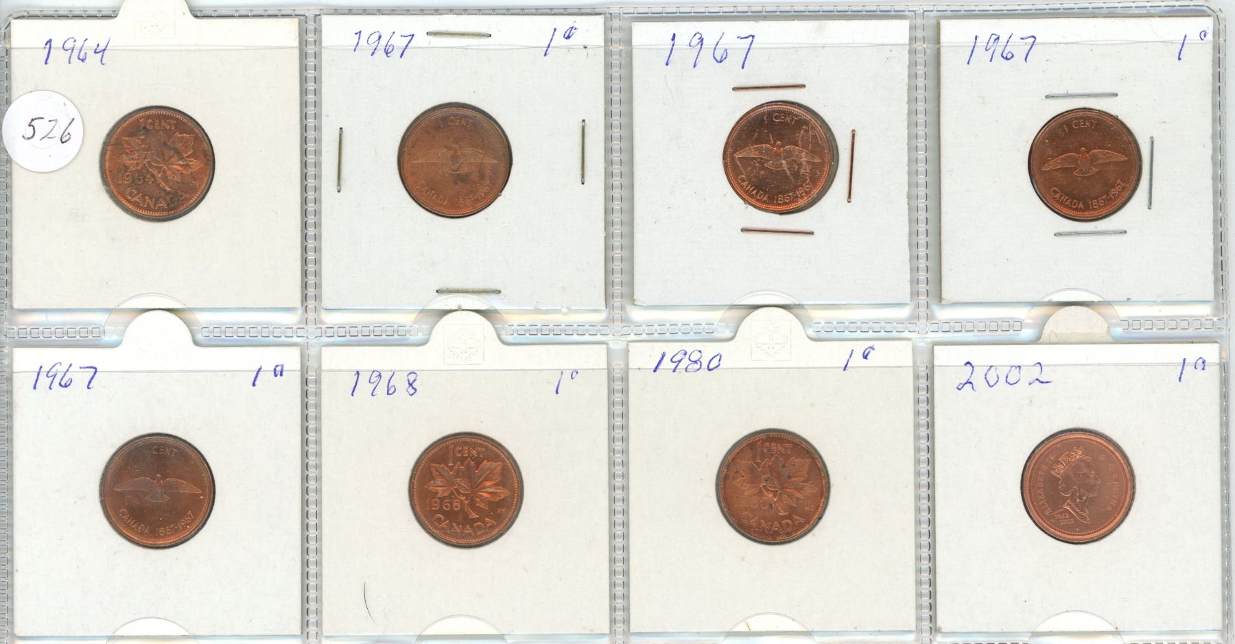 8 Canadian 1¢ coins - 1964, 1967 X 4, 1968, 1980, 2002