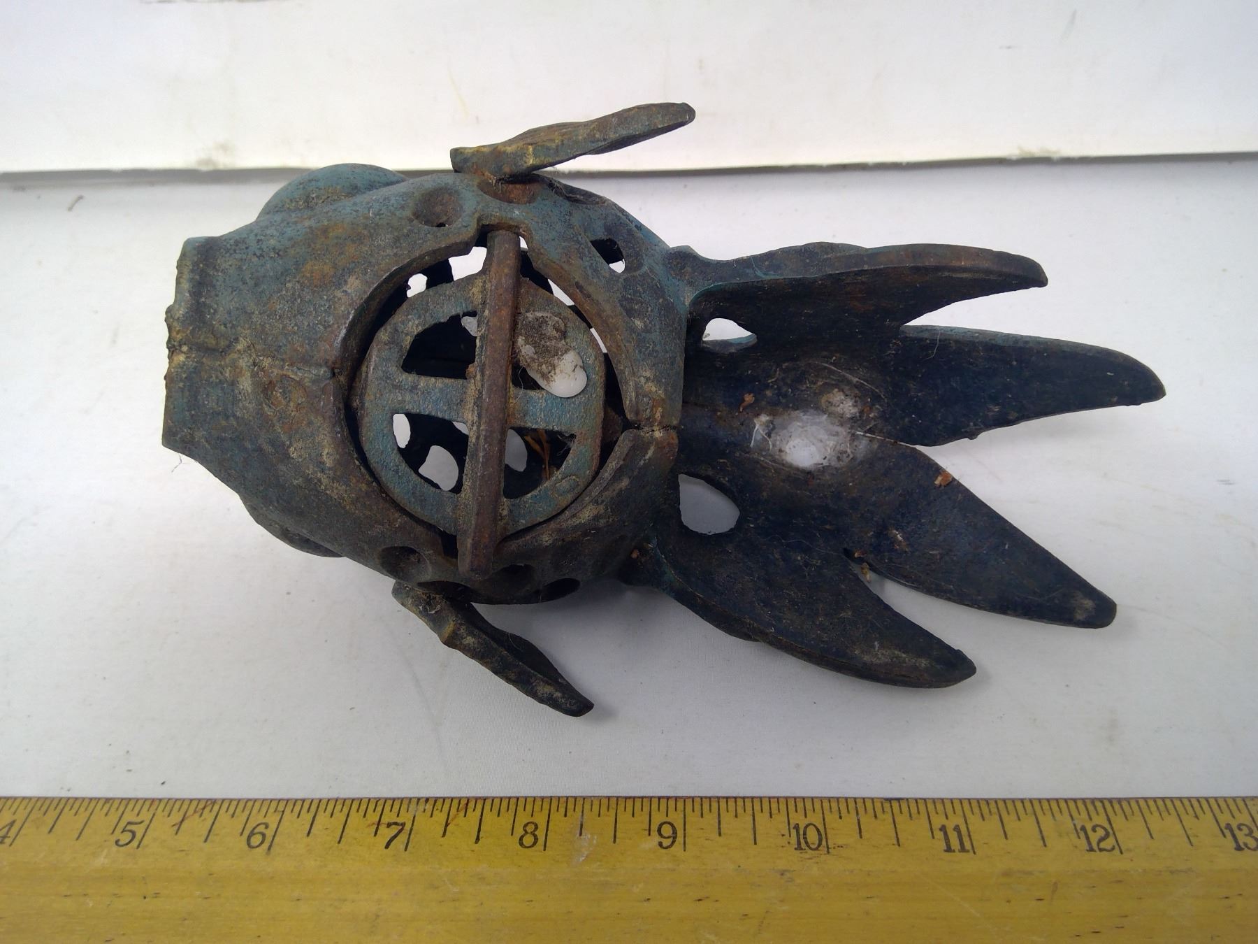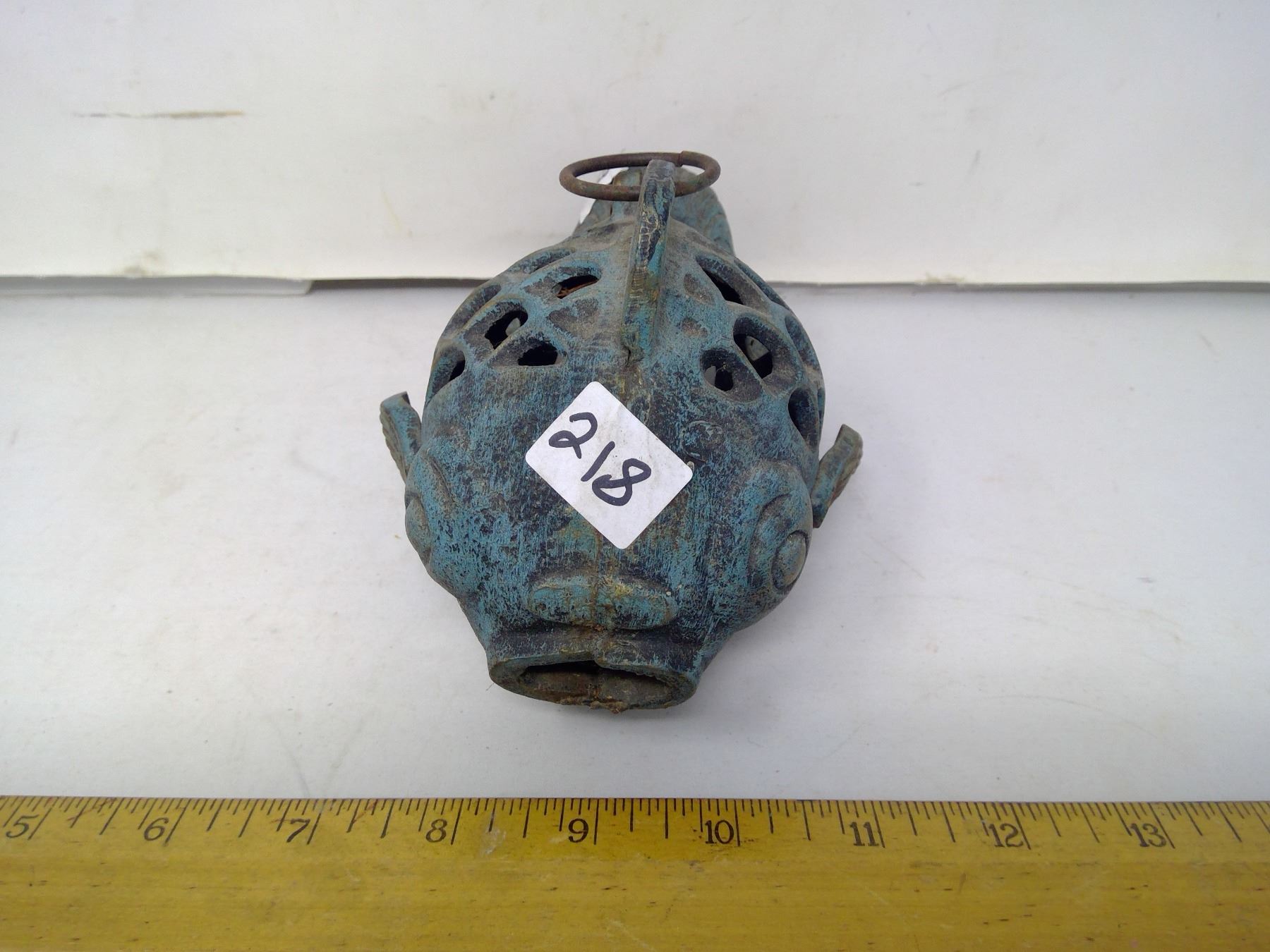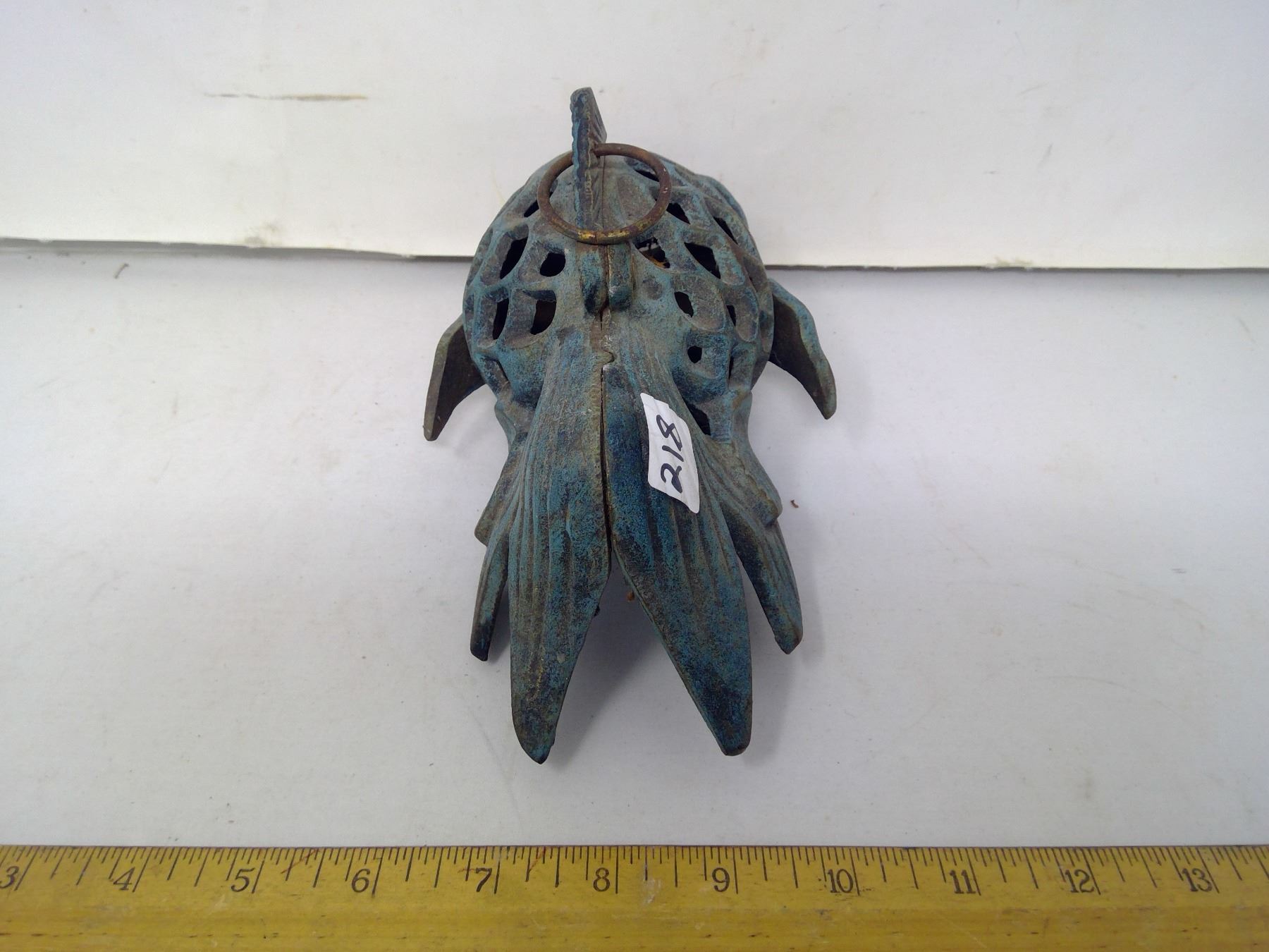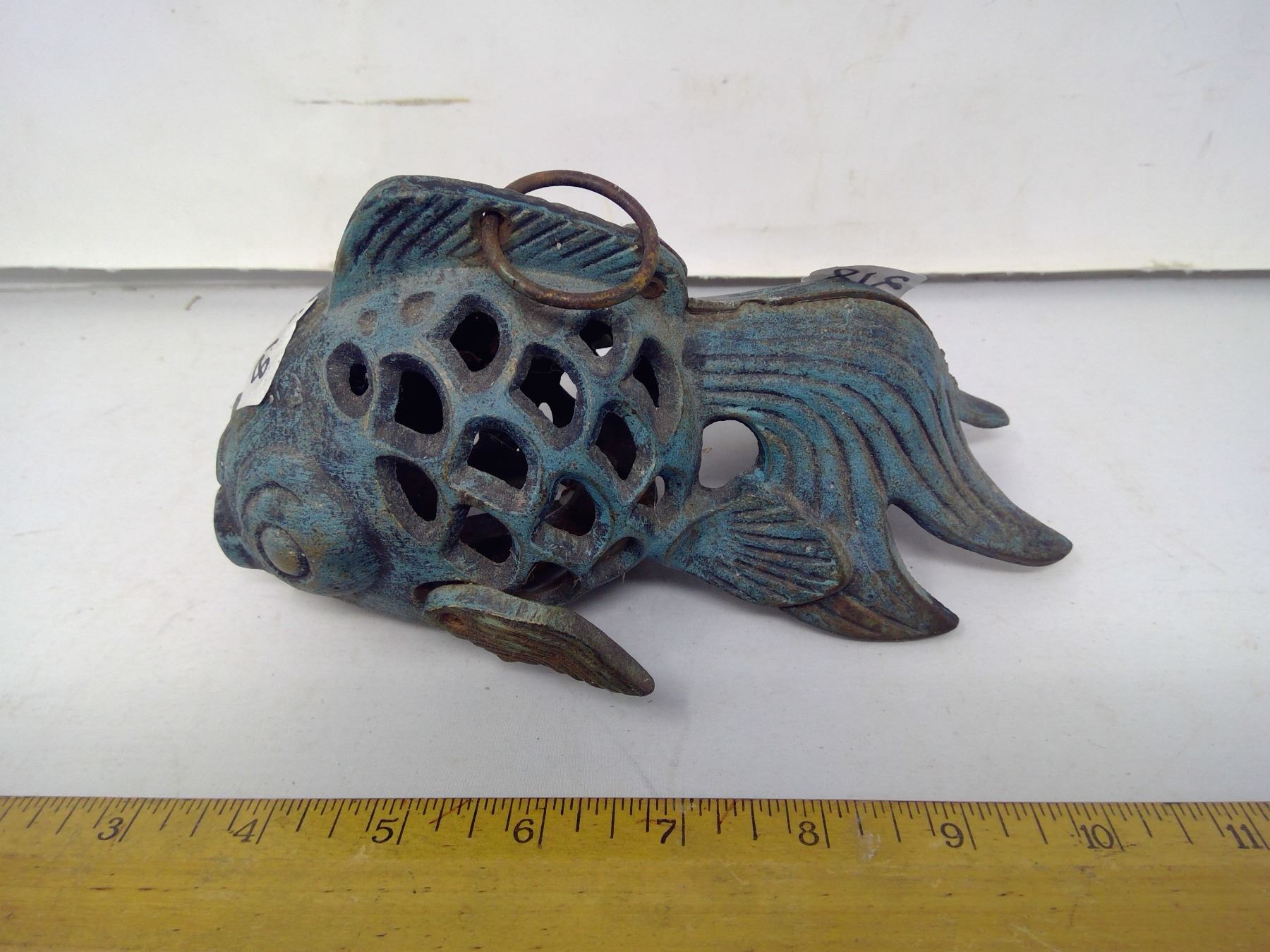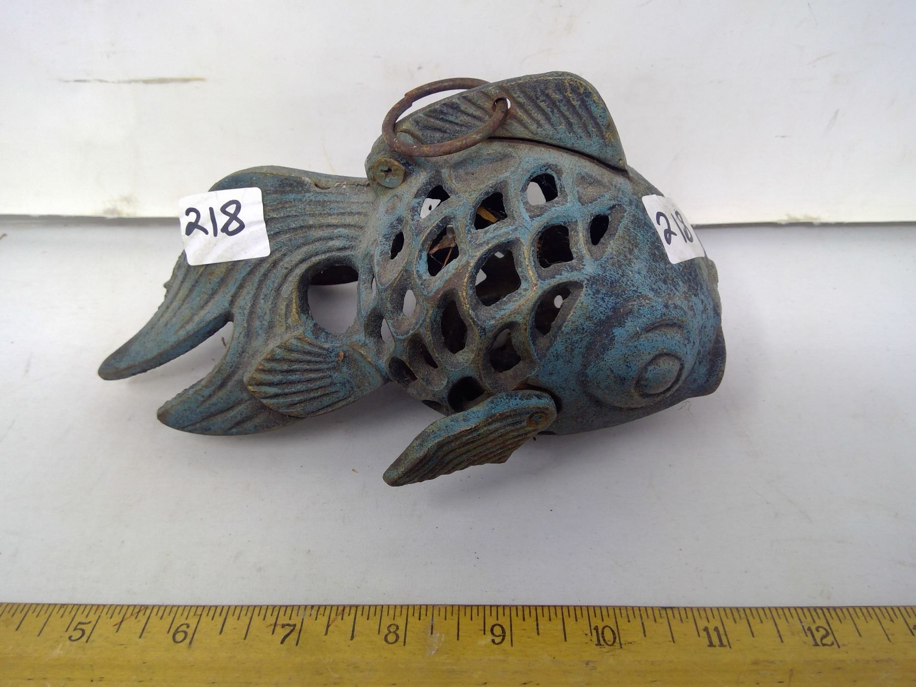 218 – 8” long cast iron goldfish verdigris patina hanging tealight.