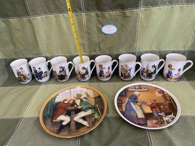 8 Norman Rockwell mugs and 2 collectors plates