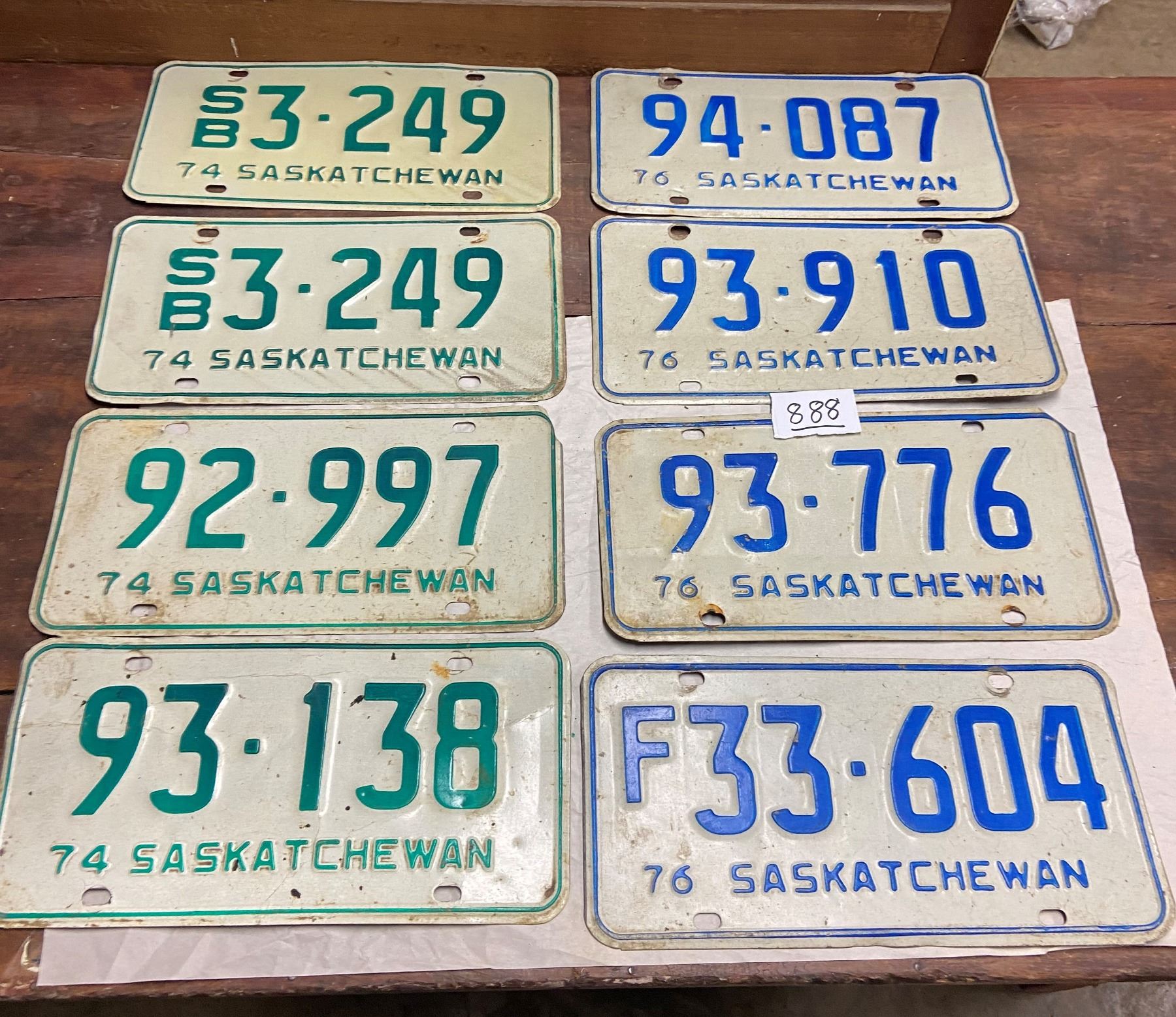 8 Saskatchewan license plates - Pair of 1974 School bus, pair of 1974s, 4-1976 licence farm plates