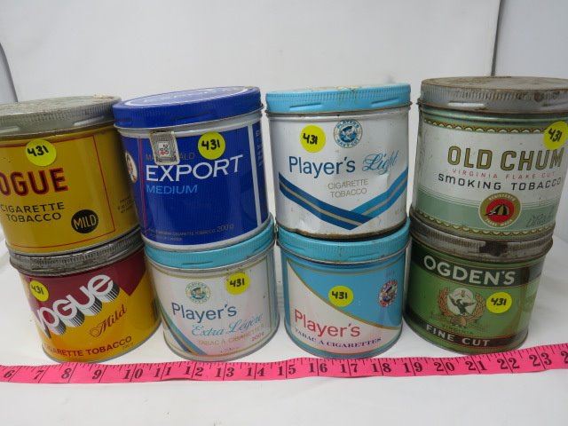 8 TOBACCO TONS- 2 VOGUE MILD, 1 MACDONALD EXPORT MEDIUM, 3 PLAYER'S -1 EXTRA LIGHT,1 LIGHT, 1 REGULAR, 1 OLD CHUM & 1 OGDEN'S FINE CUT