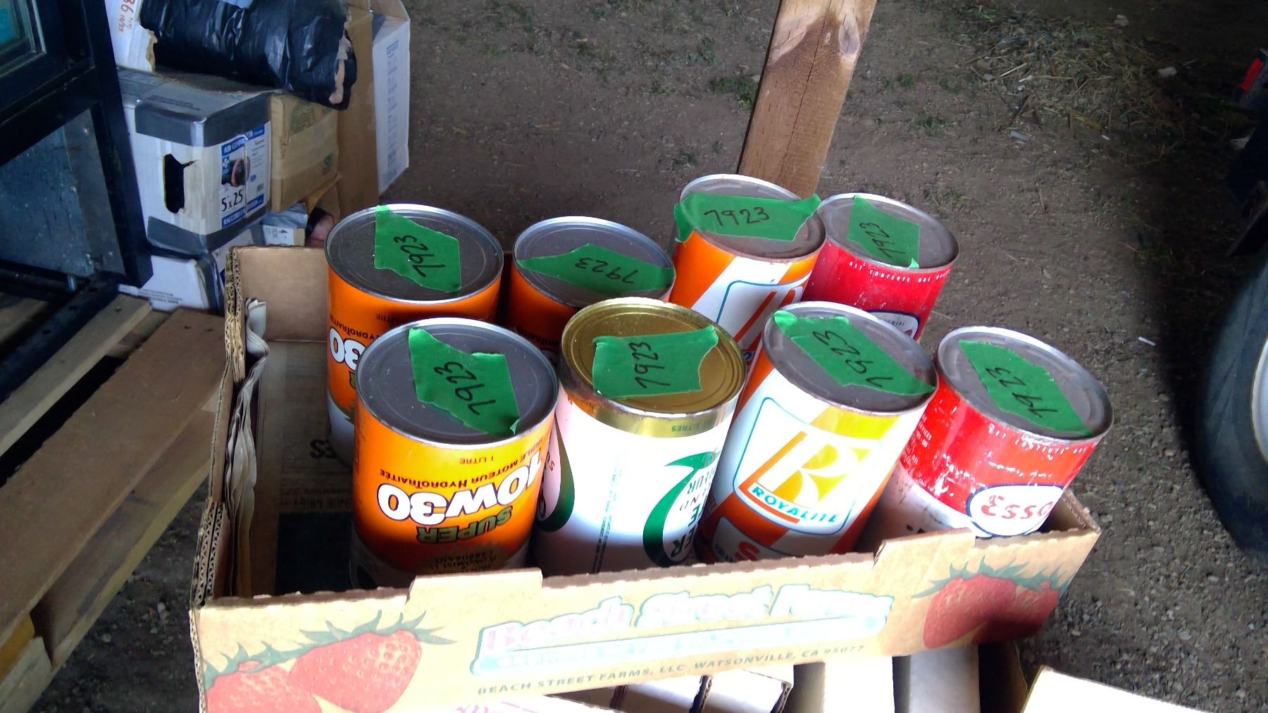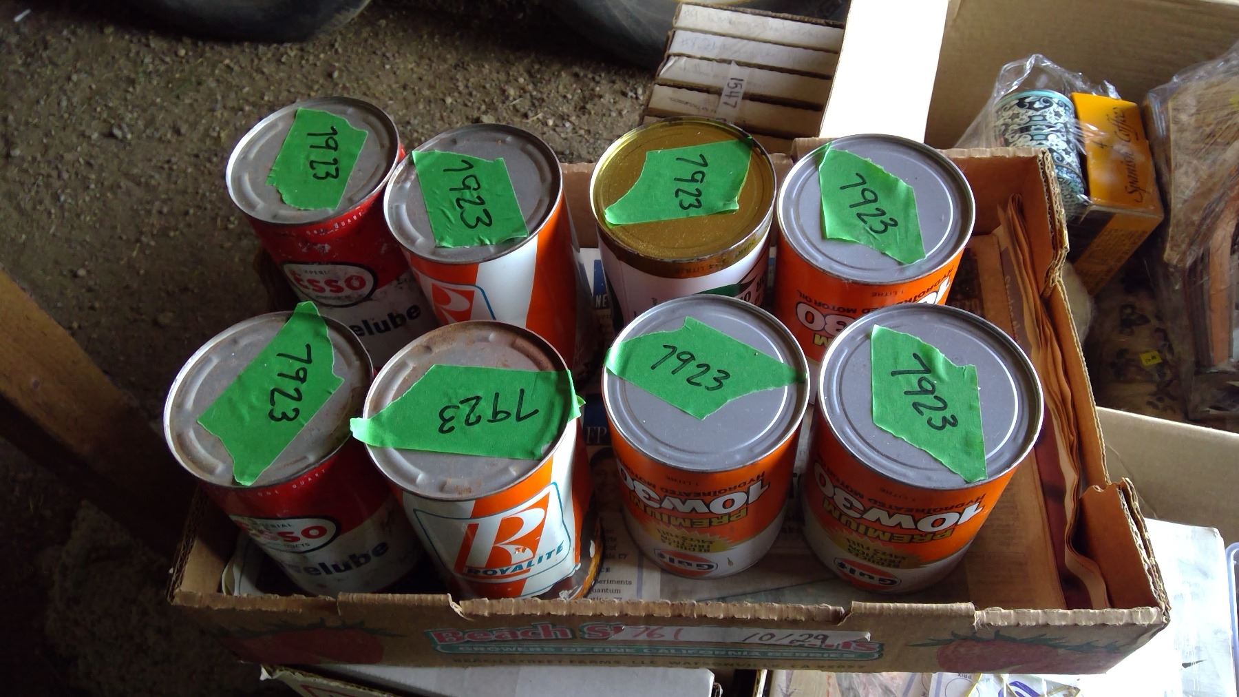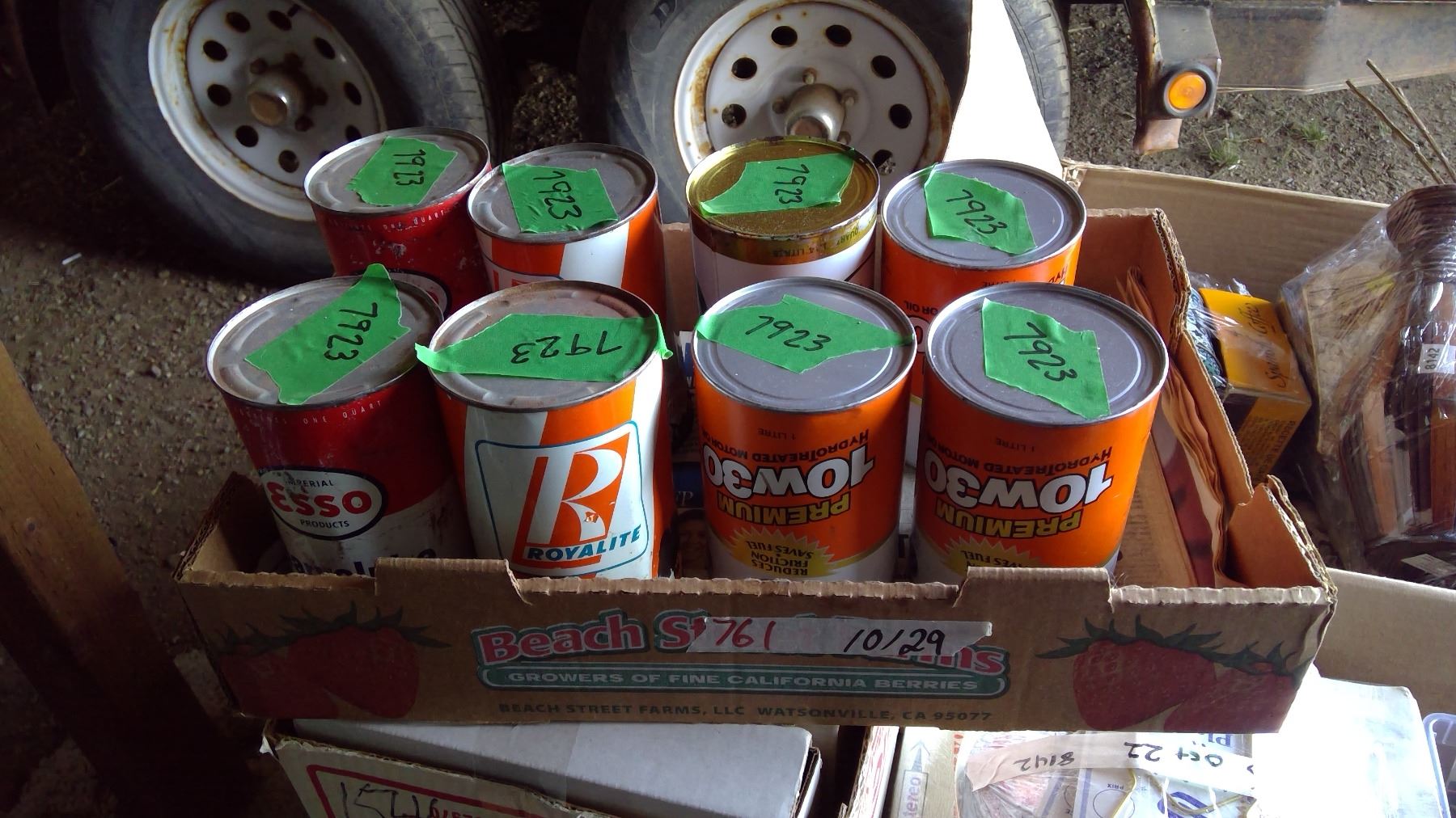 8 Vintage Oil Tins - 7 full - Esso, Royalite, Quaker State, Gulf Premium