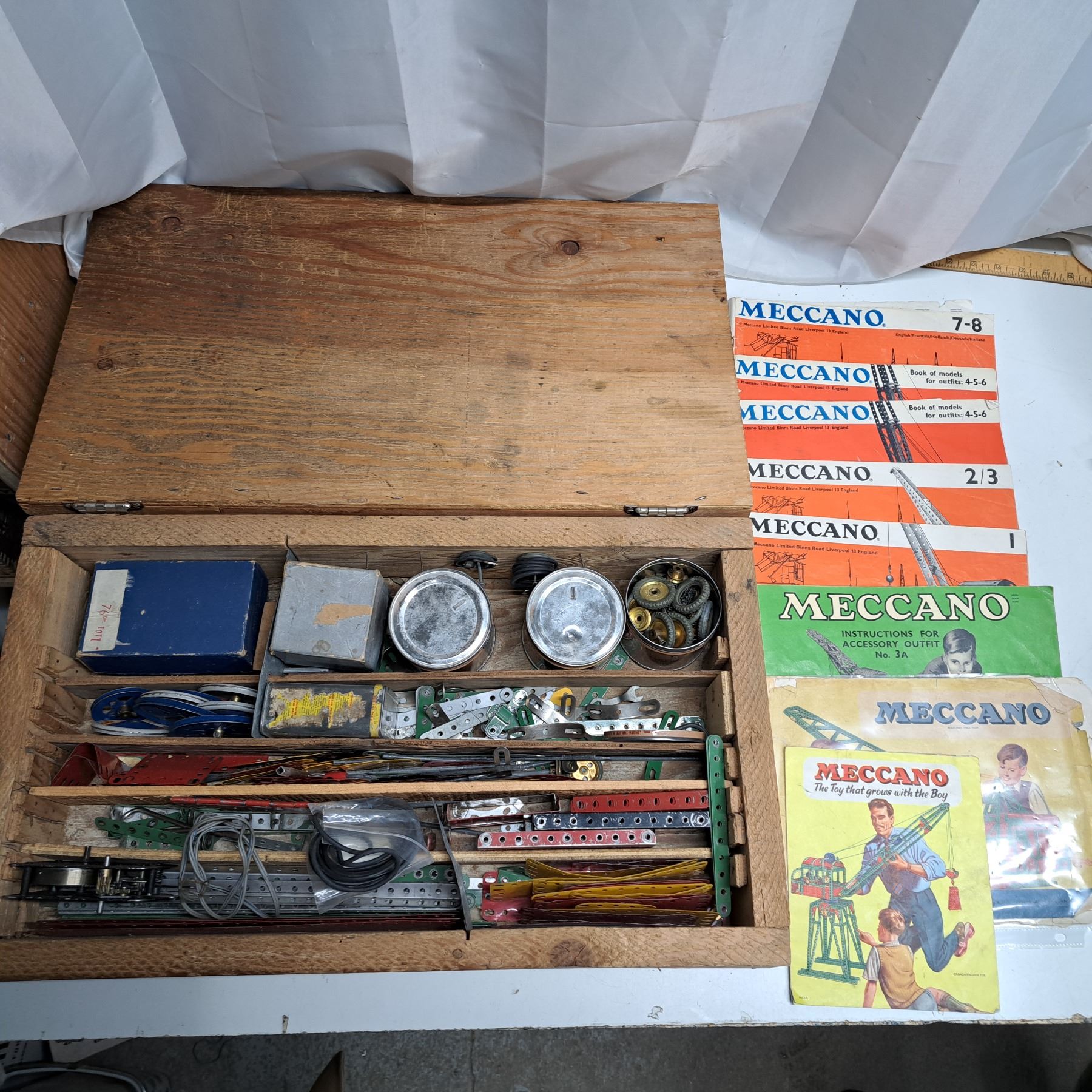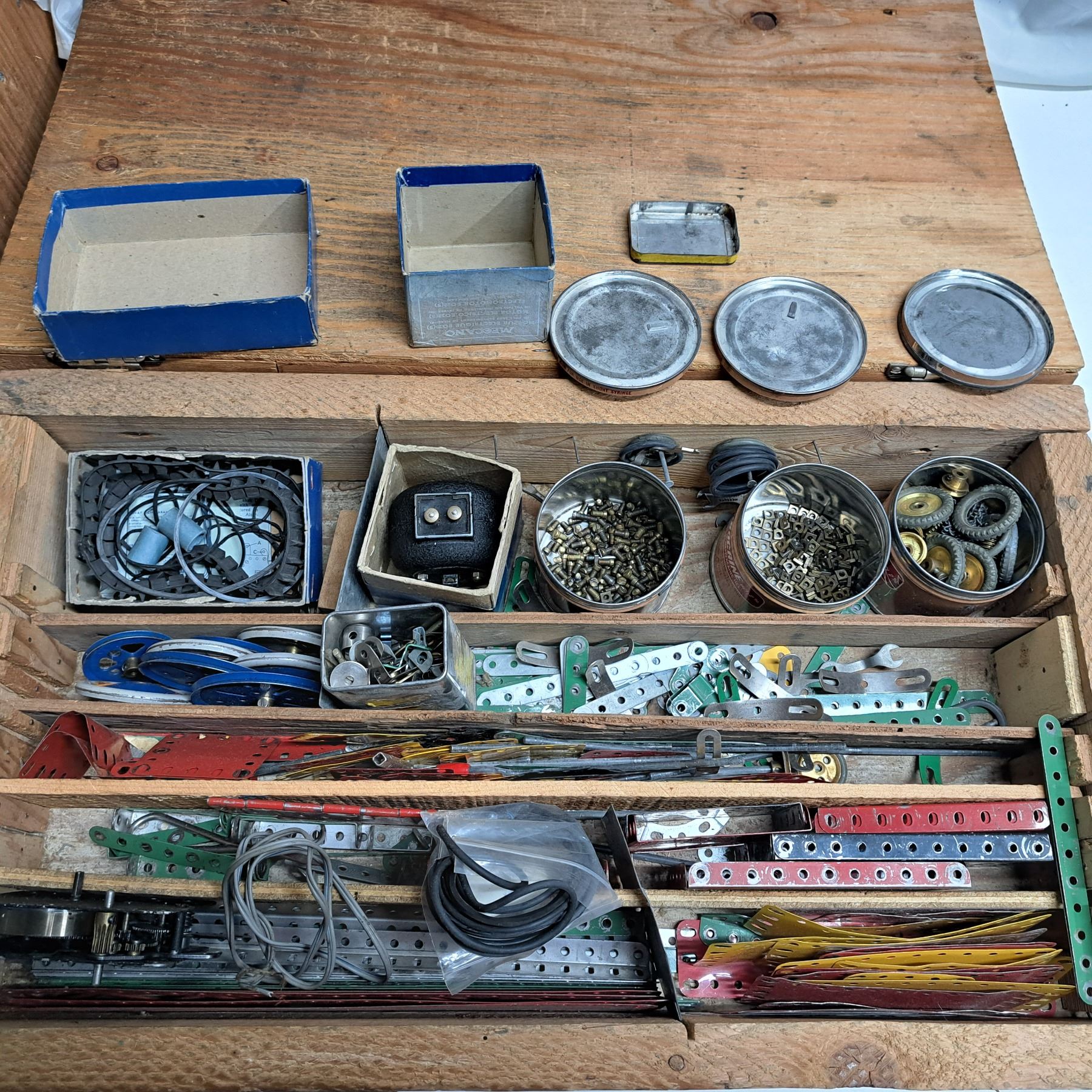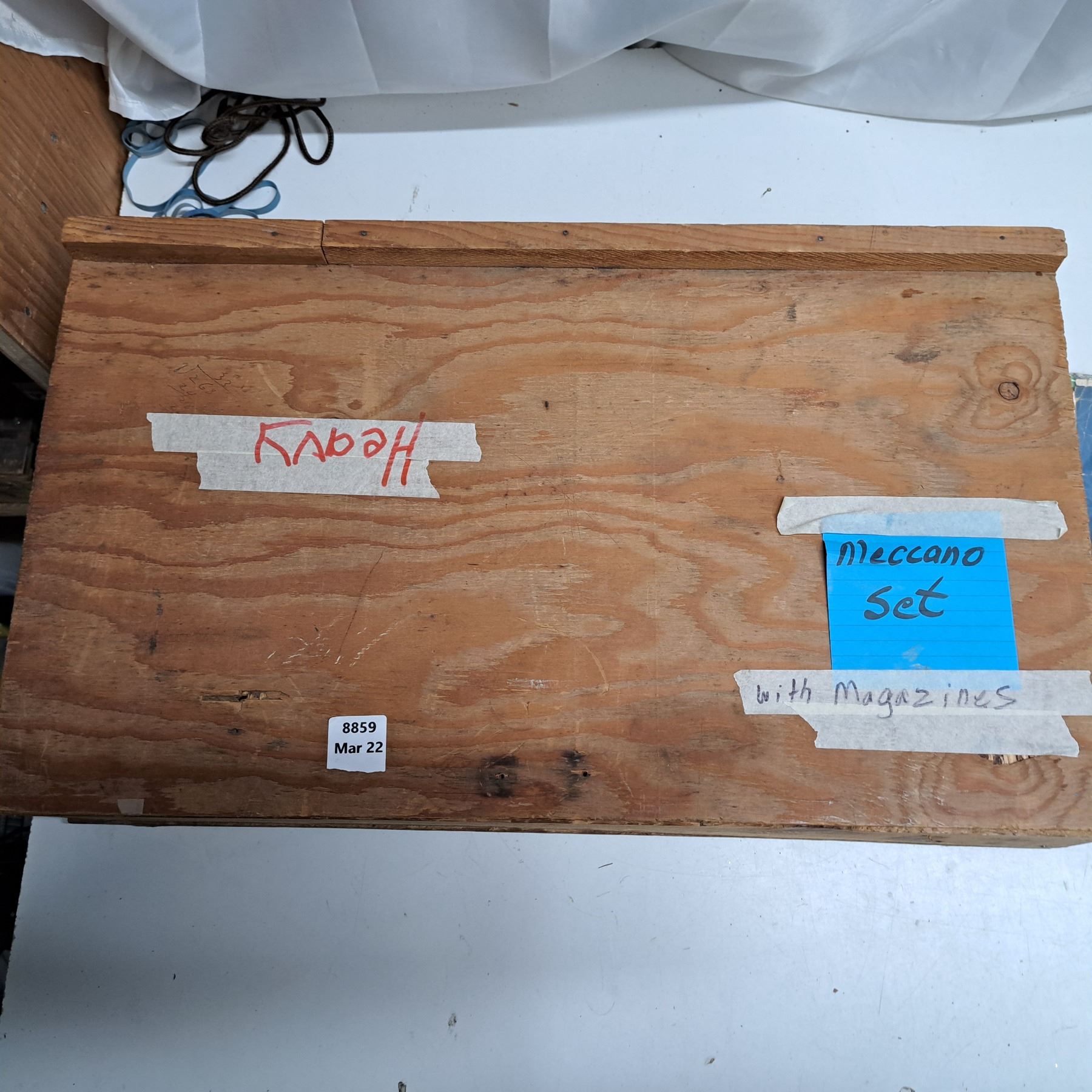 8 maccano magazines and maccano set of electric parts and metal parts in custom wood box