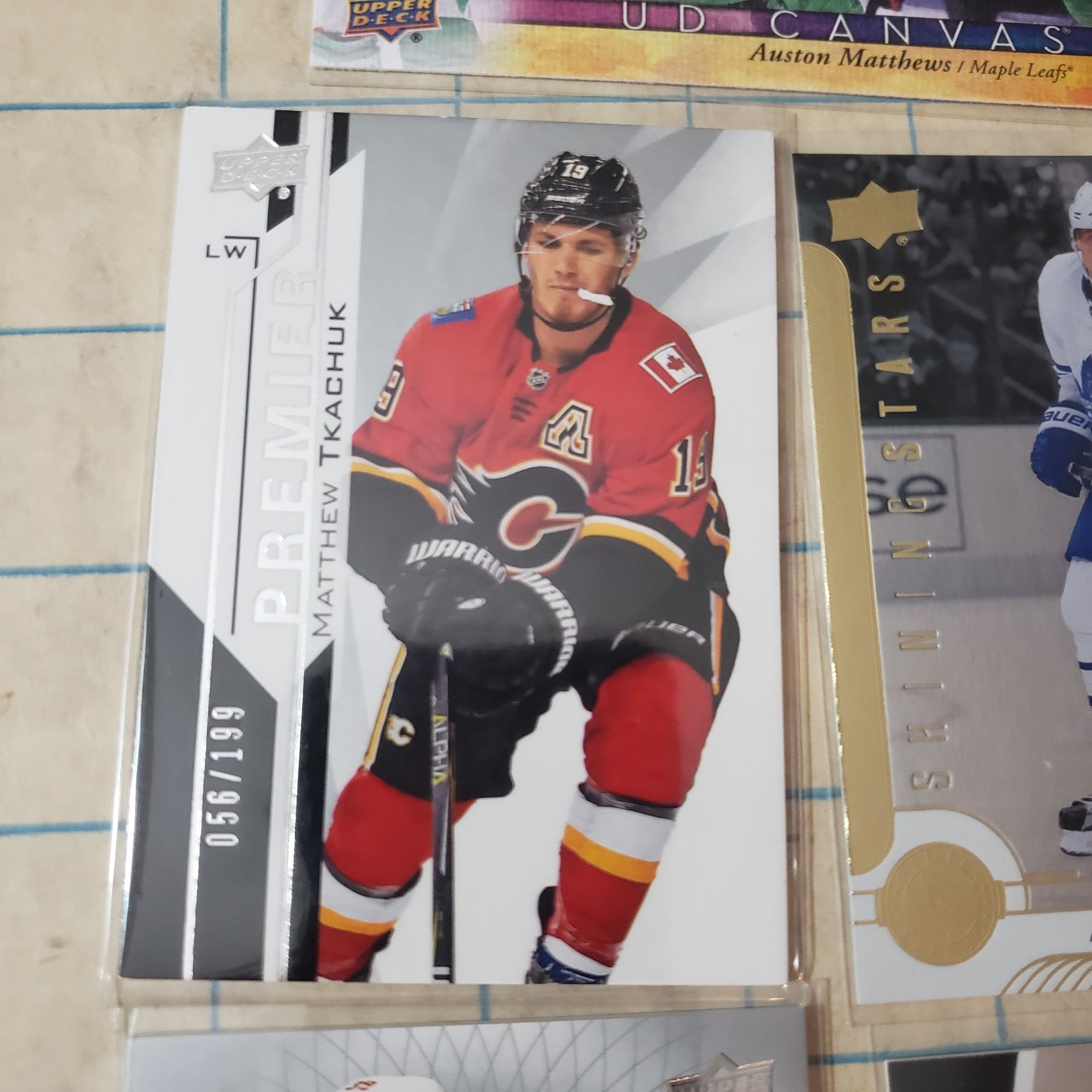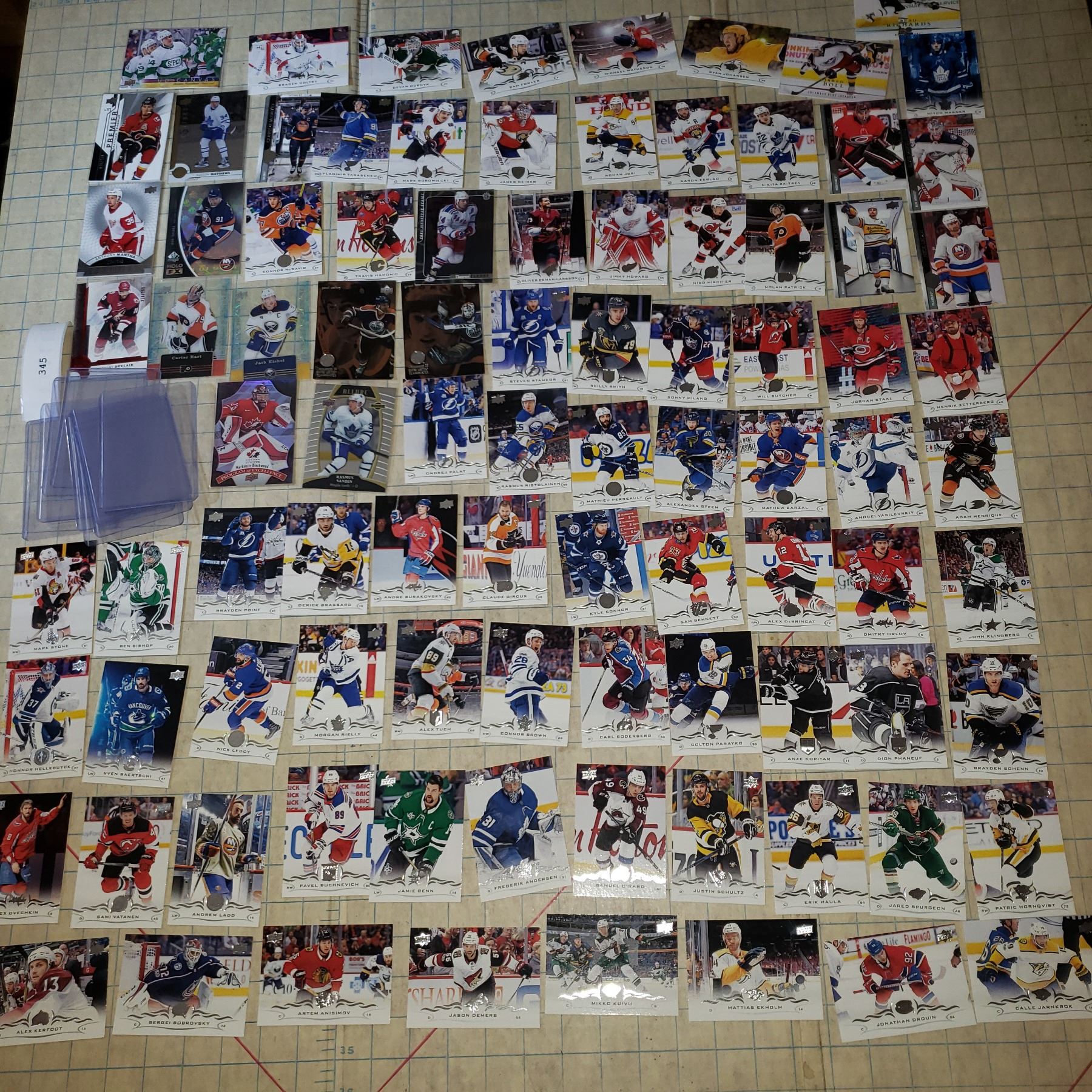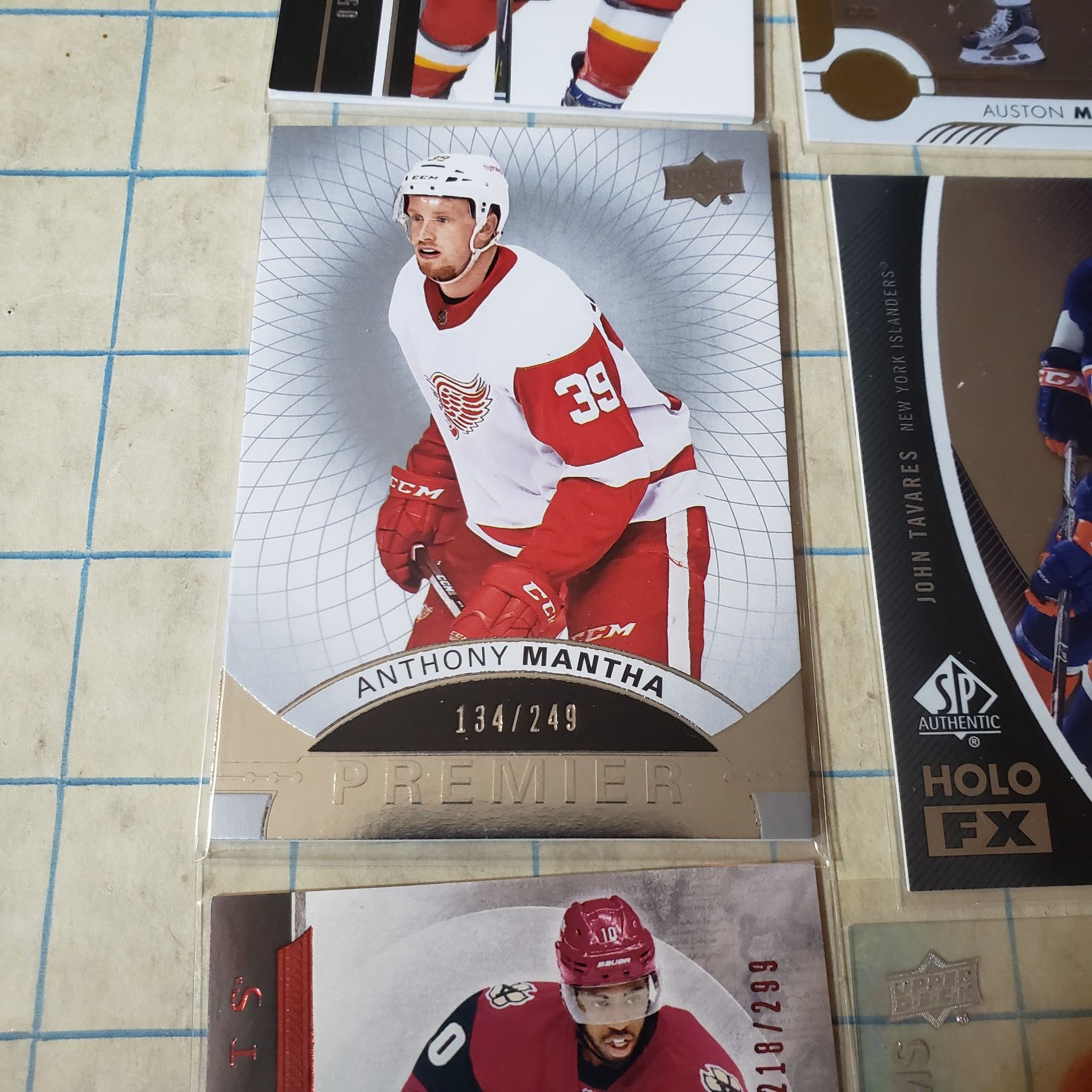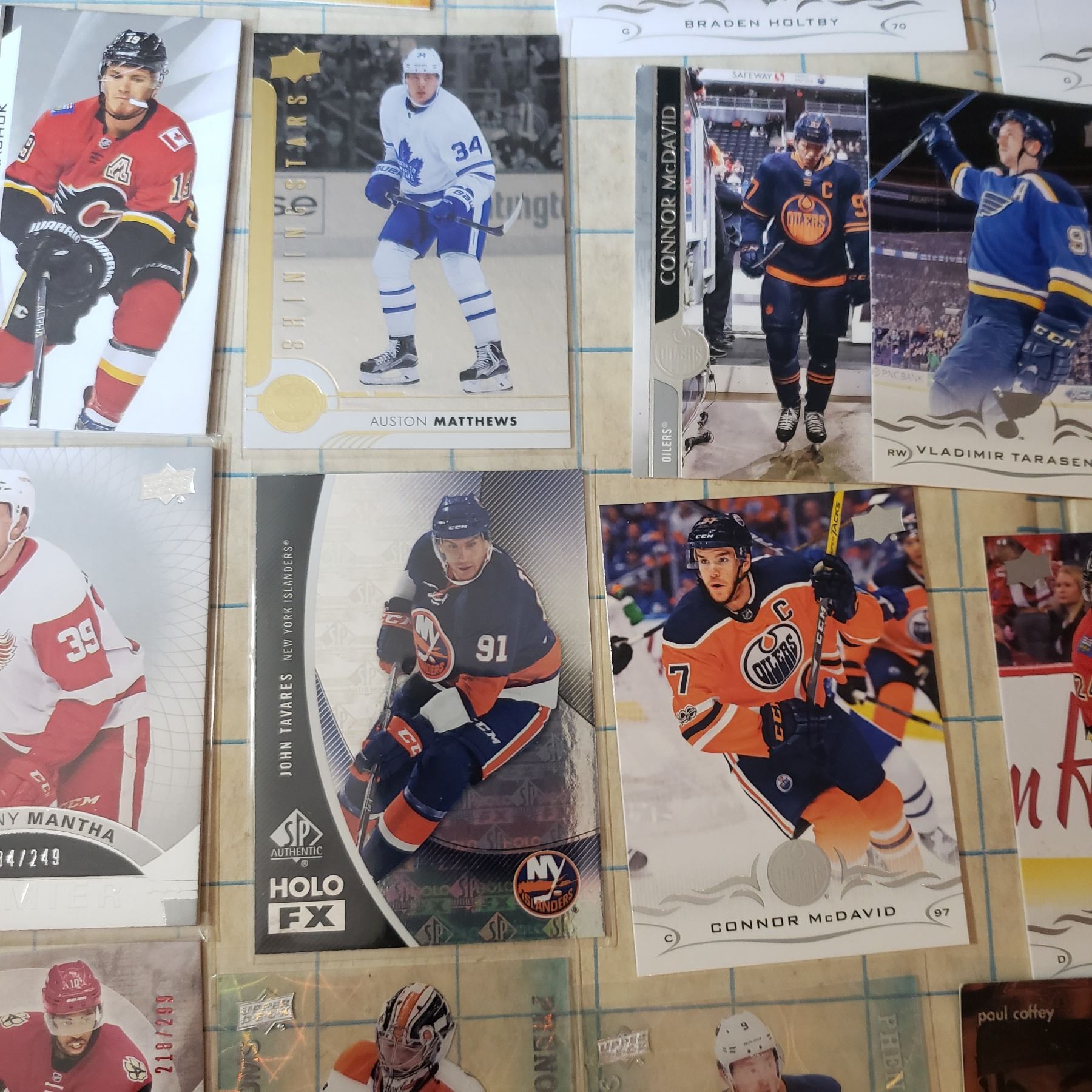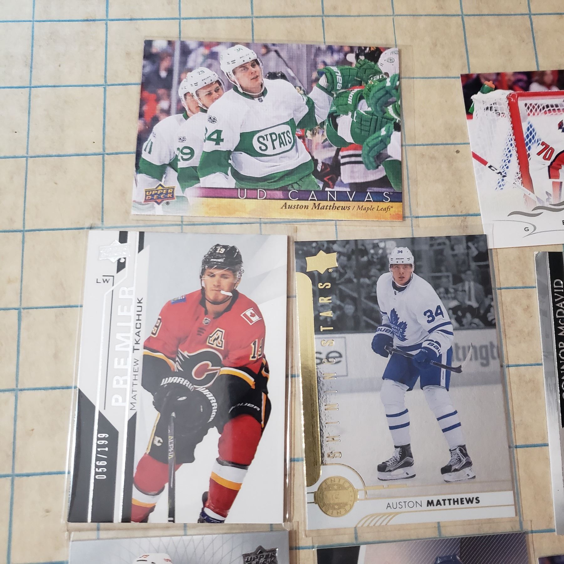 80+ Hockey Cards mostly modern 2000-current, 3 numbered cards Tkachuk /199 Mantha /249 Duclair /299 + some empty hard sleeves Connor McDavid, Auston Mattews, Tavares Holo FX, Carter Hart
