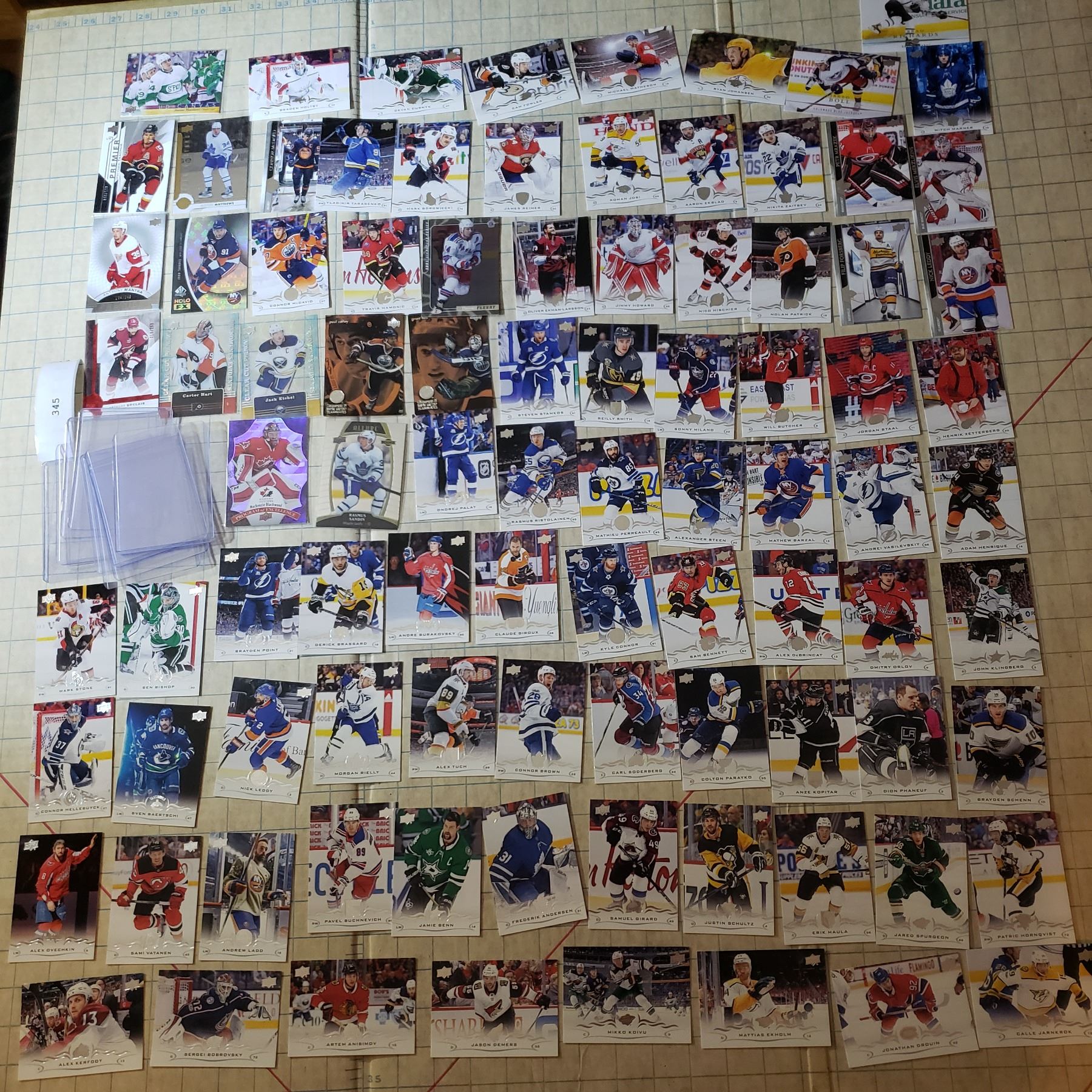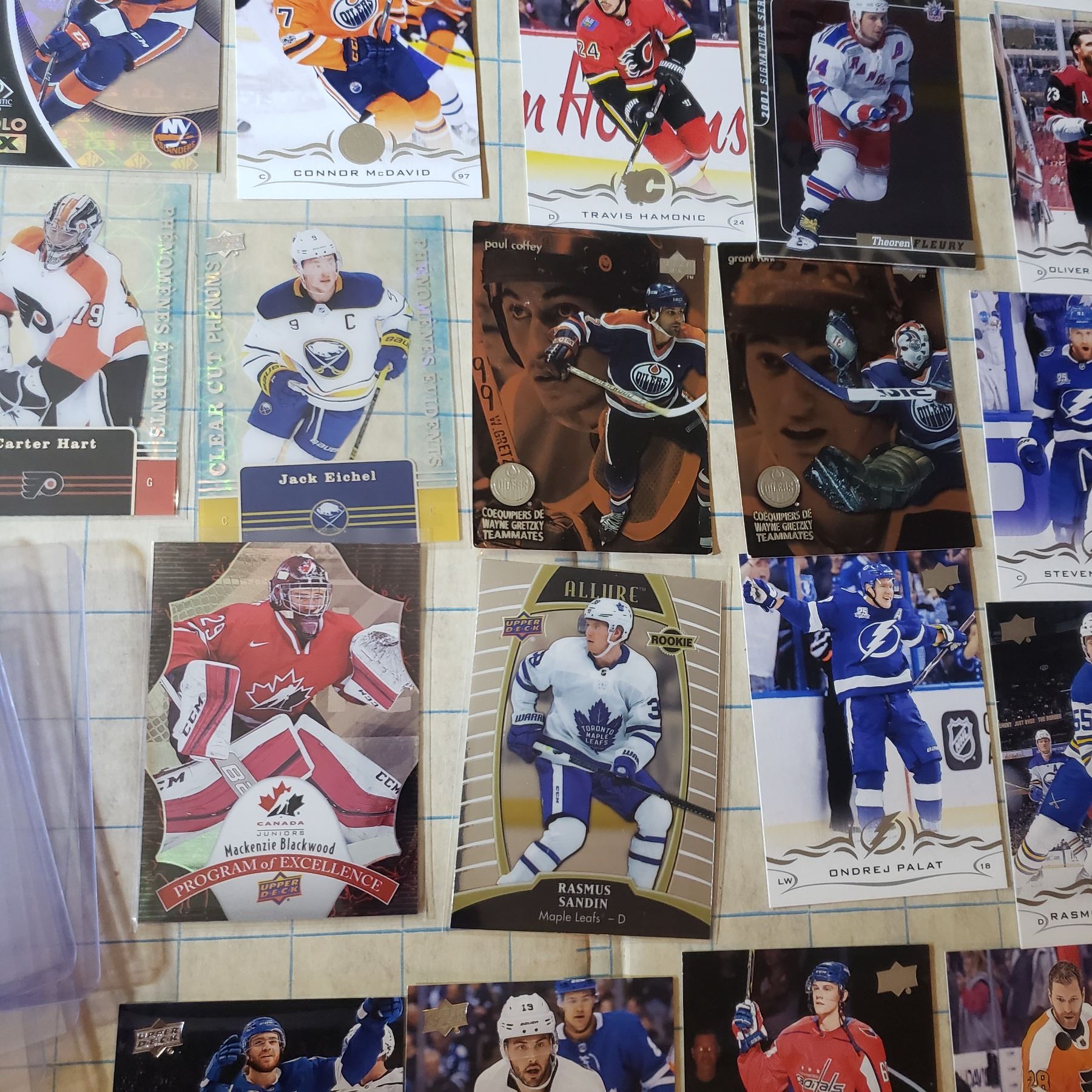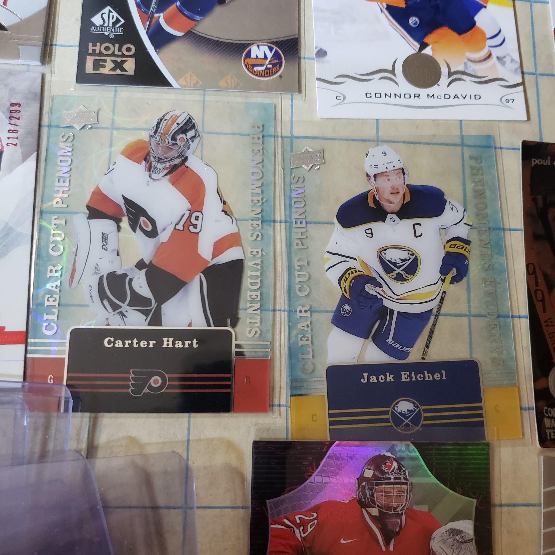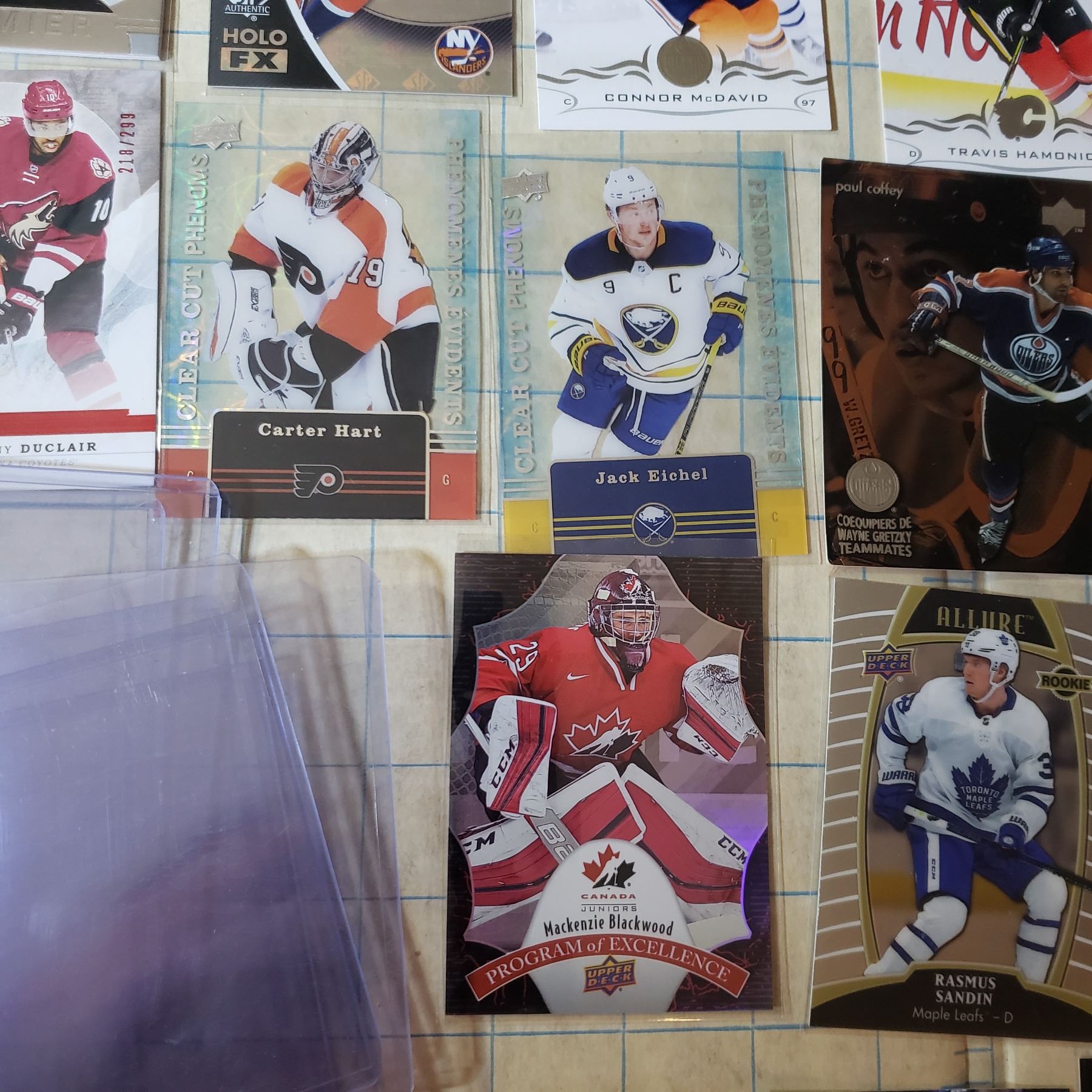 80+ Hockey Cards mostly modern 2000-current, 3 numbered cards Tkachuk /199 Mantha /249 Duclair /299 + some empty hard sleeves Connor McDavid, Auston Mattews, Tavares Holo FX, Carter Hart