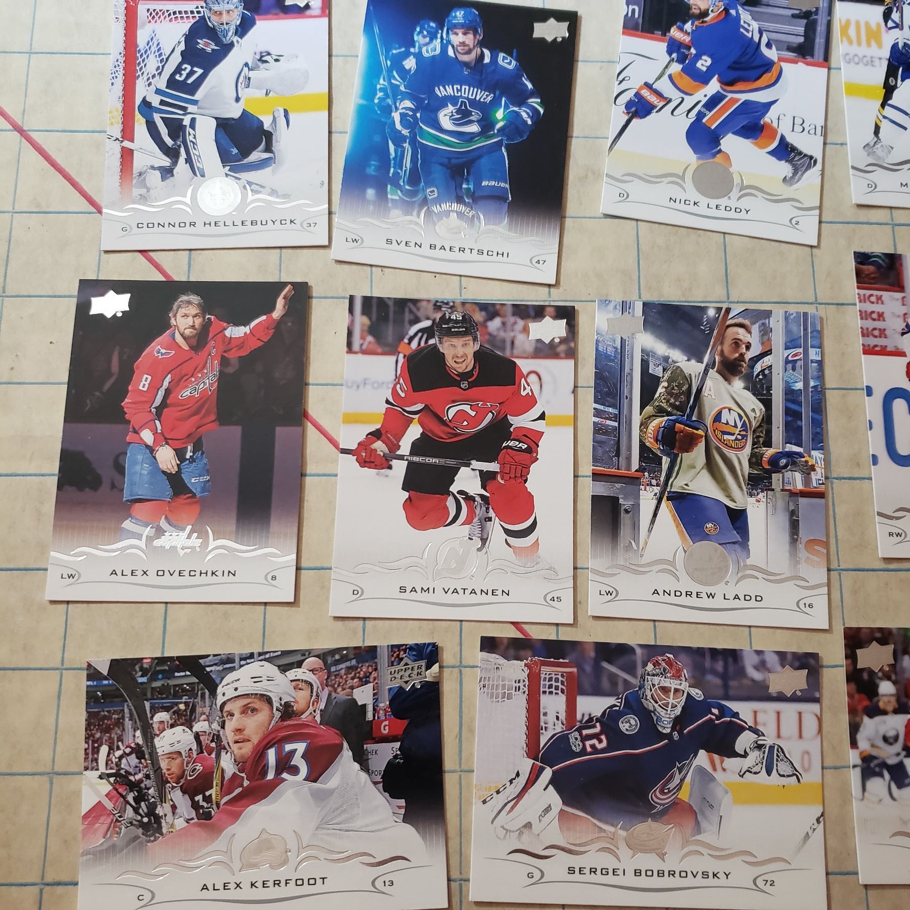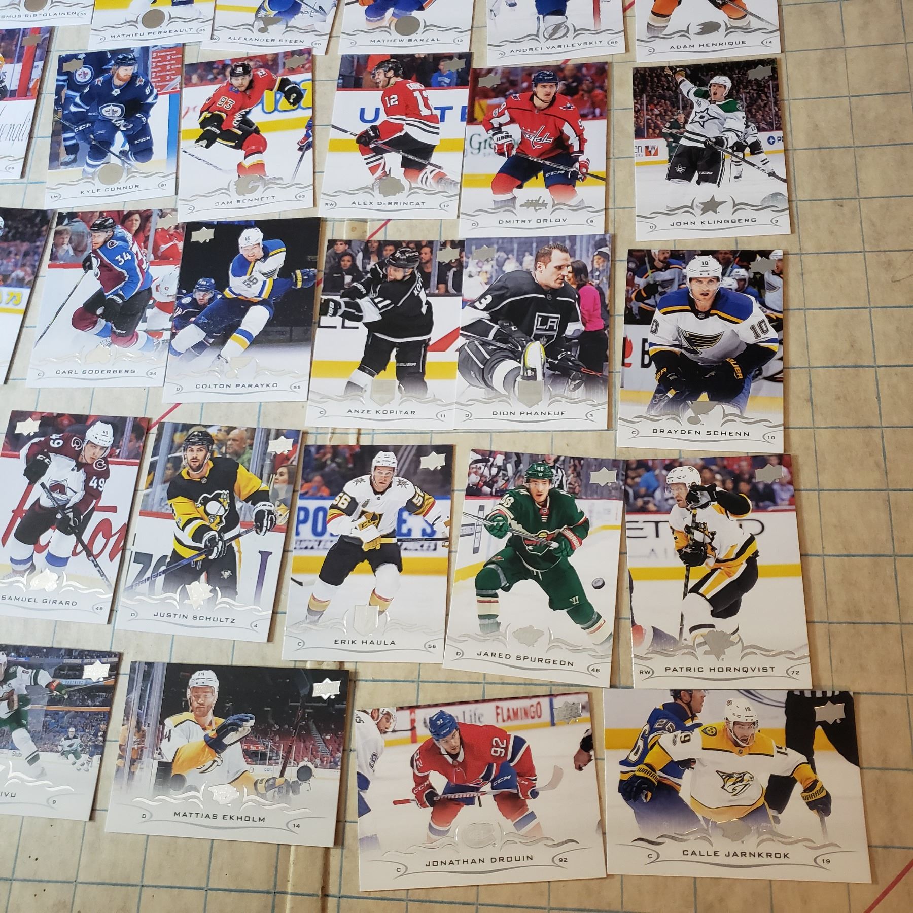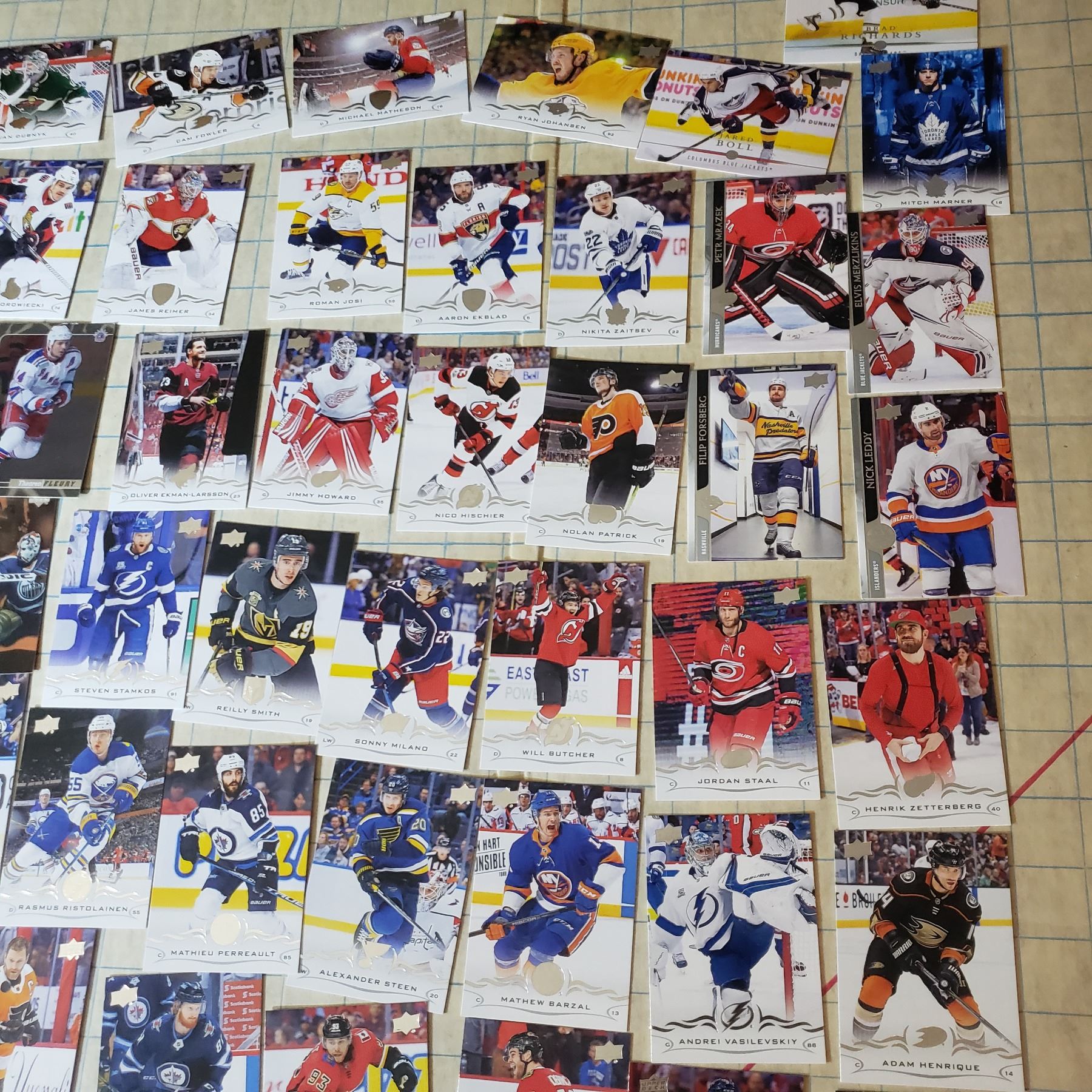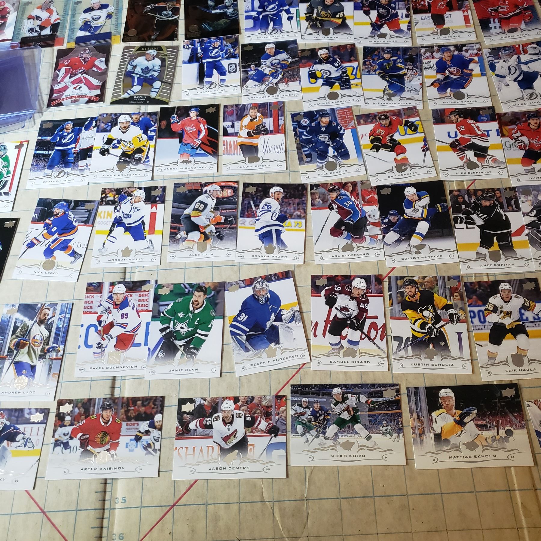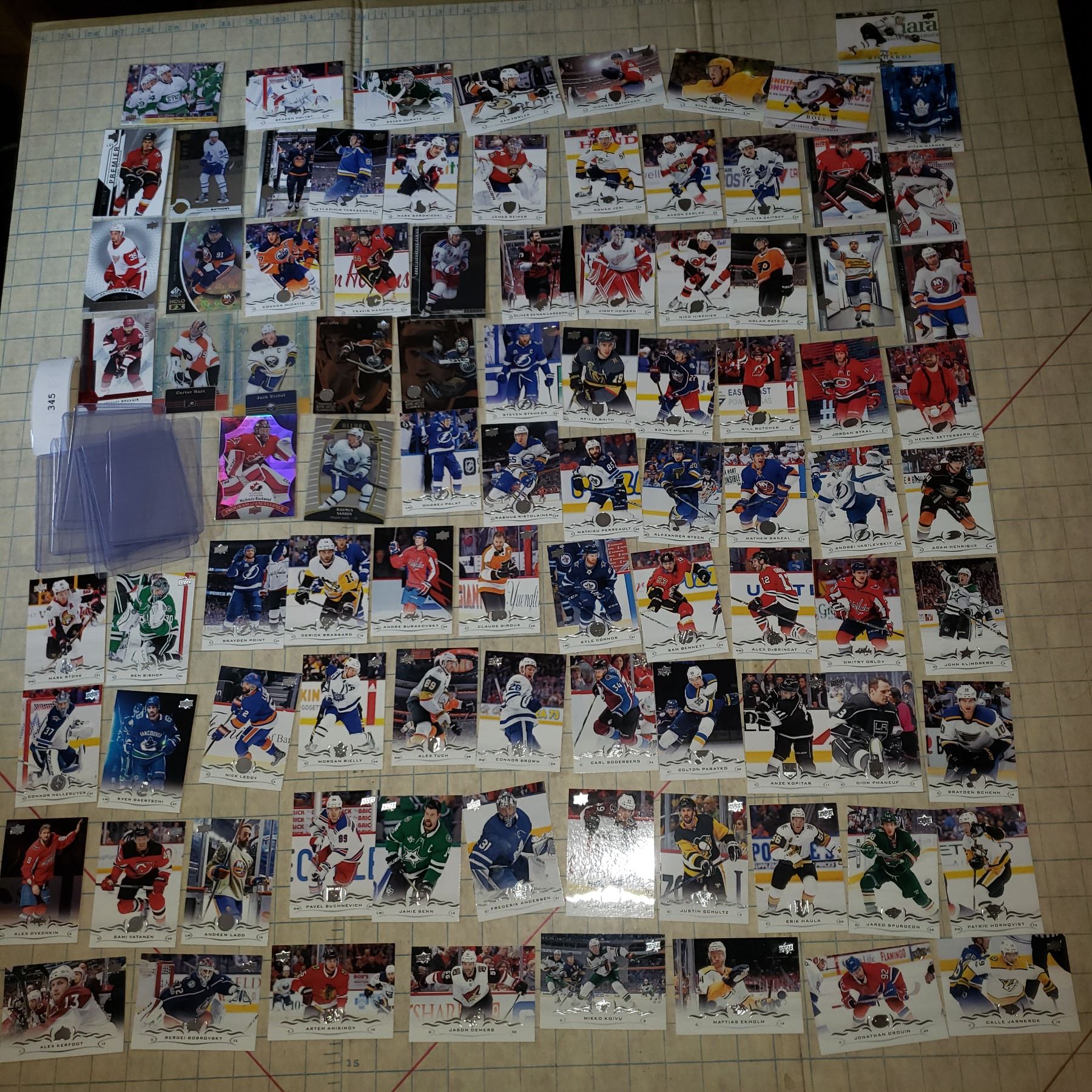 80+ Hockey Cards mostly modern 2000-current, 3 numbered cards Tkachuk /199 Mantha /249 Duclair /299 + some empty hard sleeves Connor McDavid, Auston Mattews, Tavares Holo FX, Carter Hart