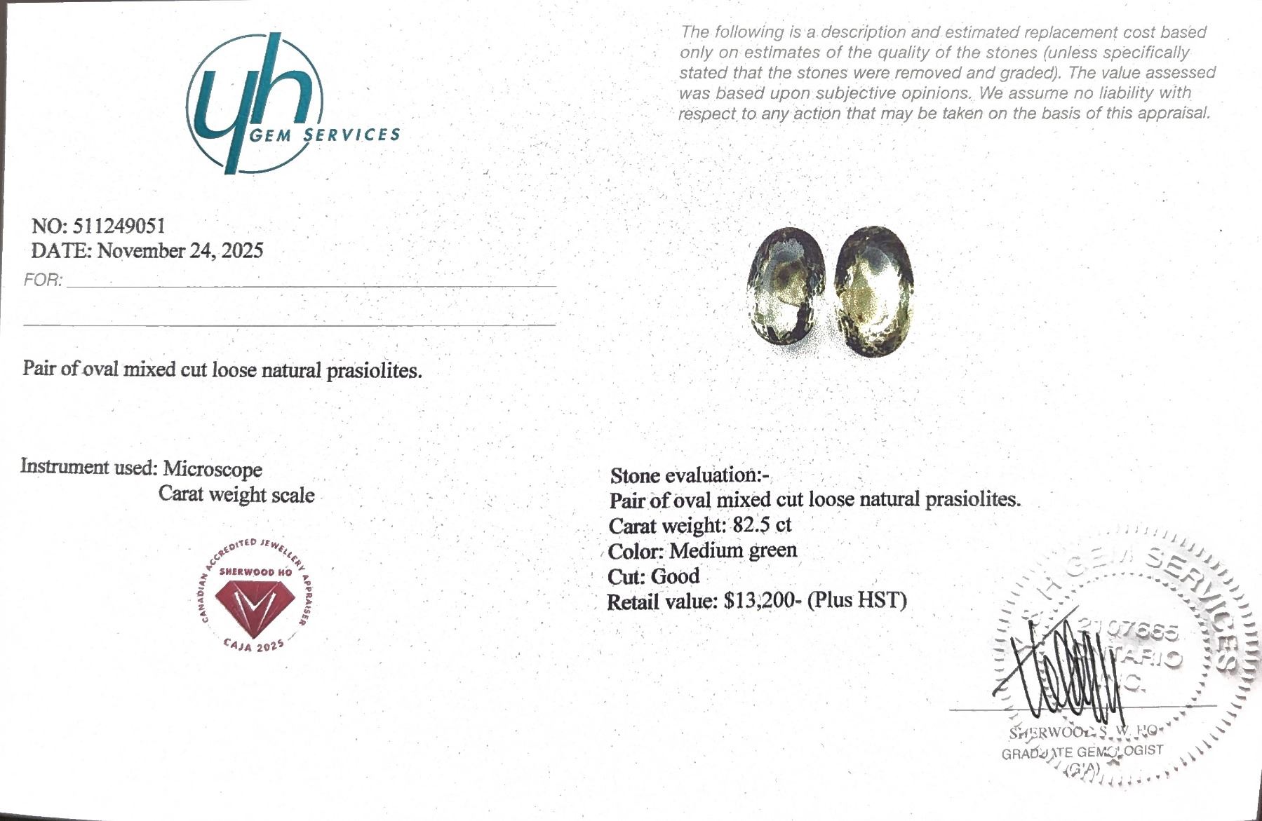 82.5 ct Certified Prasiolite gemstone Pair ($13,200 Appraisal)