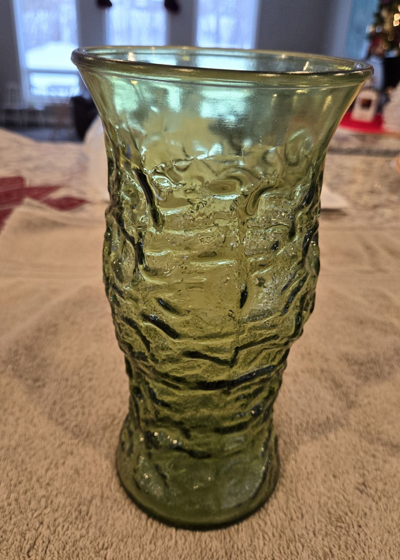 865 - Vintage E.O. Brody Co. Cleveland Ohio green crinkle glass vase. 9 1/2" tall. No chips or cracks.
