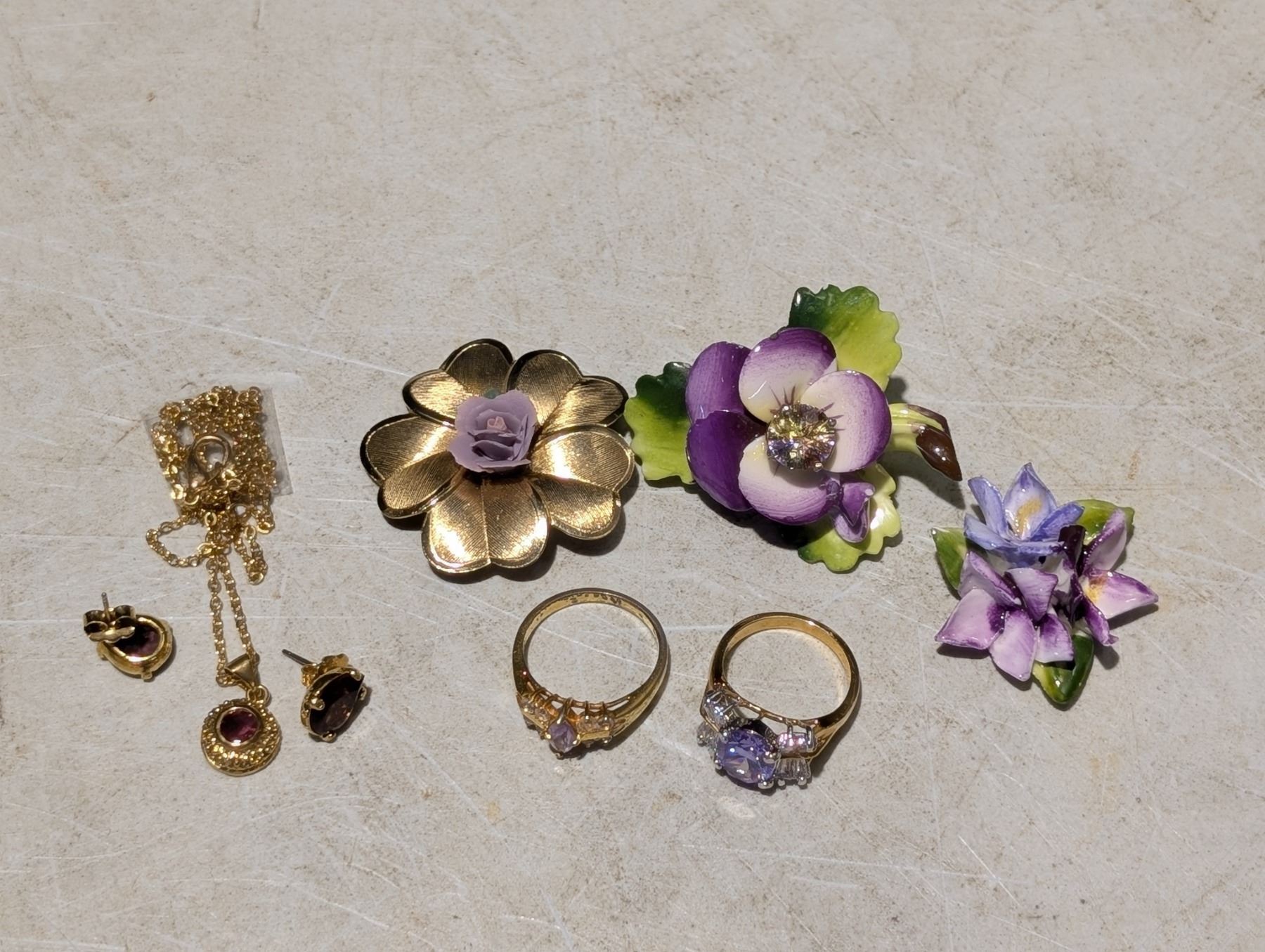 9.5" Necklace, Purple Stone Earrings, Porcelain Flower Brooch, 2 Gem Rings