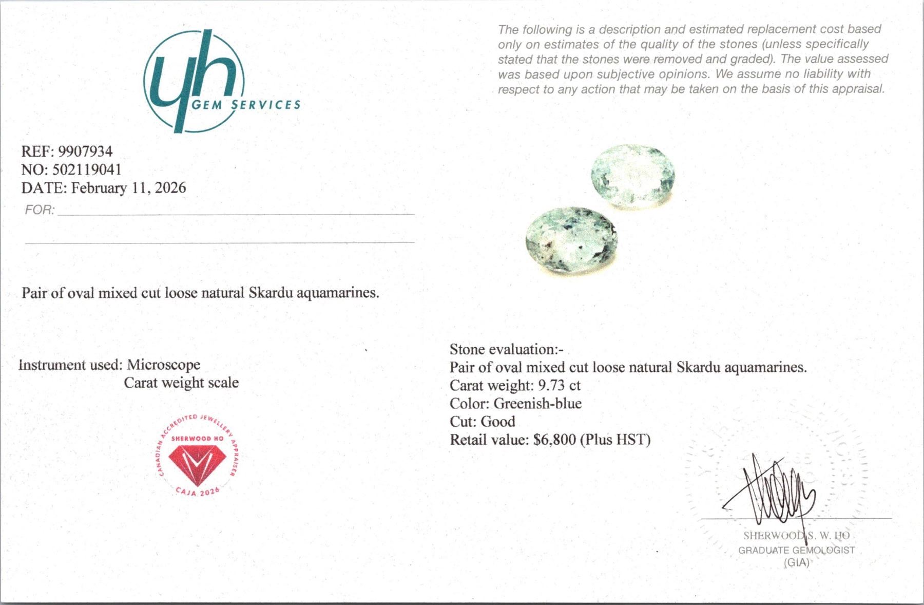 9.73 ct Certified Skardu Aquamarine gemstone Pair ($6,800 Appraisal)