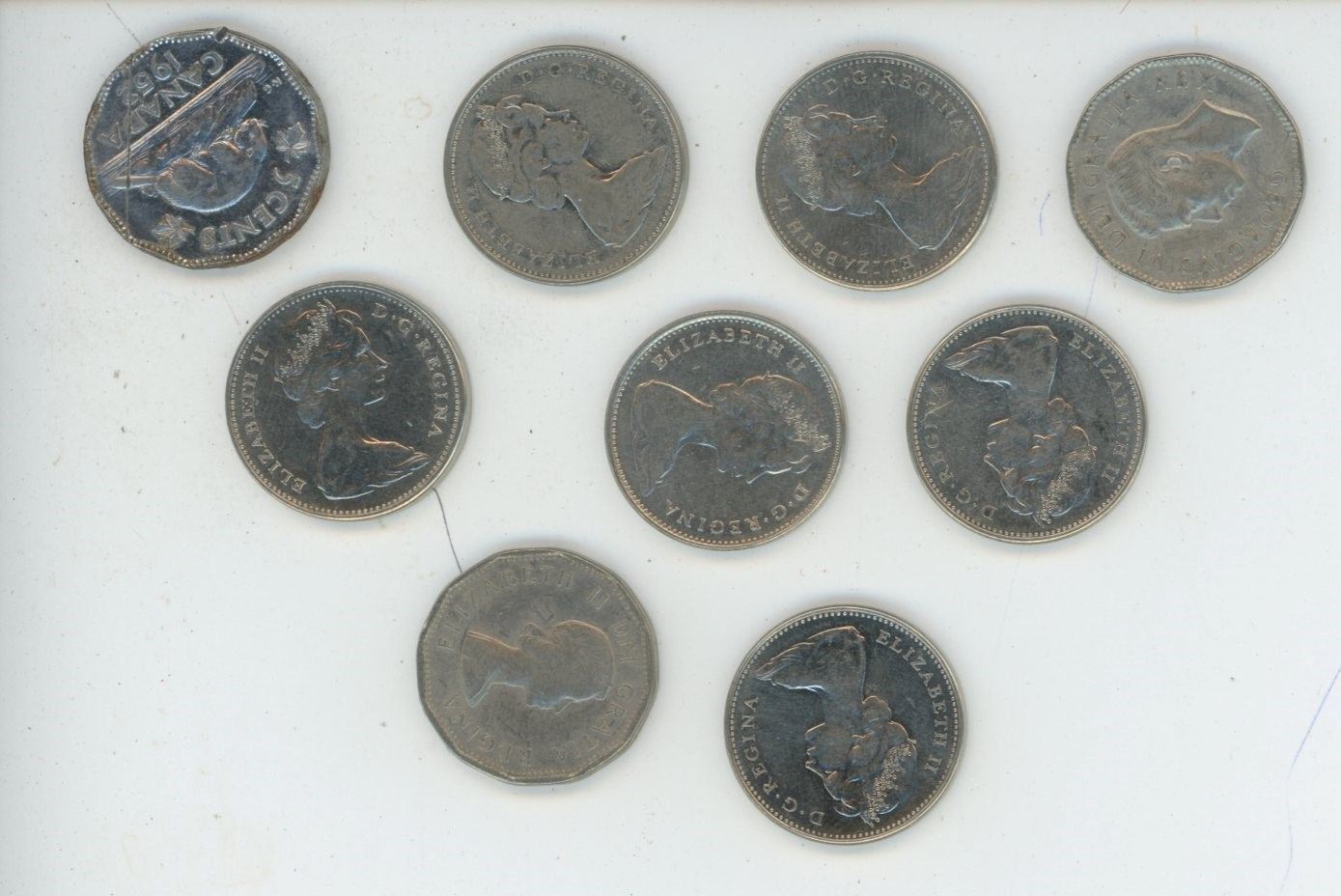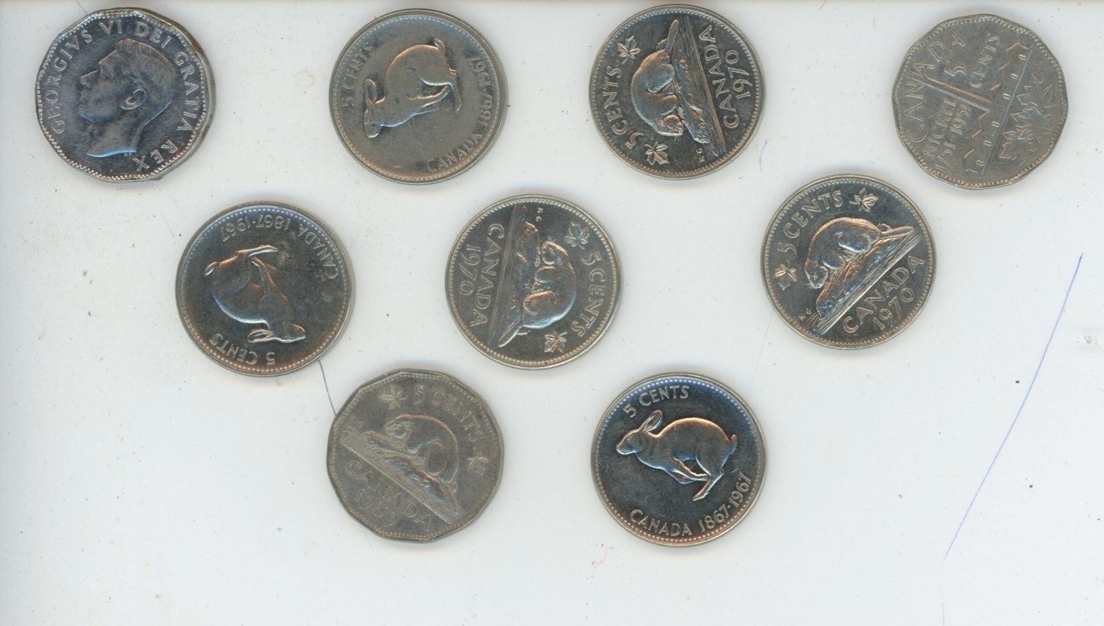 9 Canada 5¢ - 3 1967 Centenial, 3 1970 Round, 2 Flat Sides 1952 & 1959