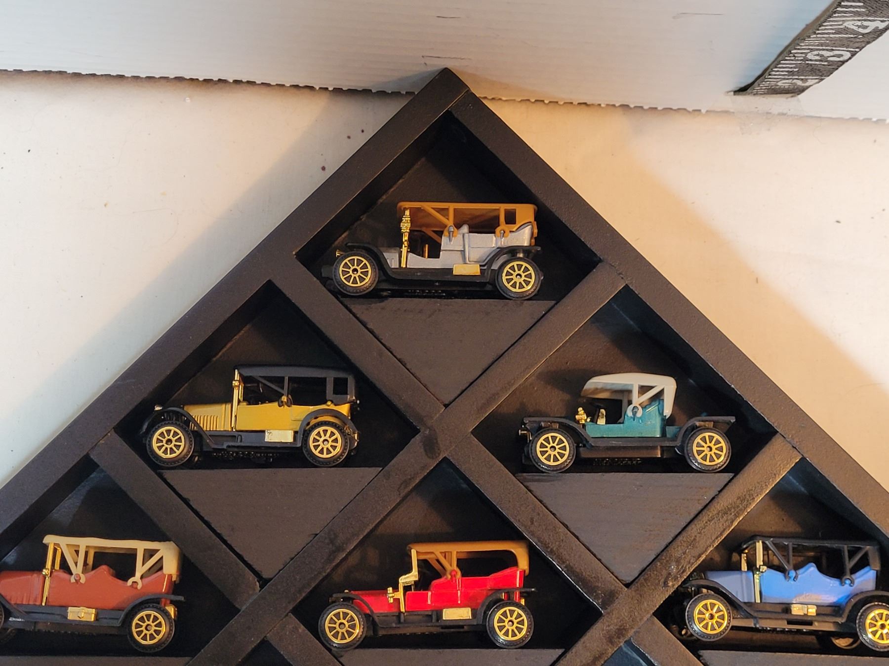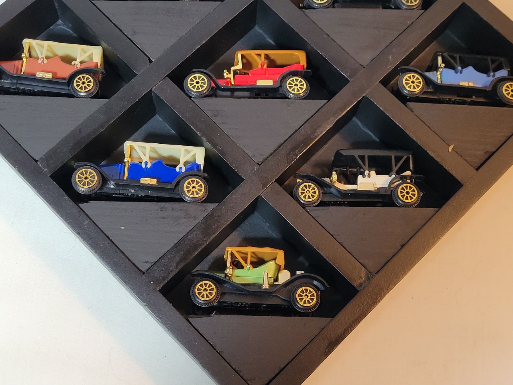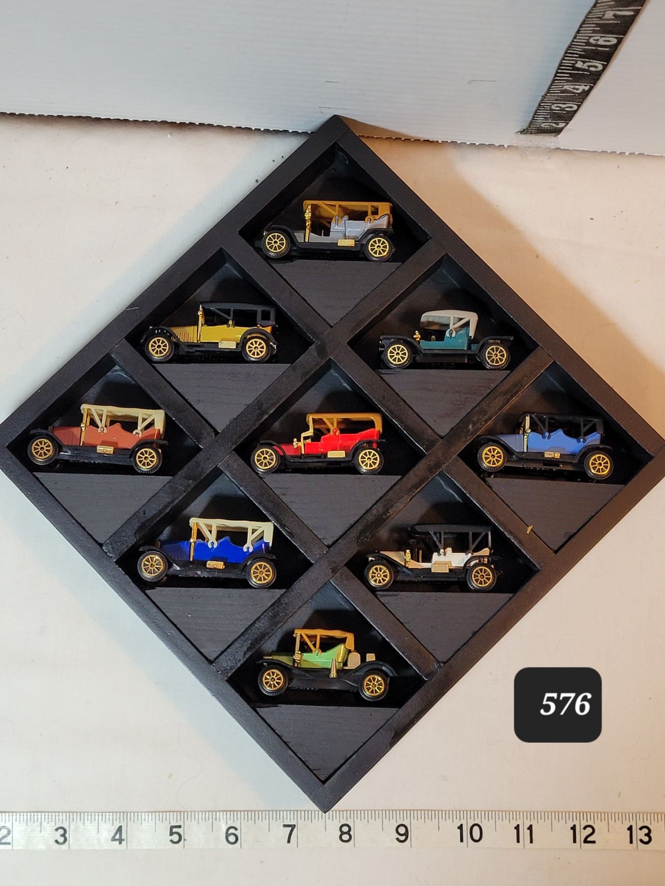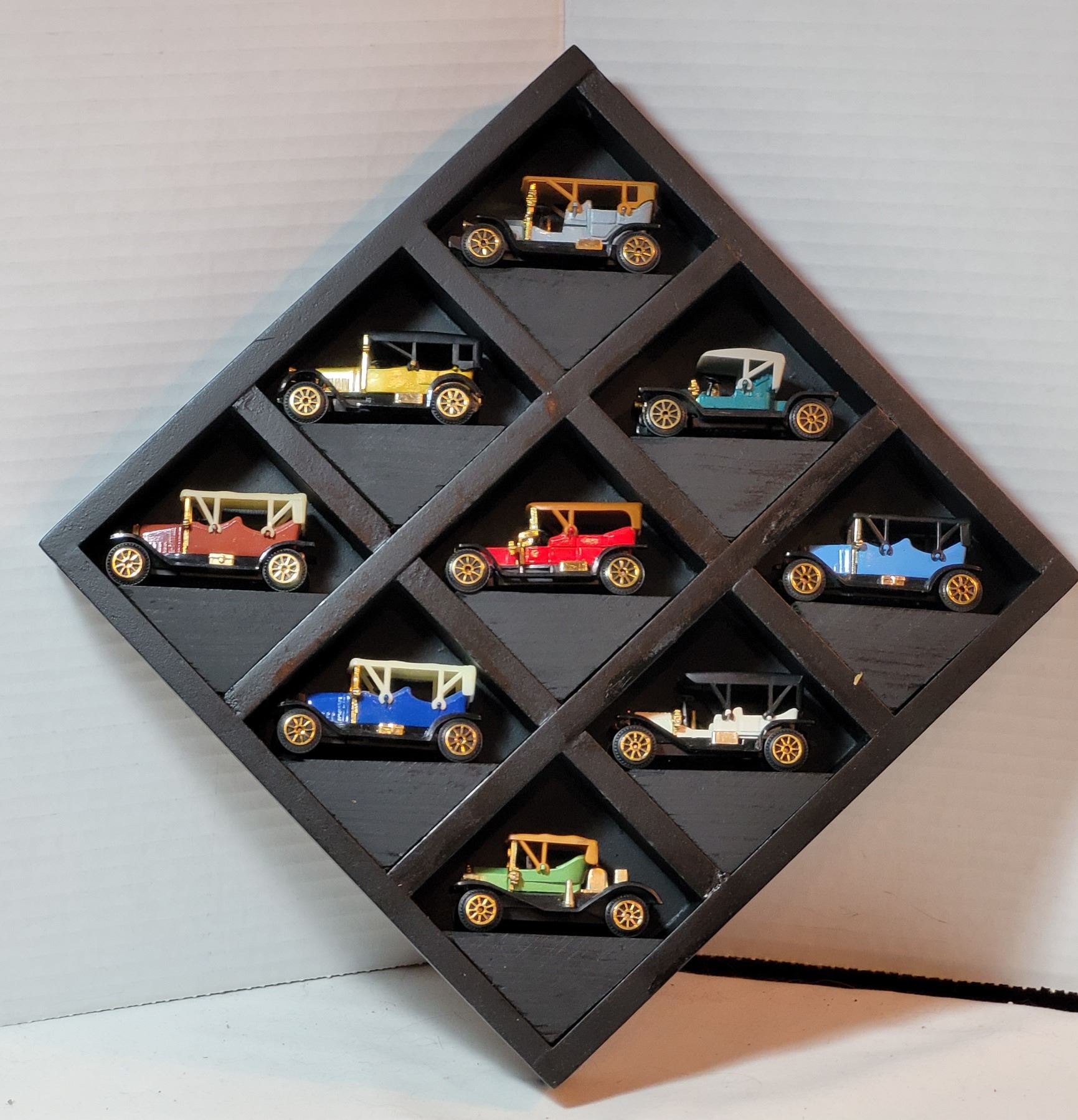 9 die cast cars in display.