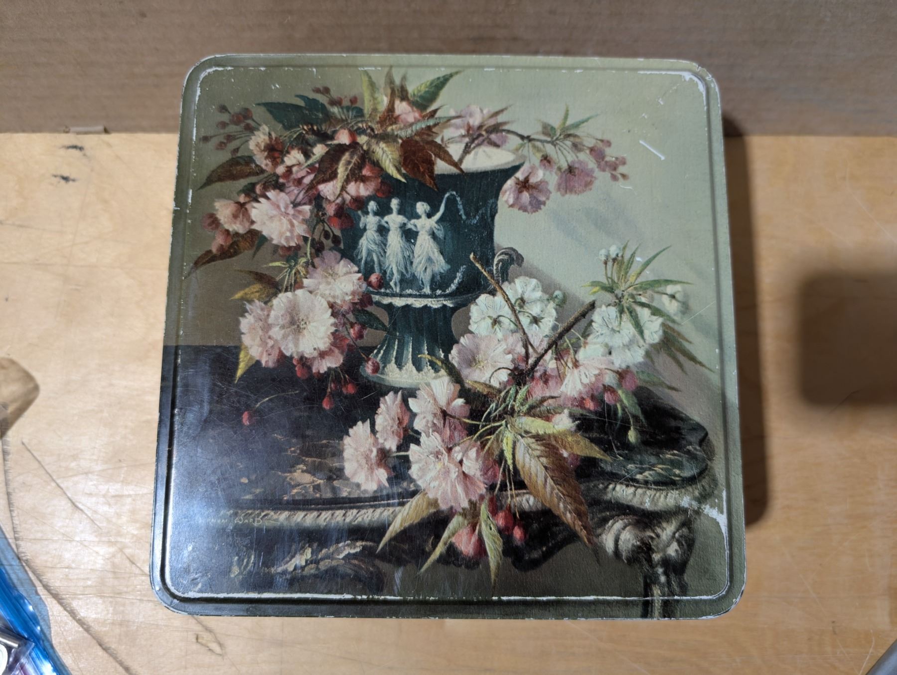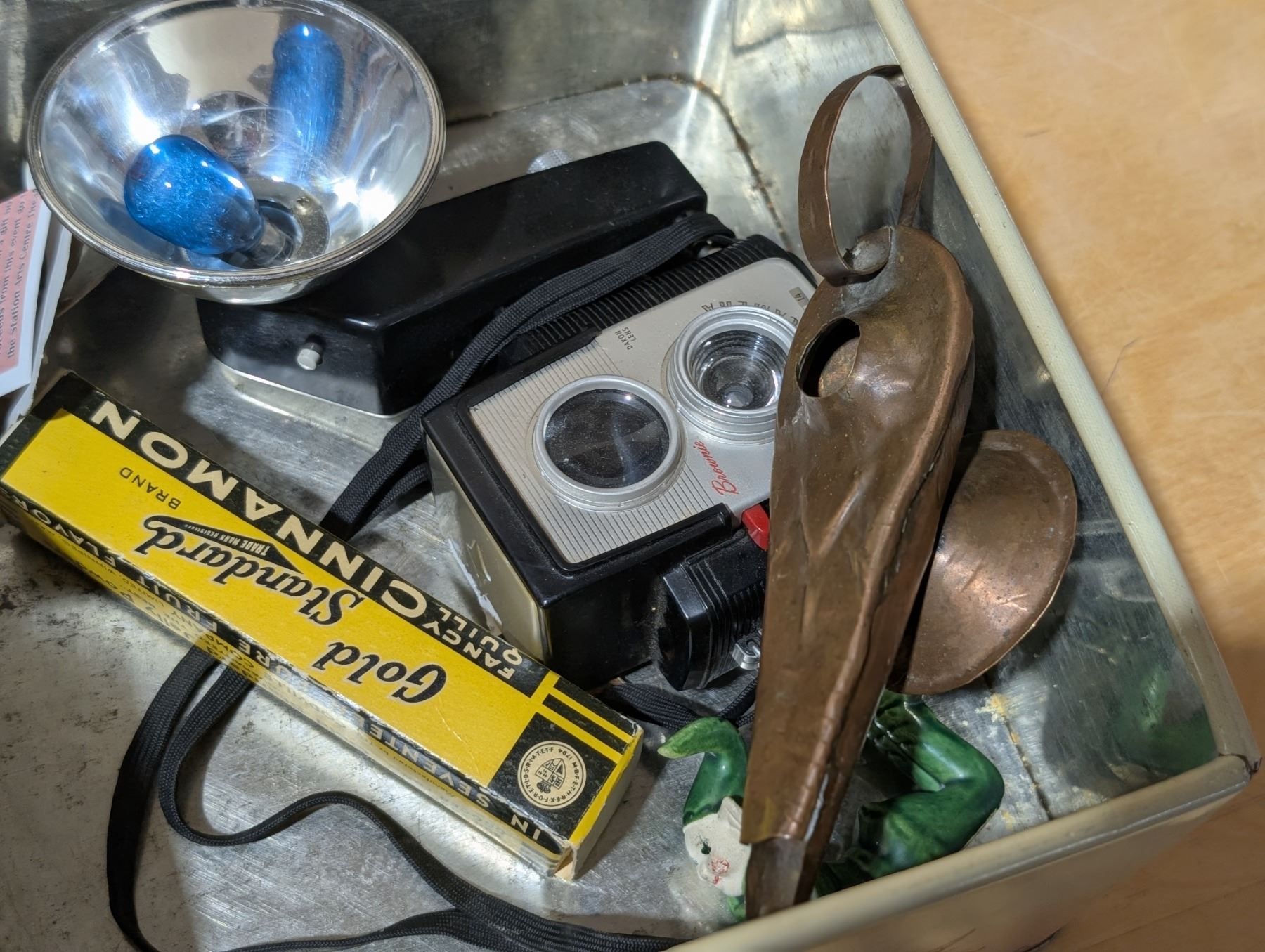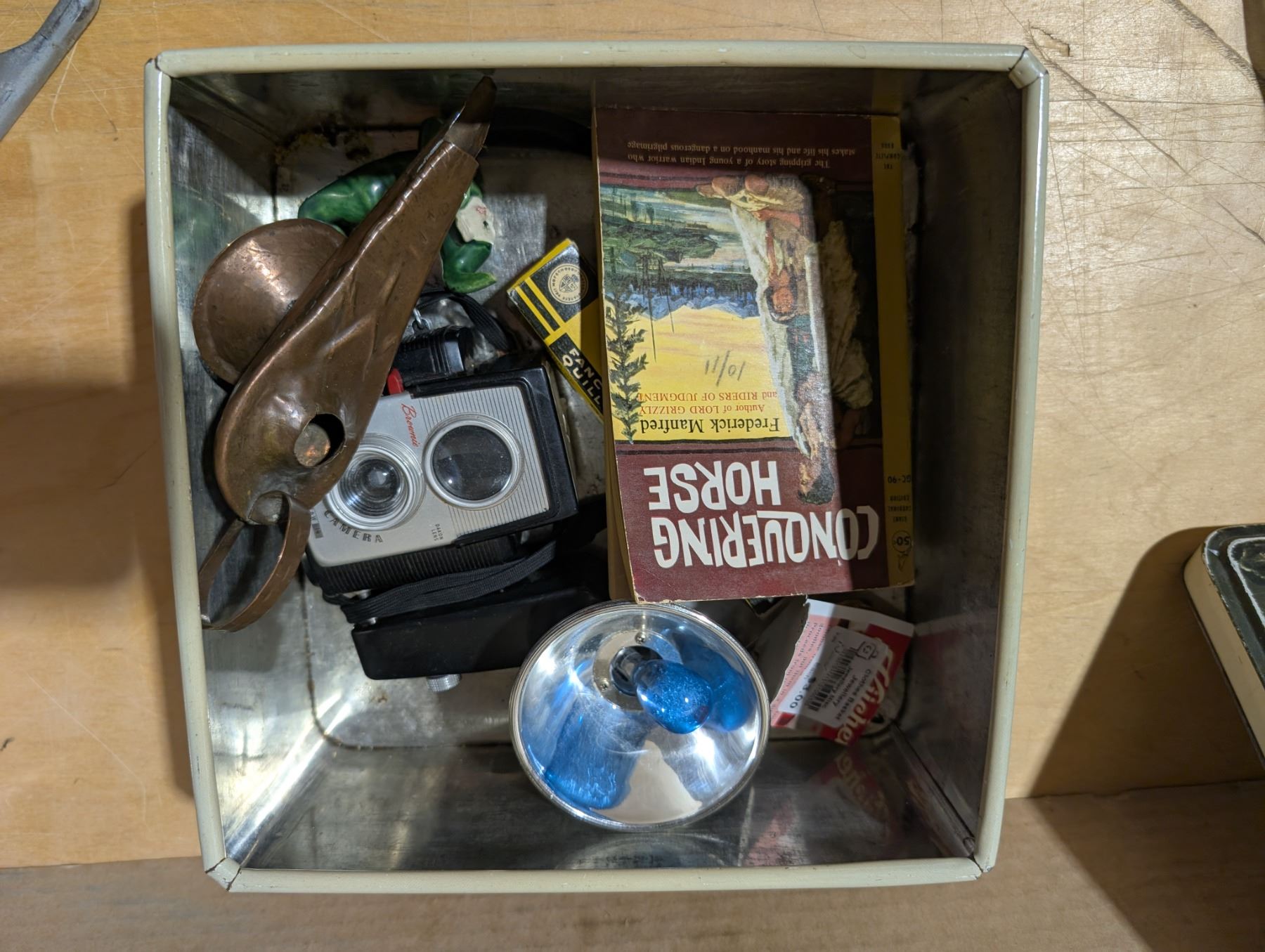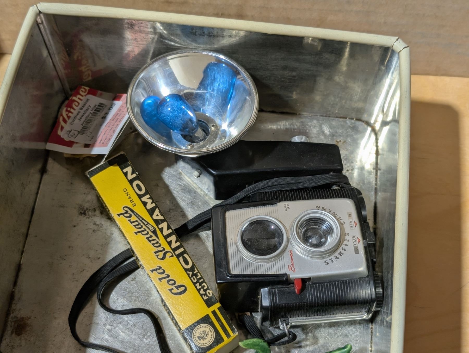 9"x9"x4" Tin w/ Misc. Vintage Items