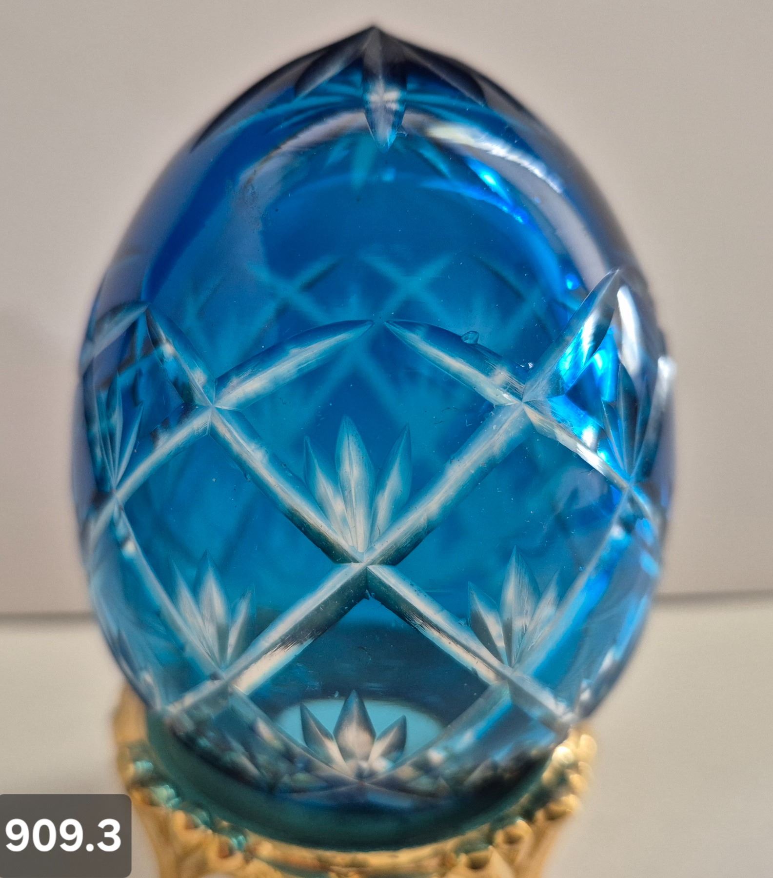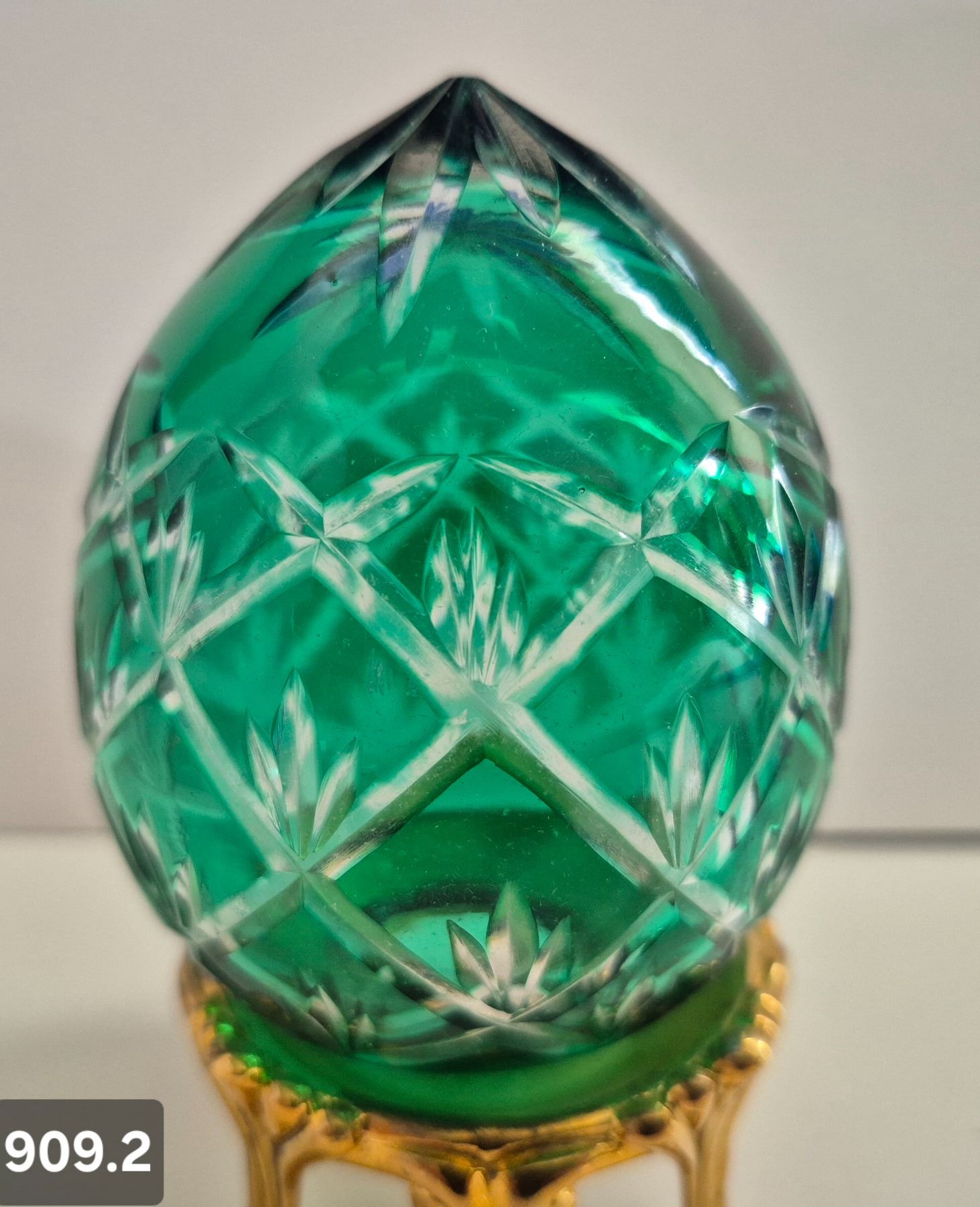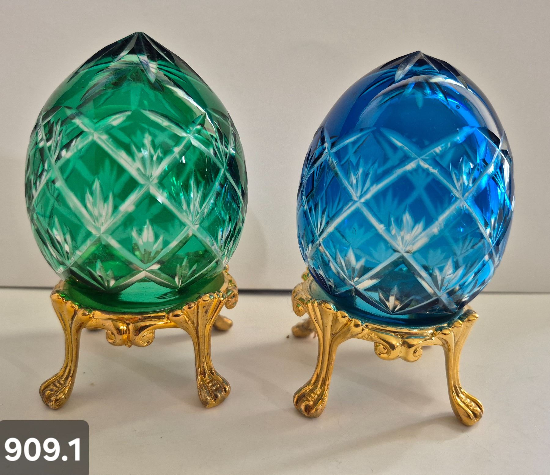 909. Pair of Bohemian cut glass MCM eggs - 24k gold-plated stand, from a large collection