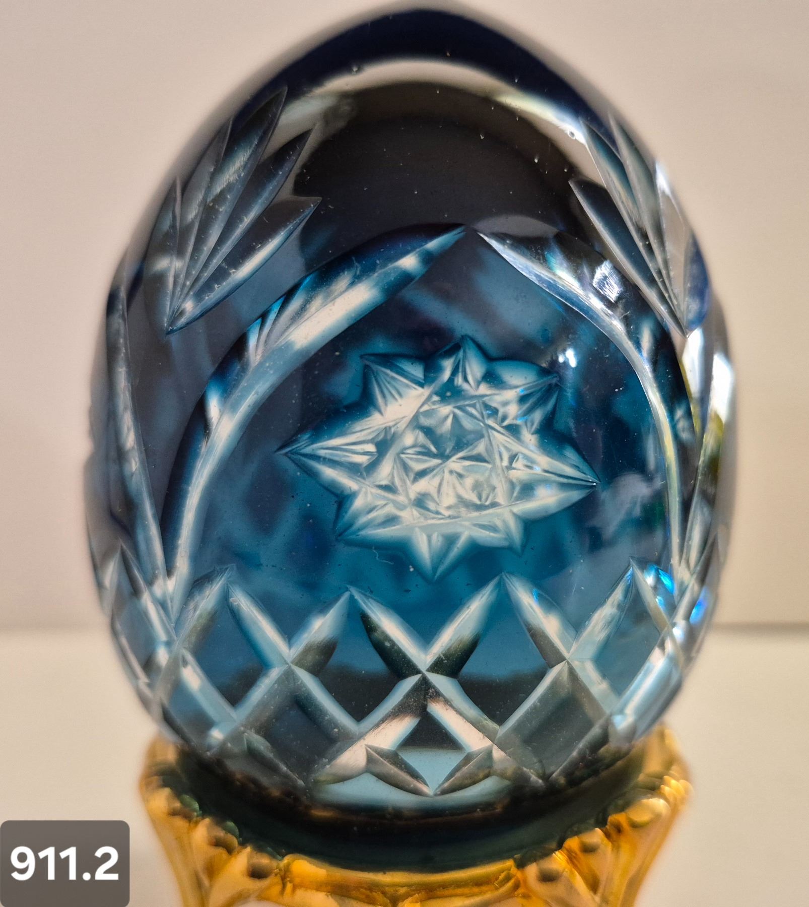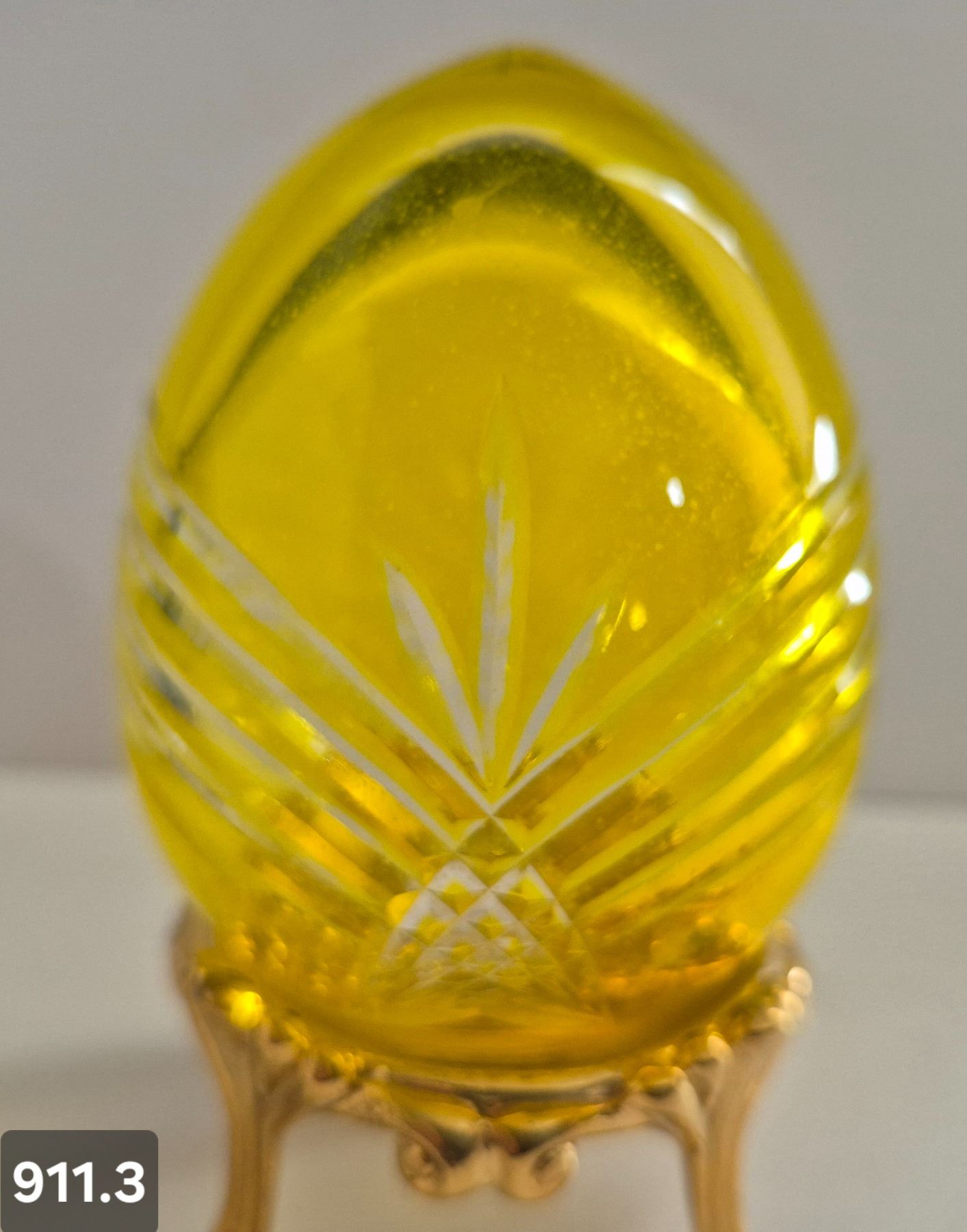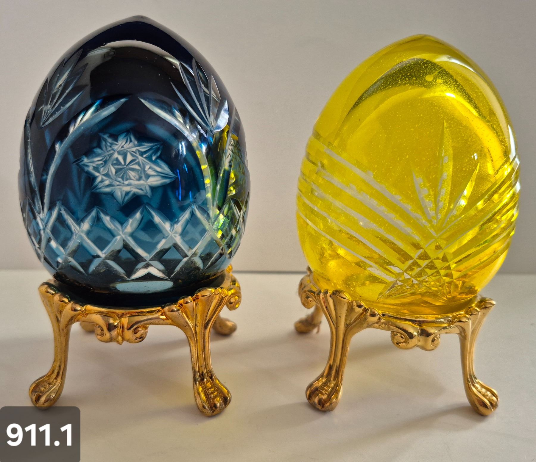 911. Pair of Bohemian cut glass MCM eggs - 24k gold-plated stand, from a large collection
