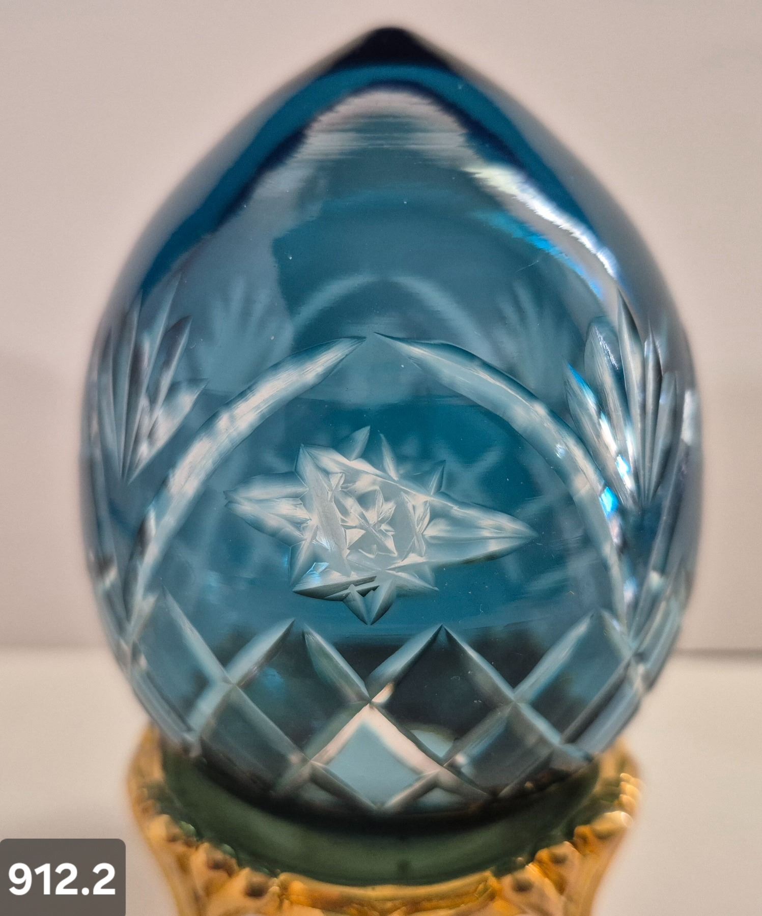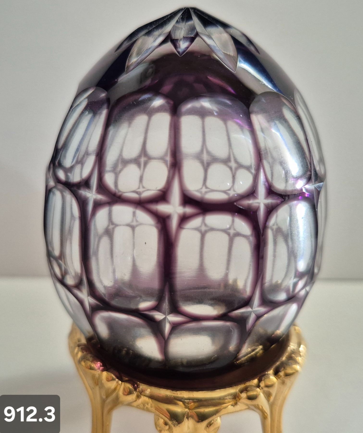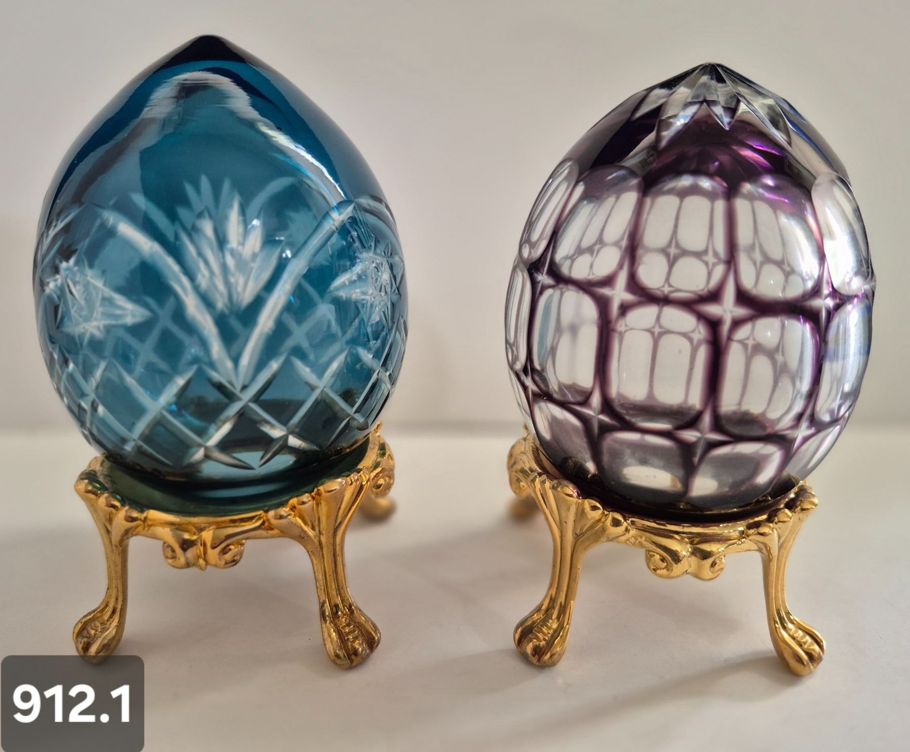 912. Pair of Bohemian cut glass MCM eggs - 24k gold-plated stand, from a large collection