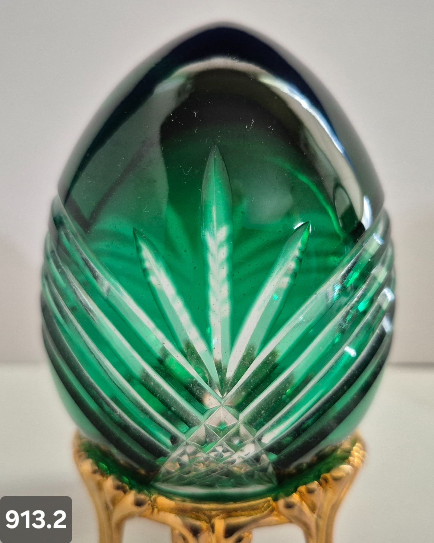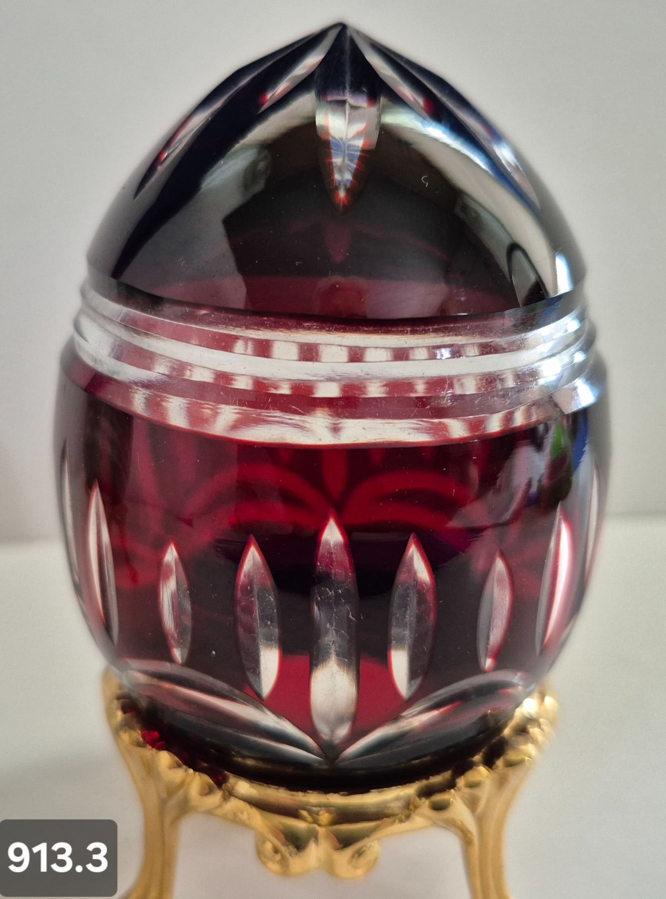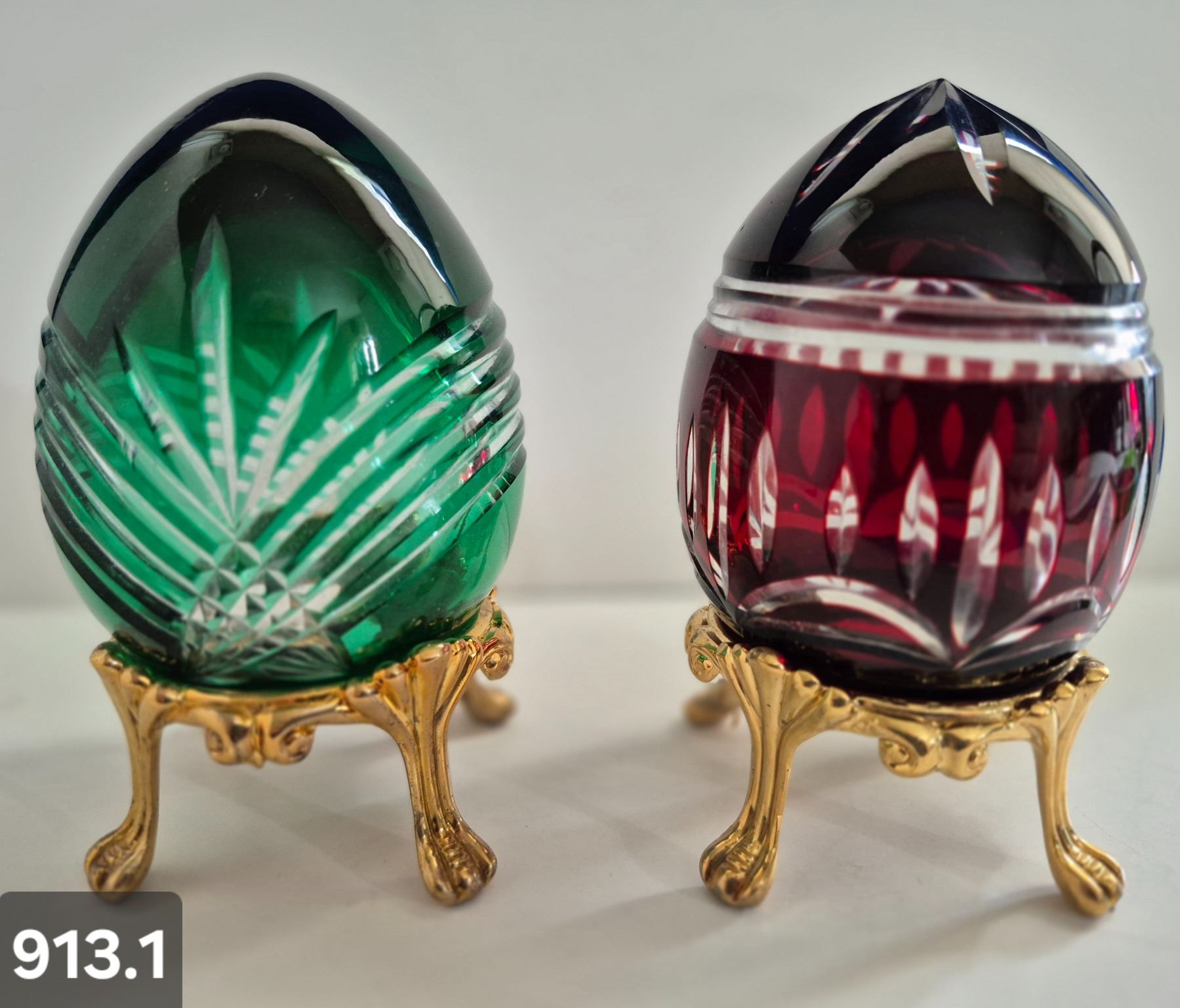 913. Pair of Bohemian cut glass MCM eggs - 24k gold-plated stand, from a large collection