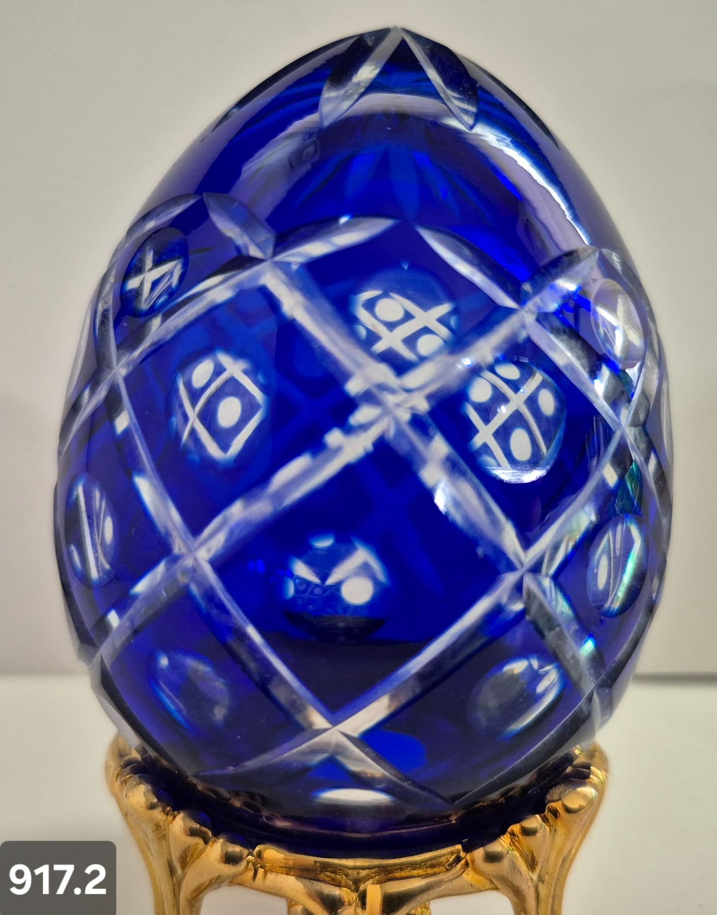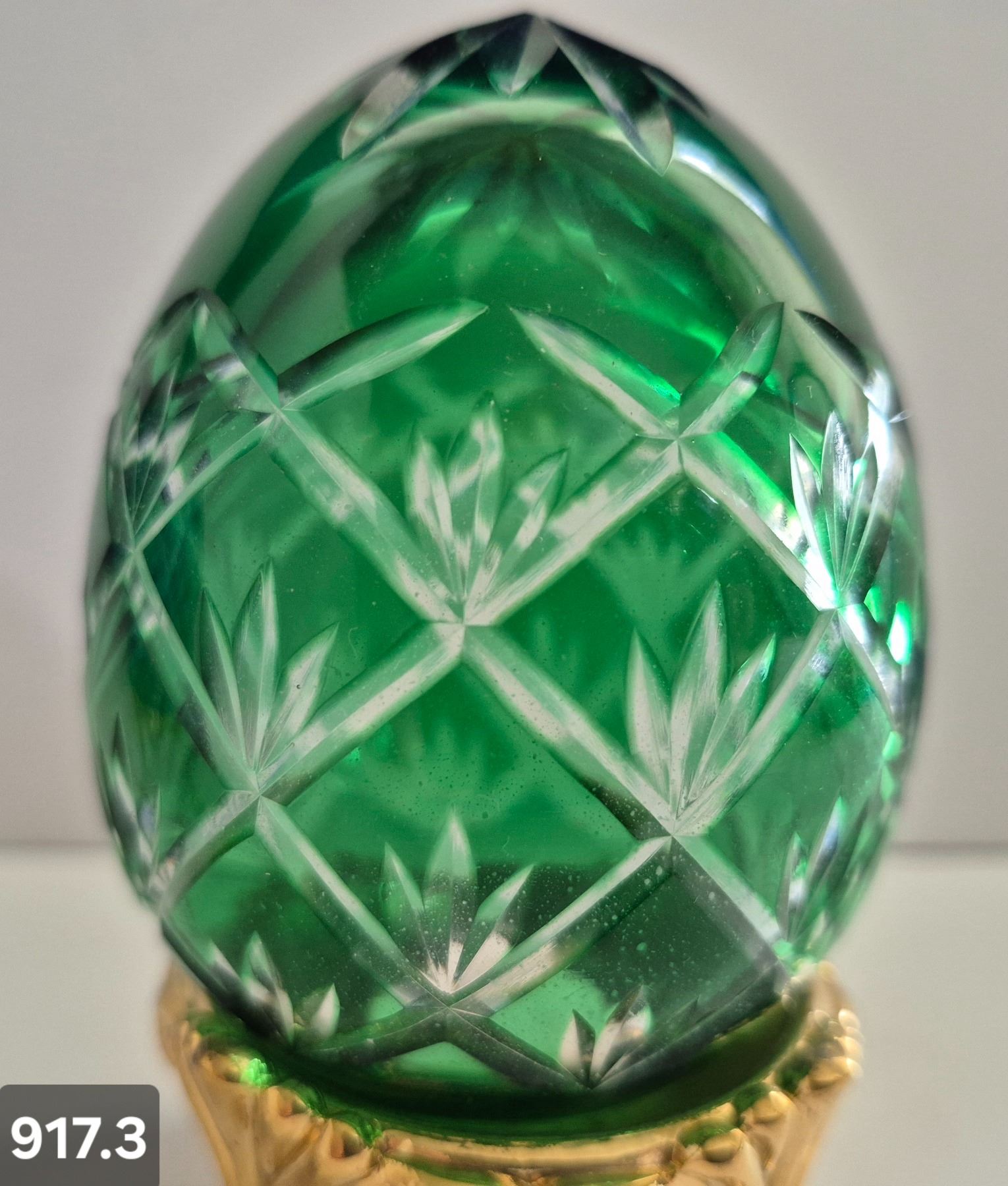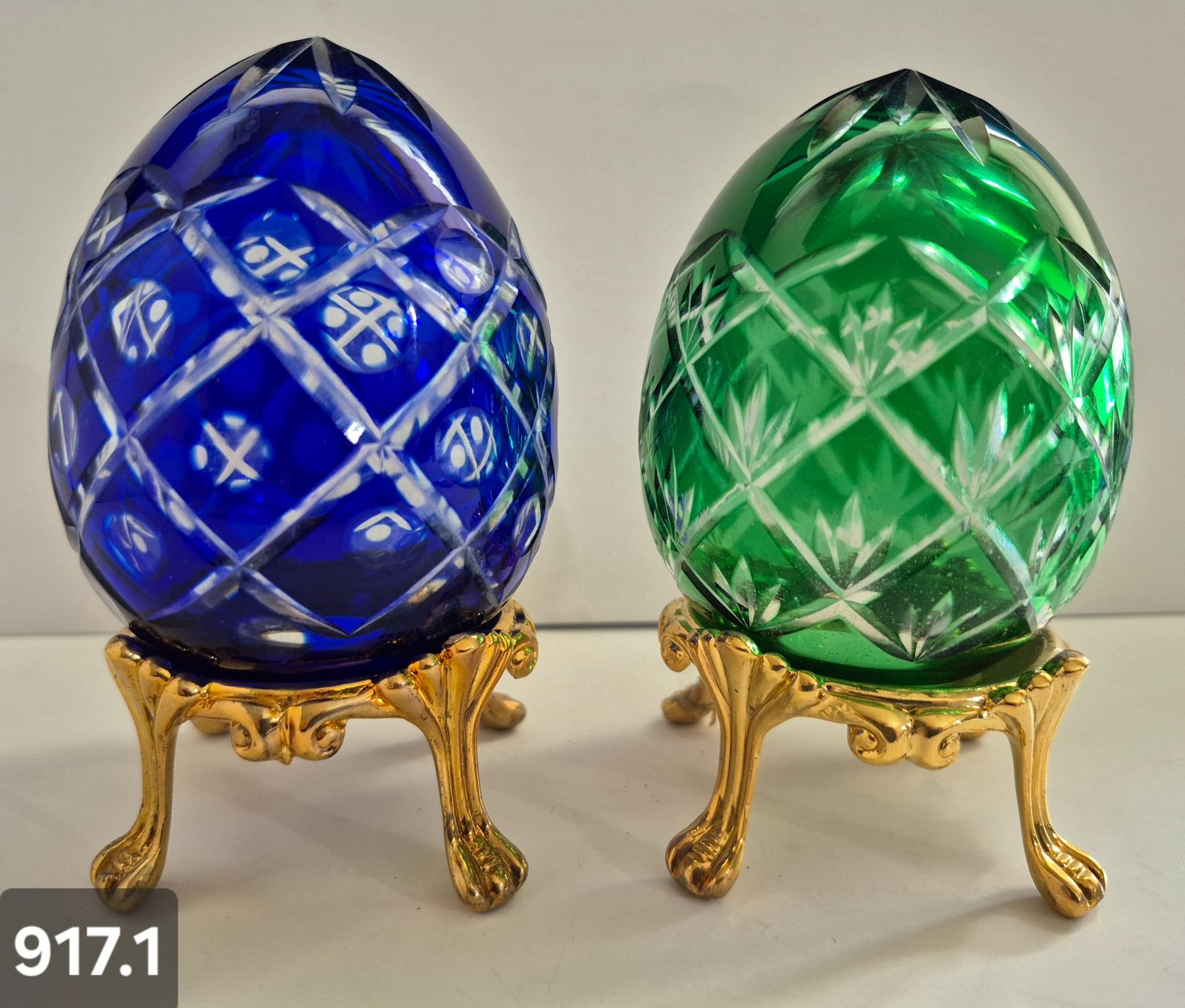 917. Pair of Bohemian cut glass MCM eggs - 24k gold-plated stand, from a large collection