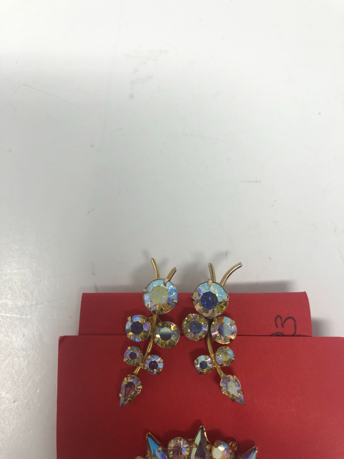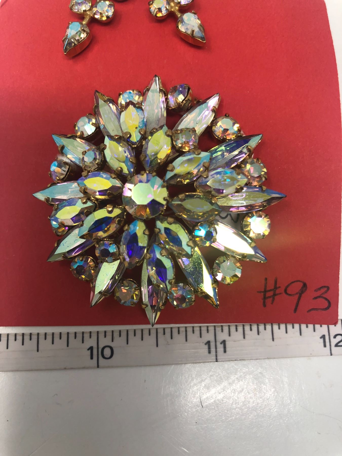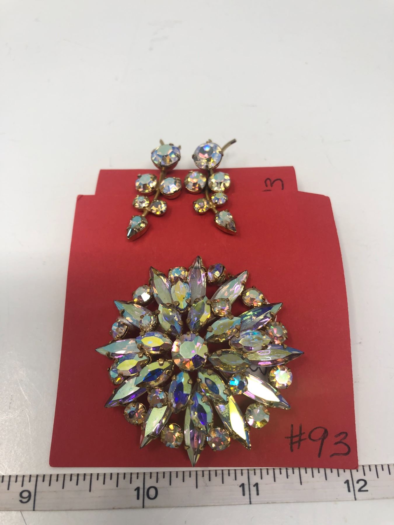 93. Aurora borealis broach and clip earring set