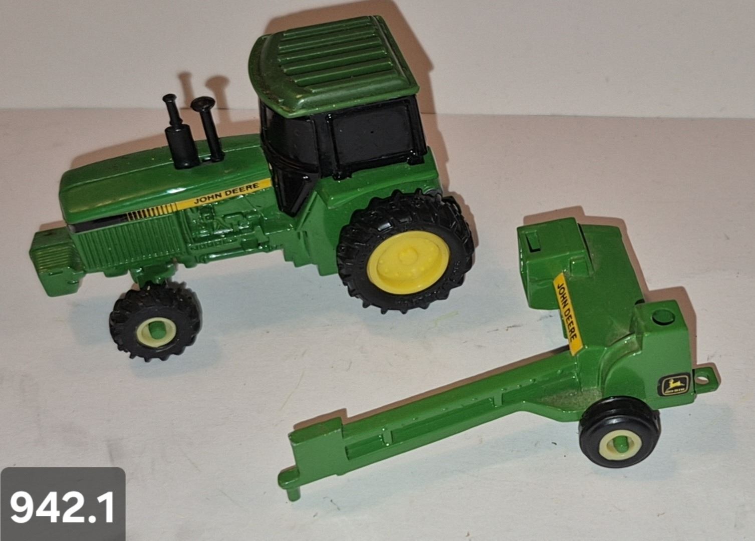 942. John Deere 1/64 tractor with 1 implement - mint condition, from the 80s or 90s. (Diecast Metal)