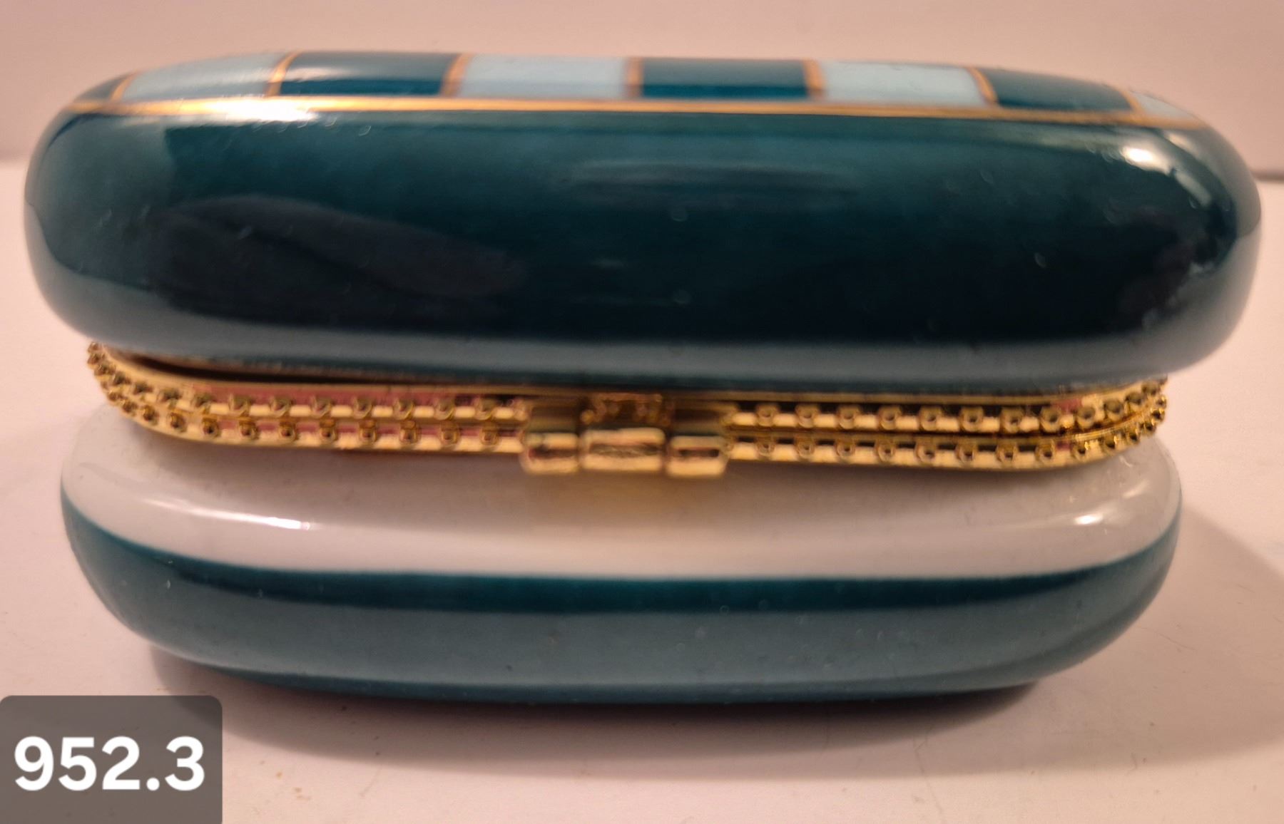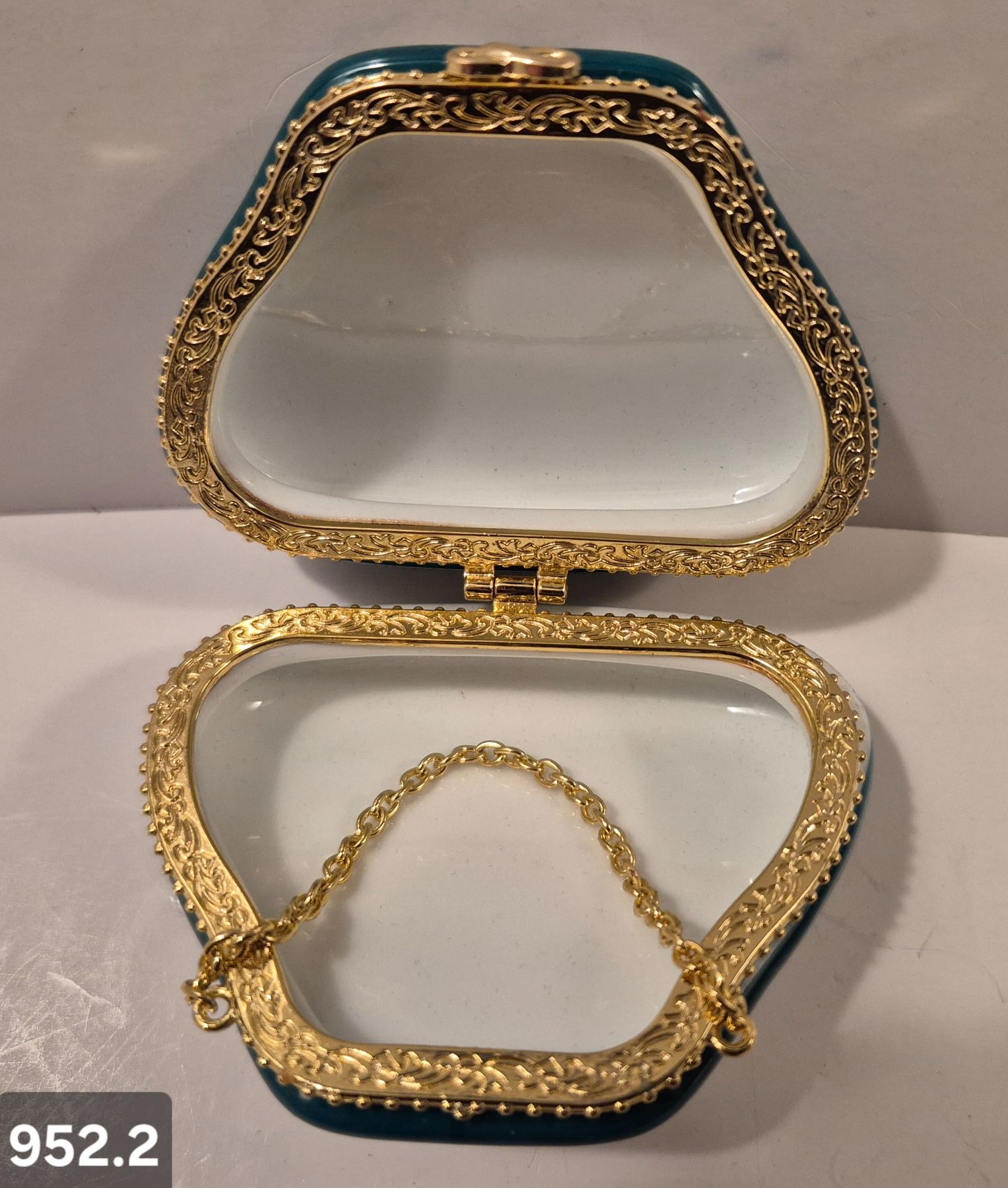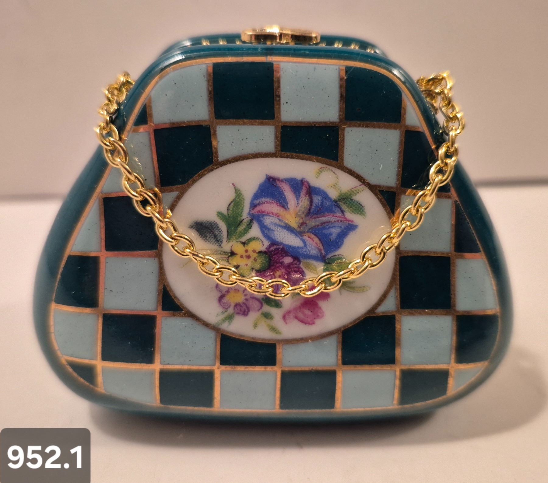 952. Vintage miniature porcelain purse (handbag), approx. 2 1/2 by 3 1/4 inches, 22k gold-plated trim