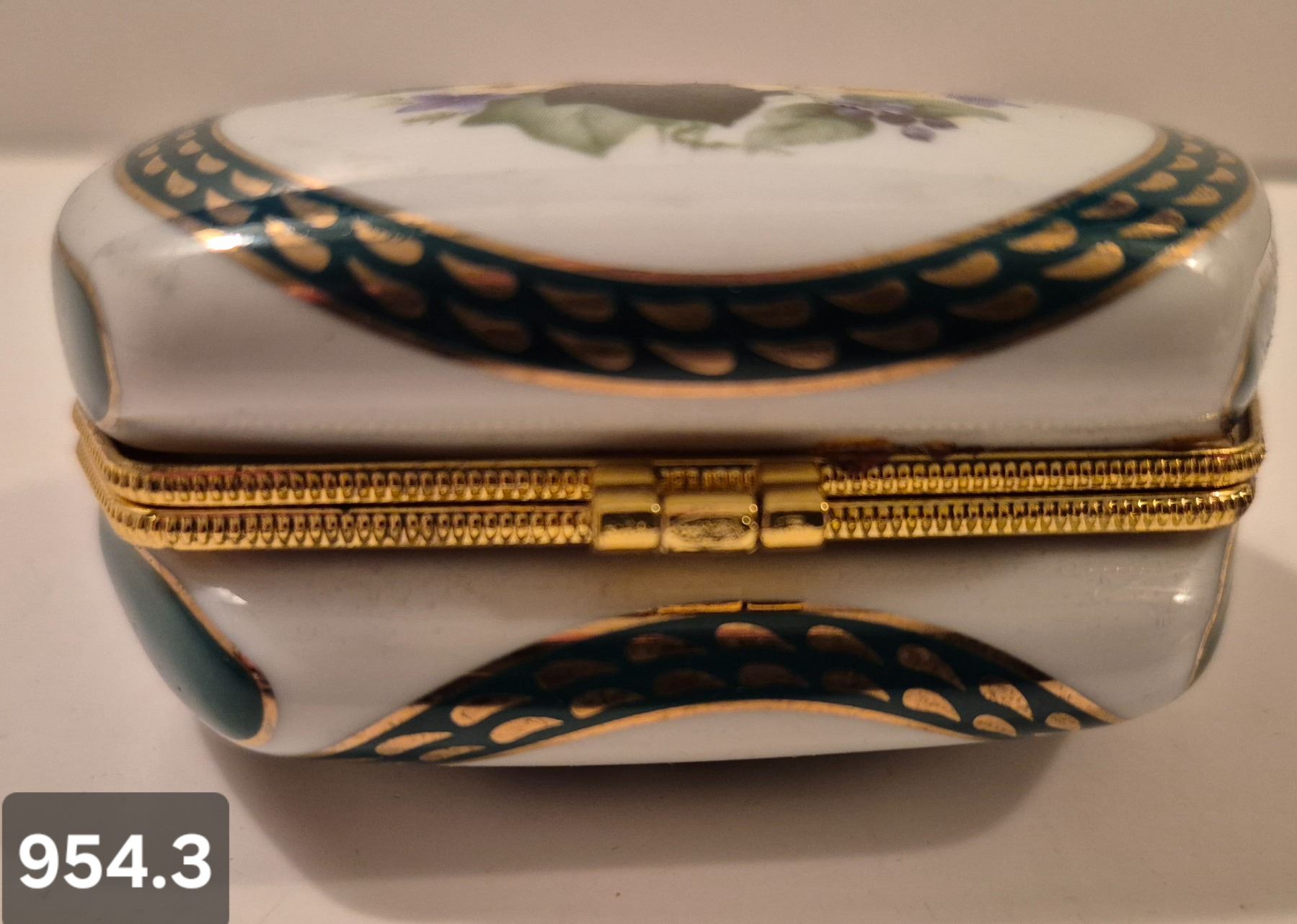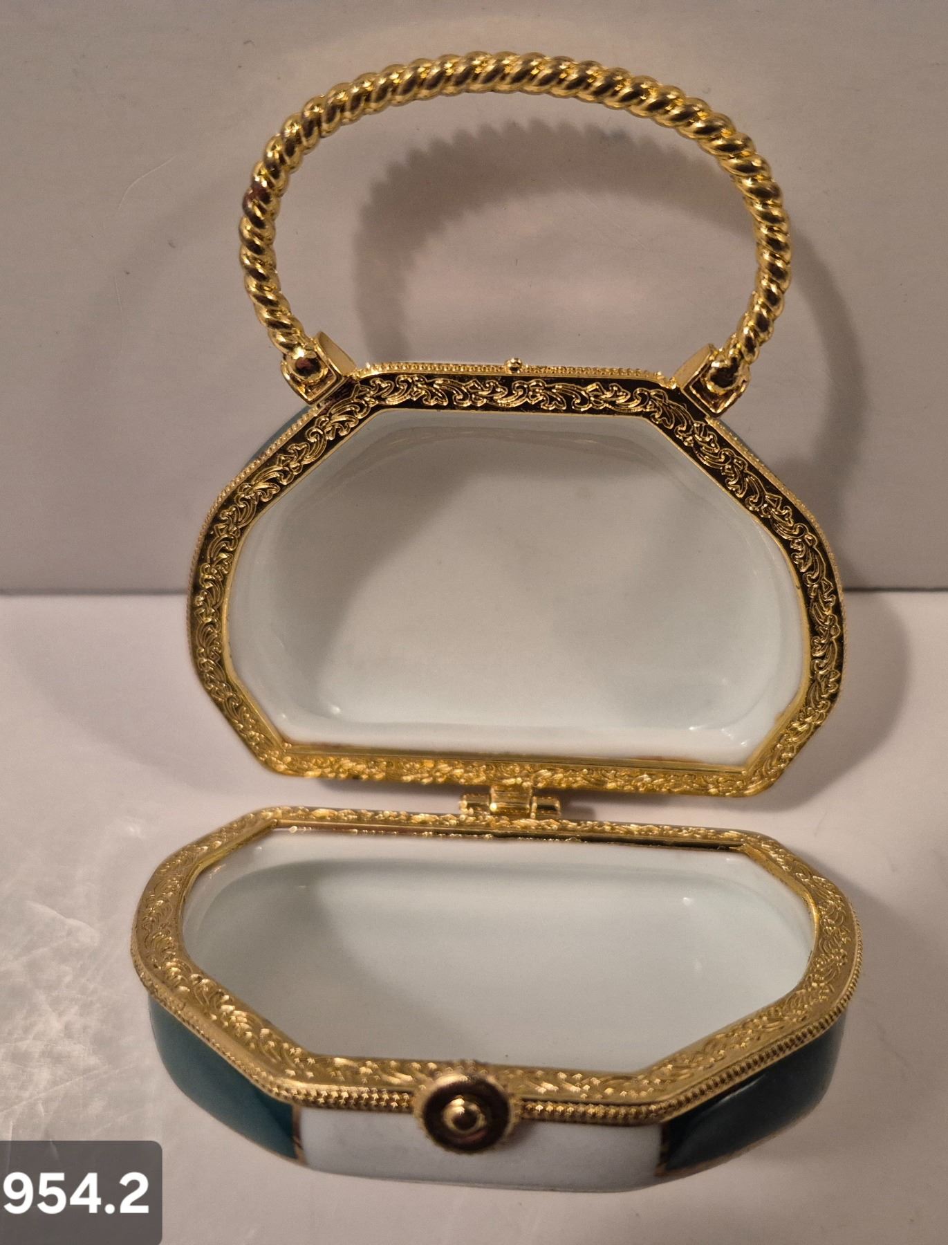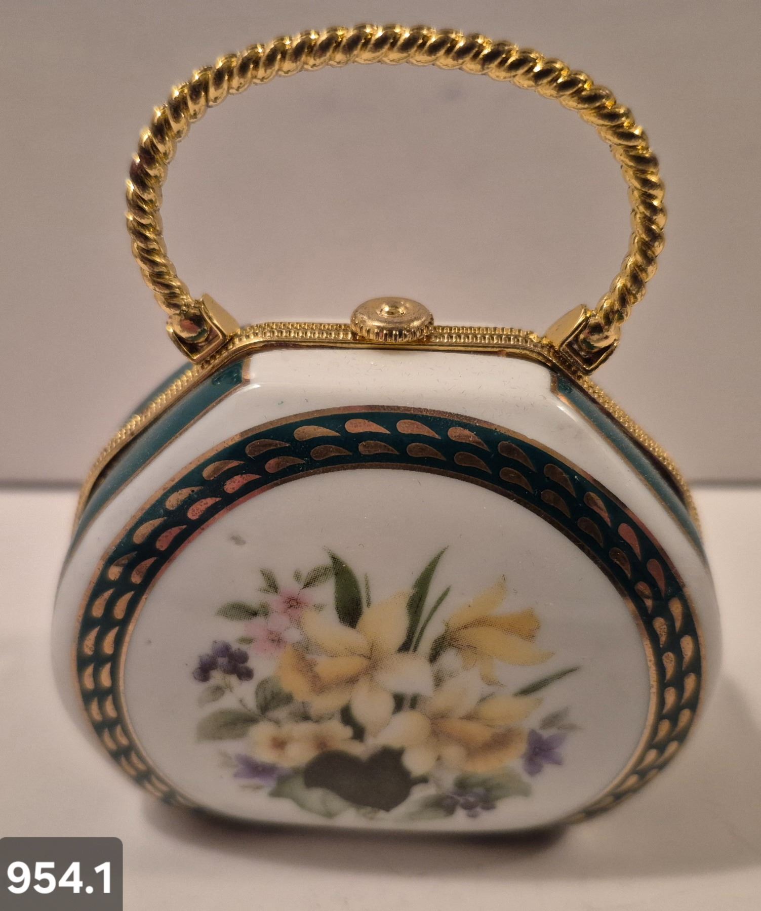 954. Vintage miniature porcelain purse (handbag), approx. 3 1/2 by 3 inches, 22k gold-plated trim