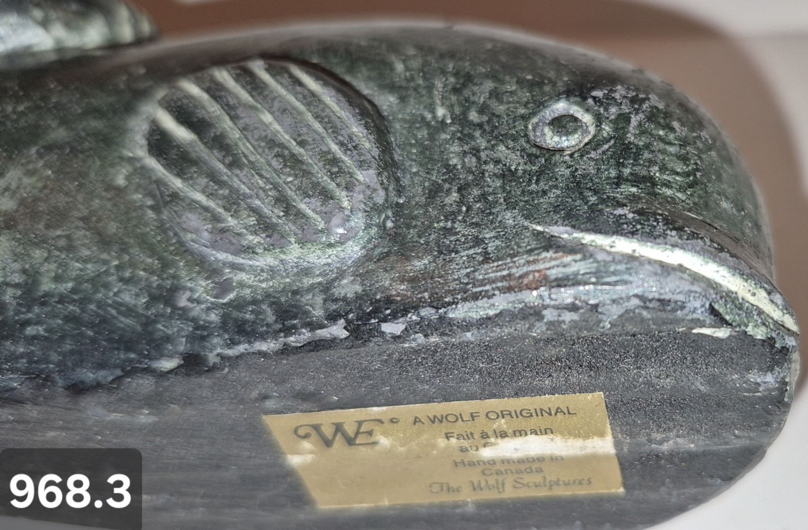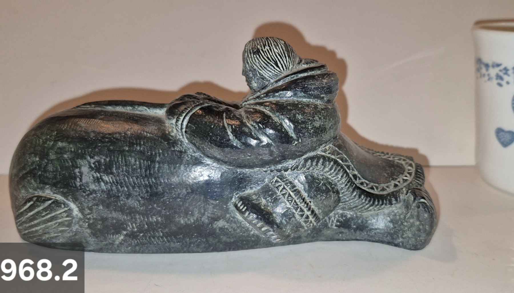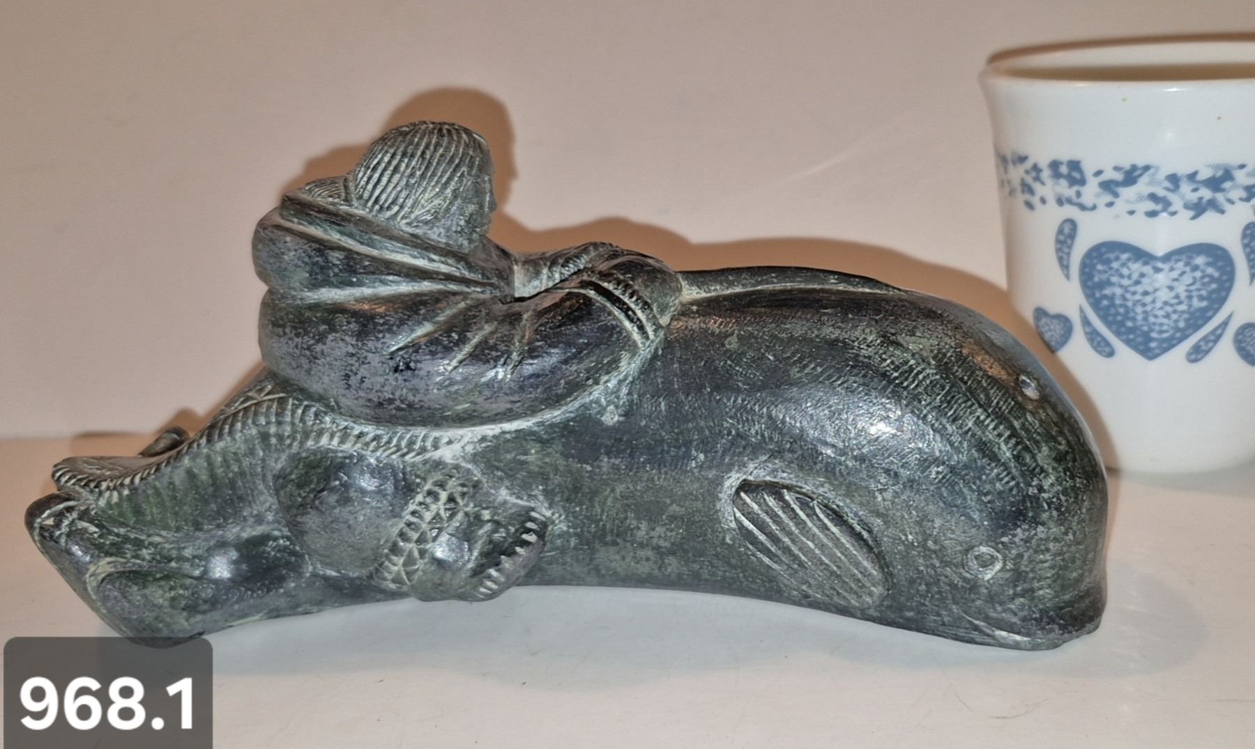 968. Inuit carving - large whale 8 inches long, being ridden by eskimo, excellent condition