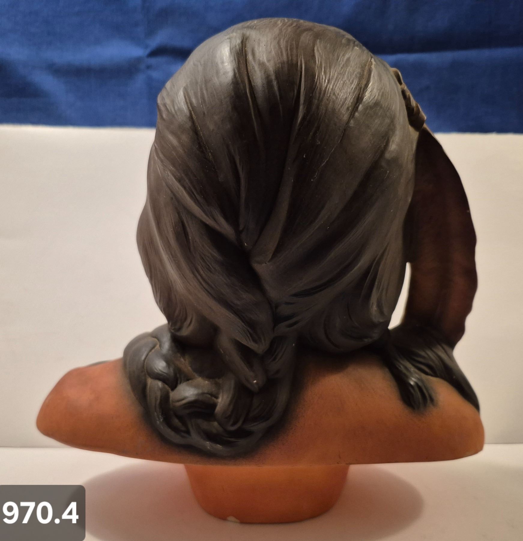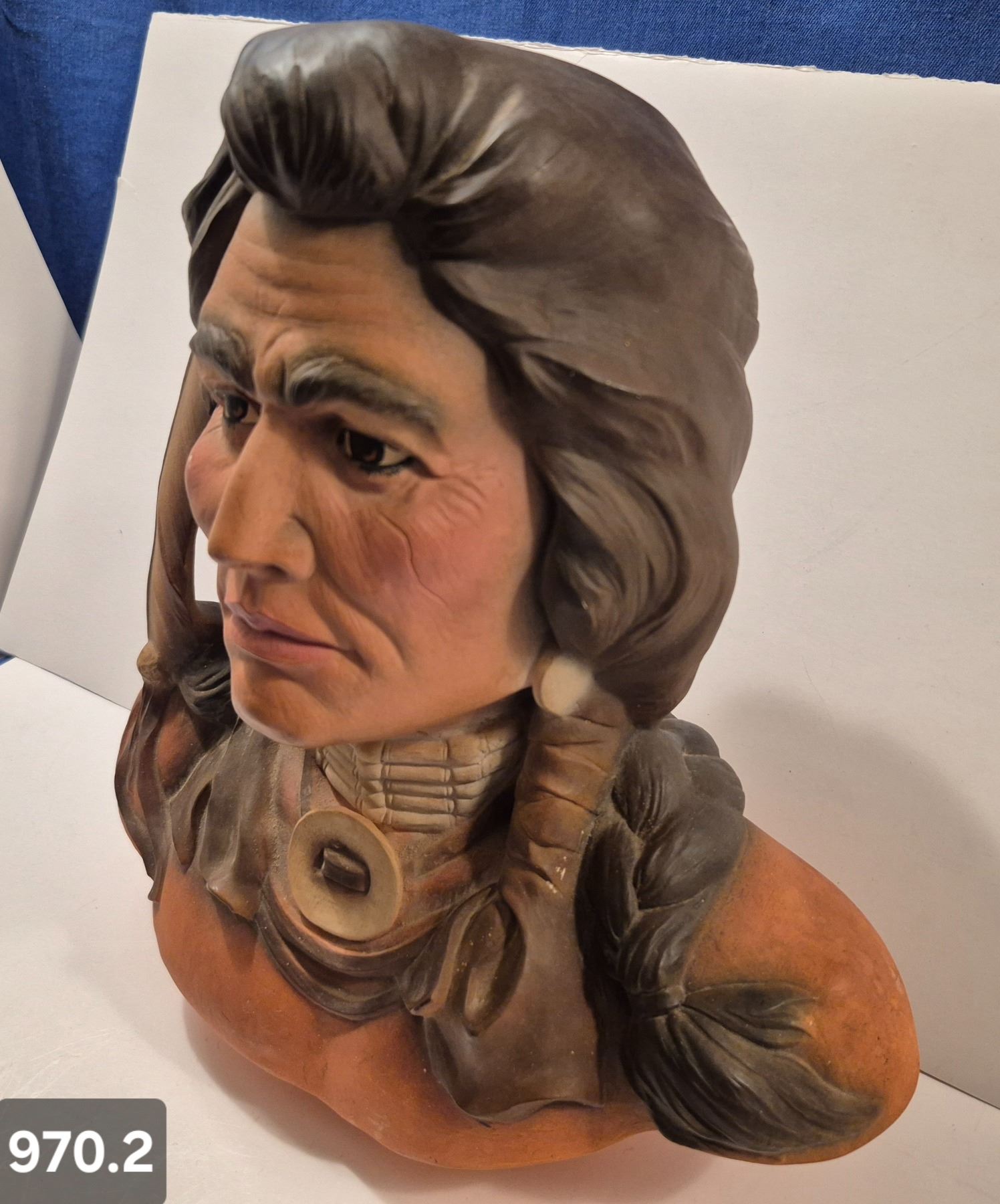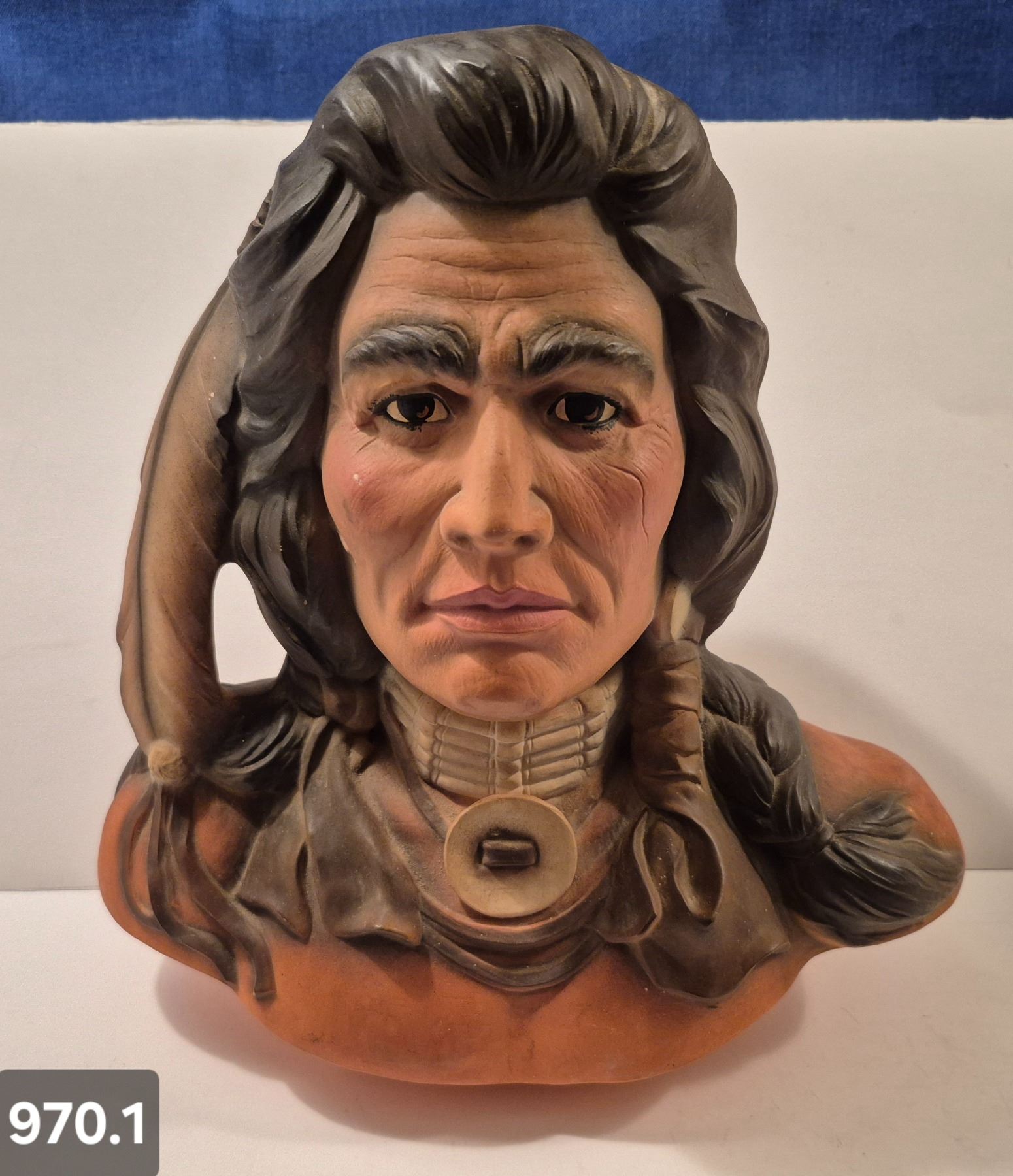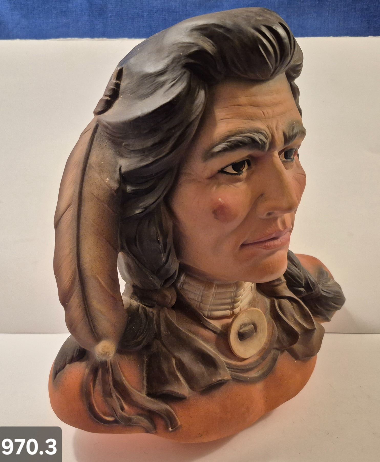 970. Large Native American bust of an Indian warrior, 11 1/4 inches tall, 2 small flakes on the rear of the base