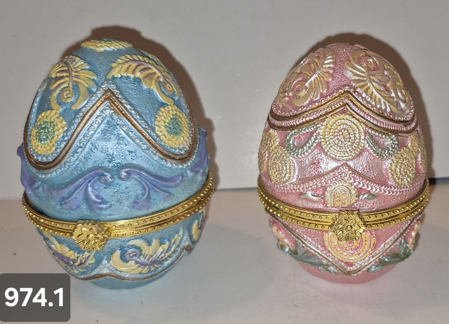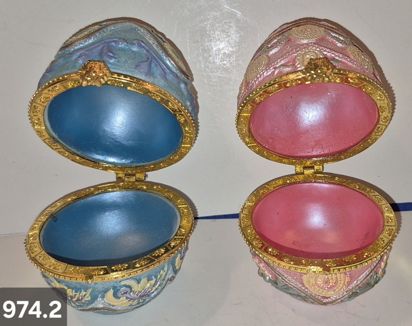 974. Pair of pottery decorated egg trinket boxes, approx. 3 1/2 inches tall
