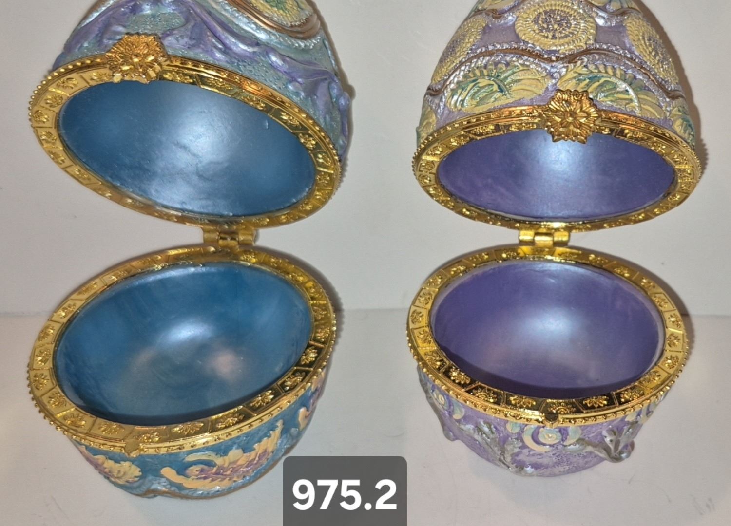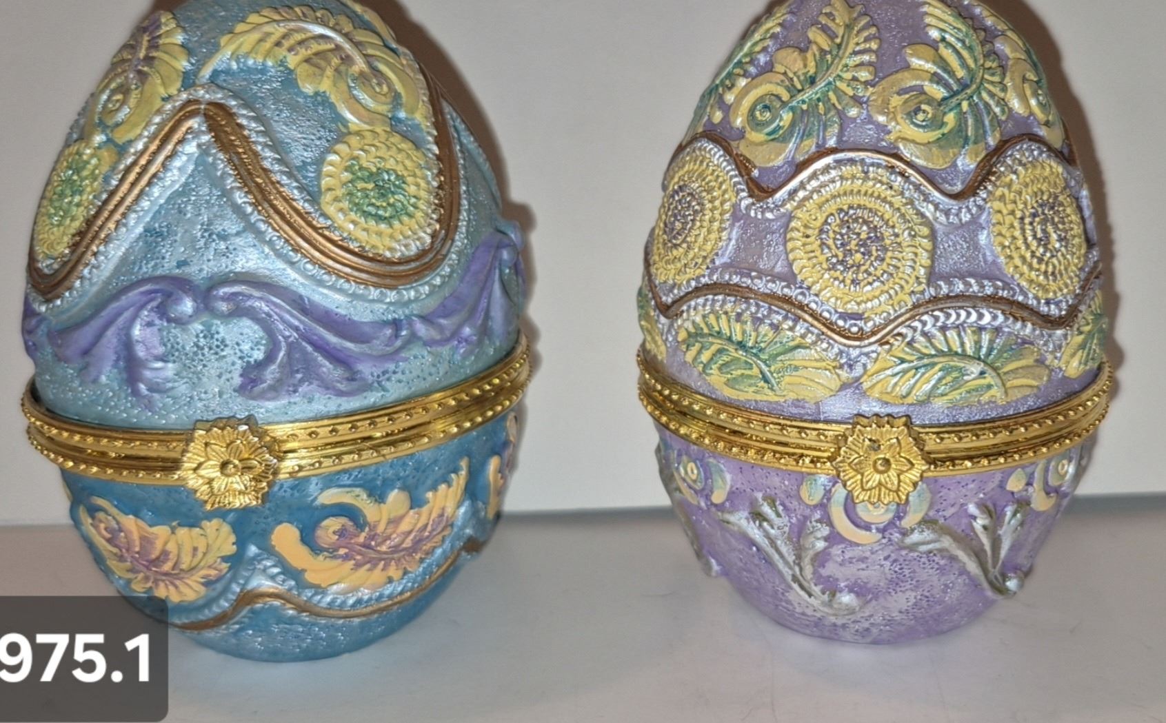 975. Pair of pottery decorated egg trinket boxes, approx. 3 1/2 inches tall