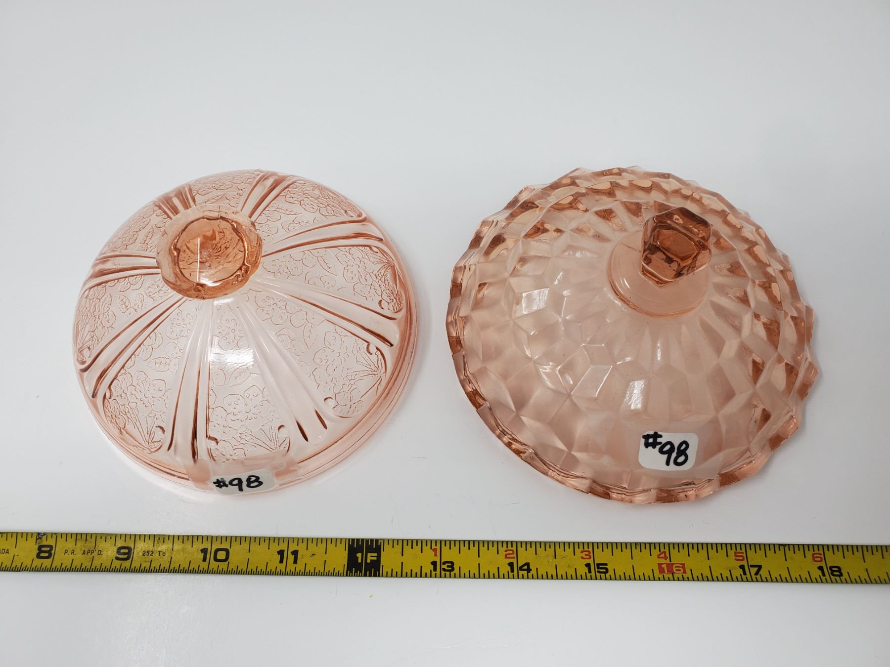98. Pink depression glass butter lids, “Windsor” and “Cherry Blossom”